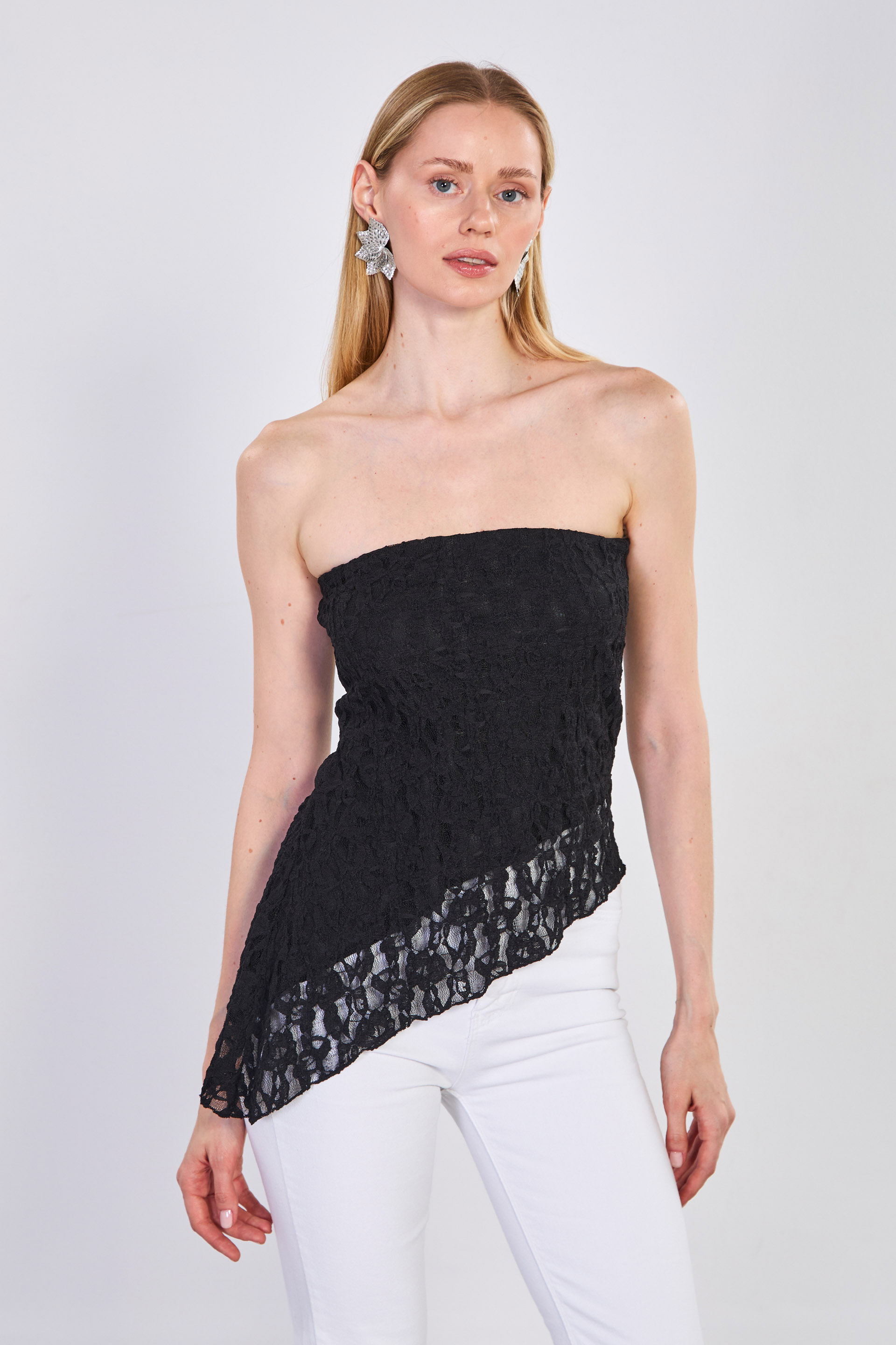 Kadın Dantelli Asimetrik Kesim Straplez Bluz - Siyah