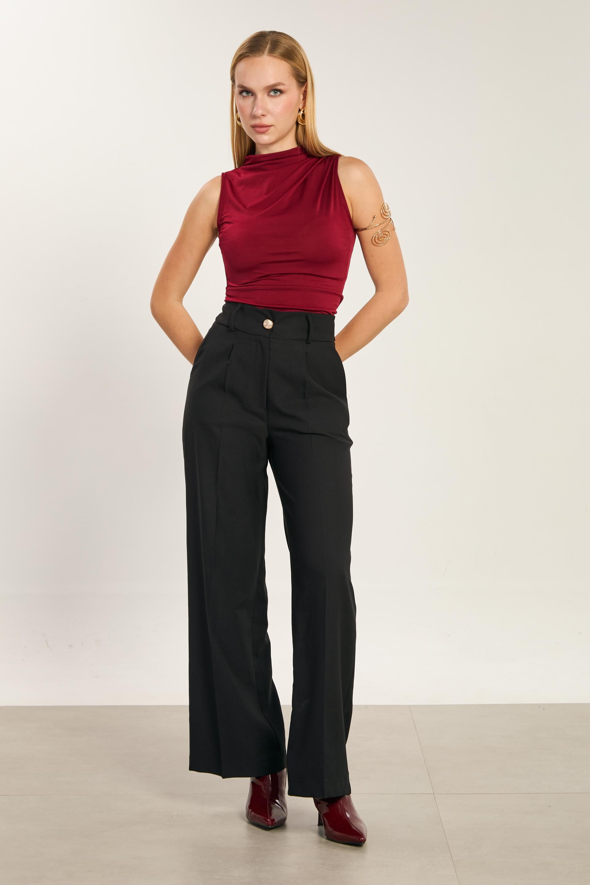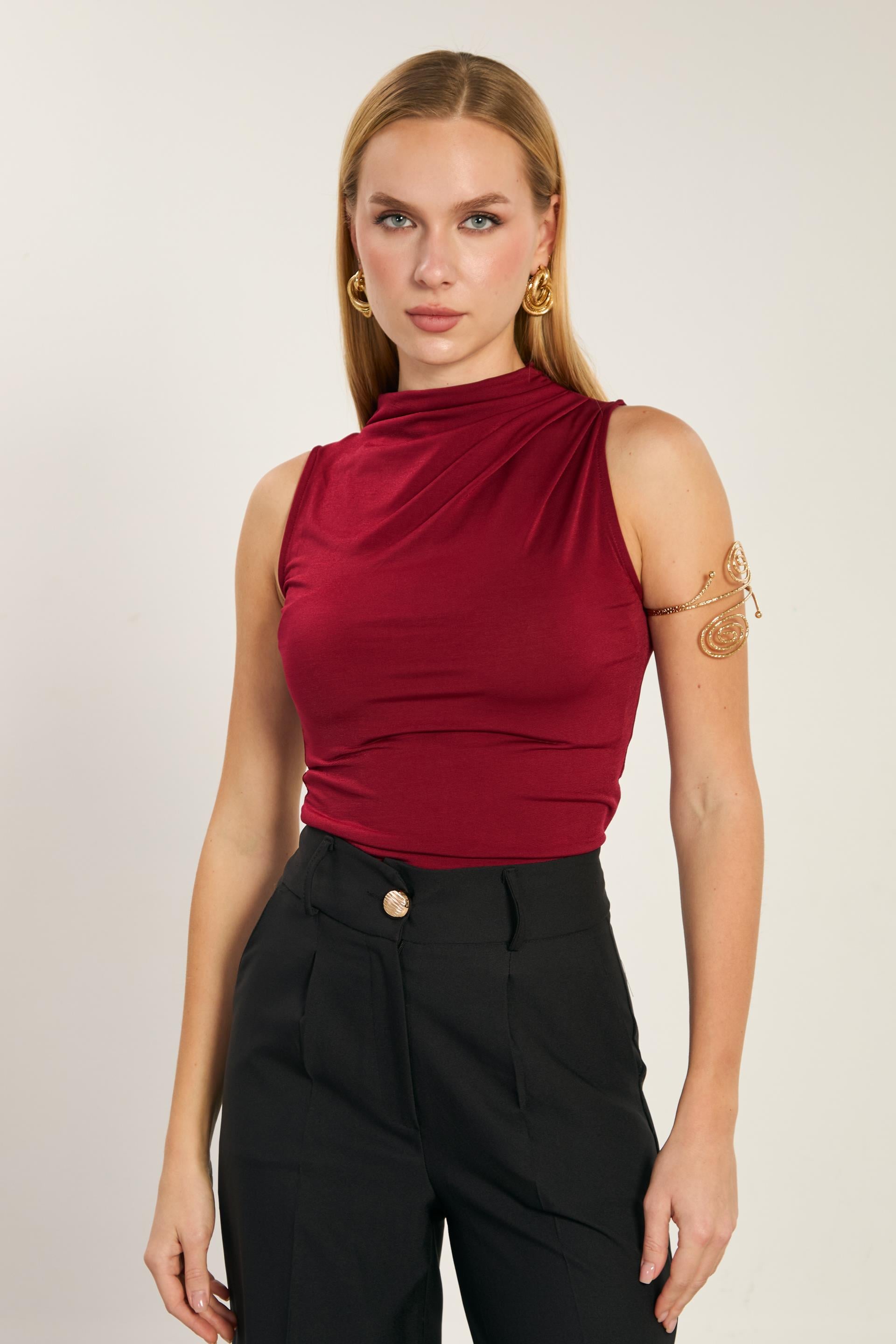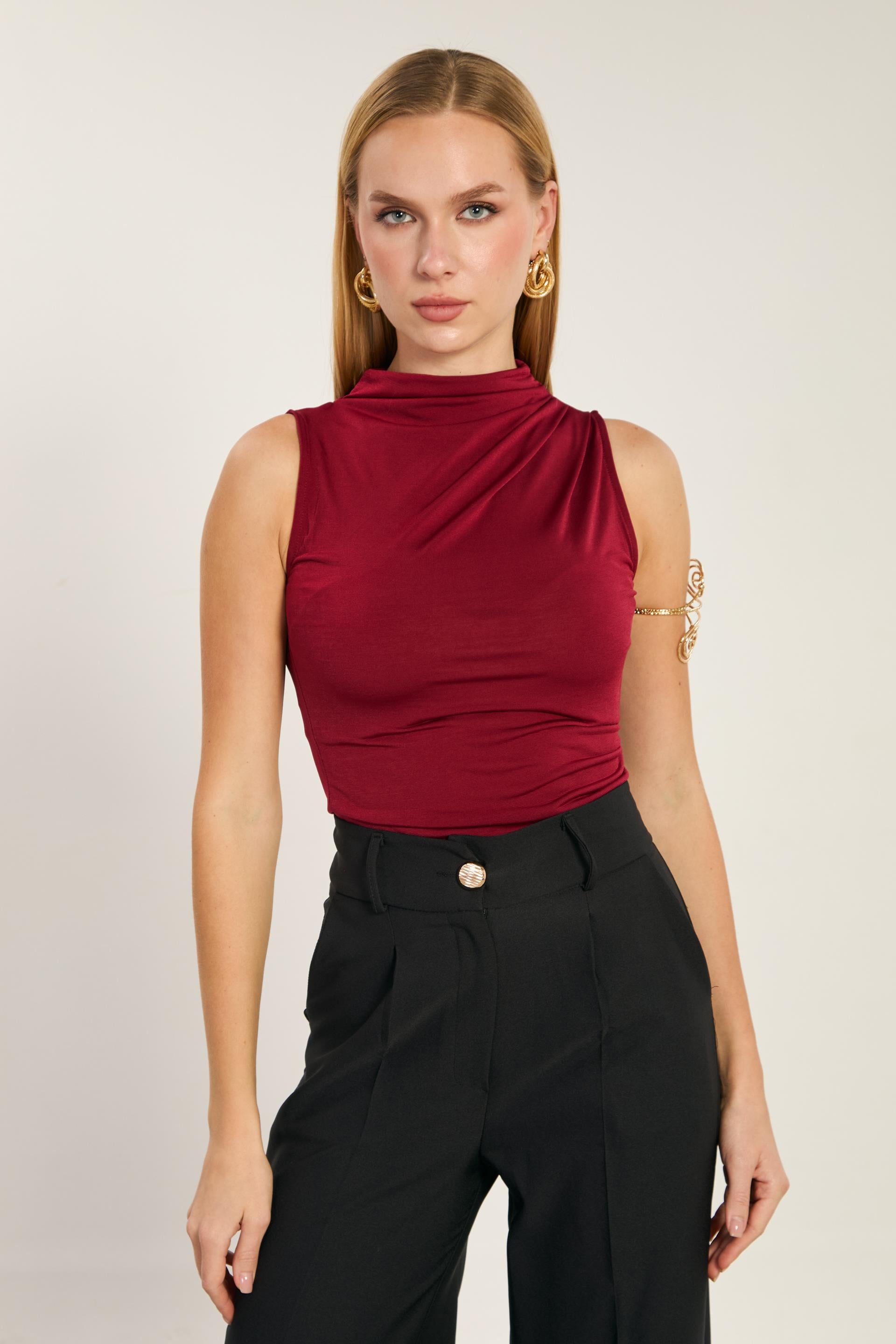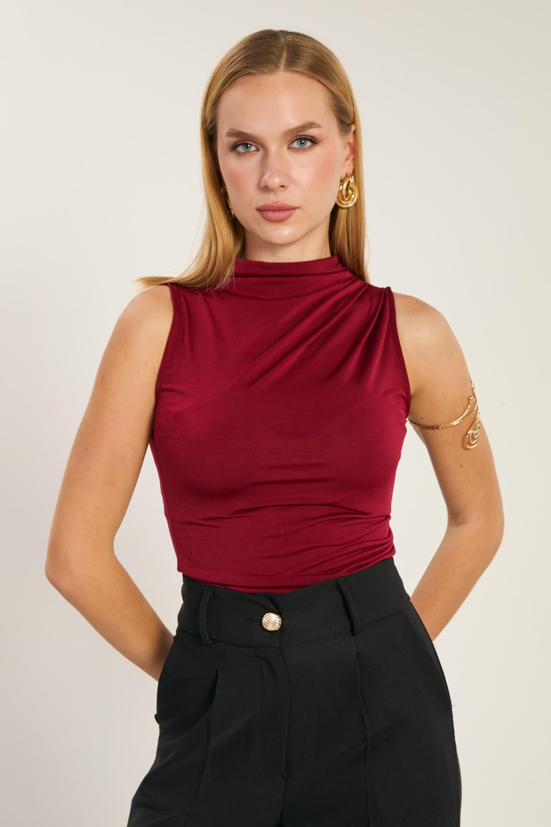 Kadın Degaje Yaka Kolsuz Bluz - Bordo