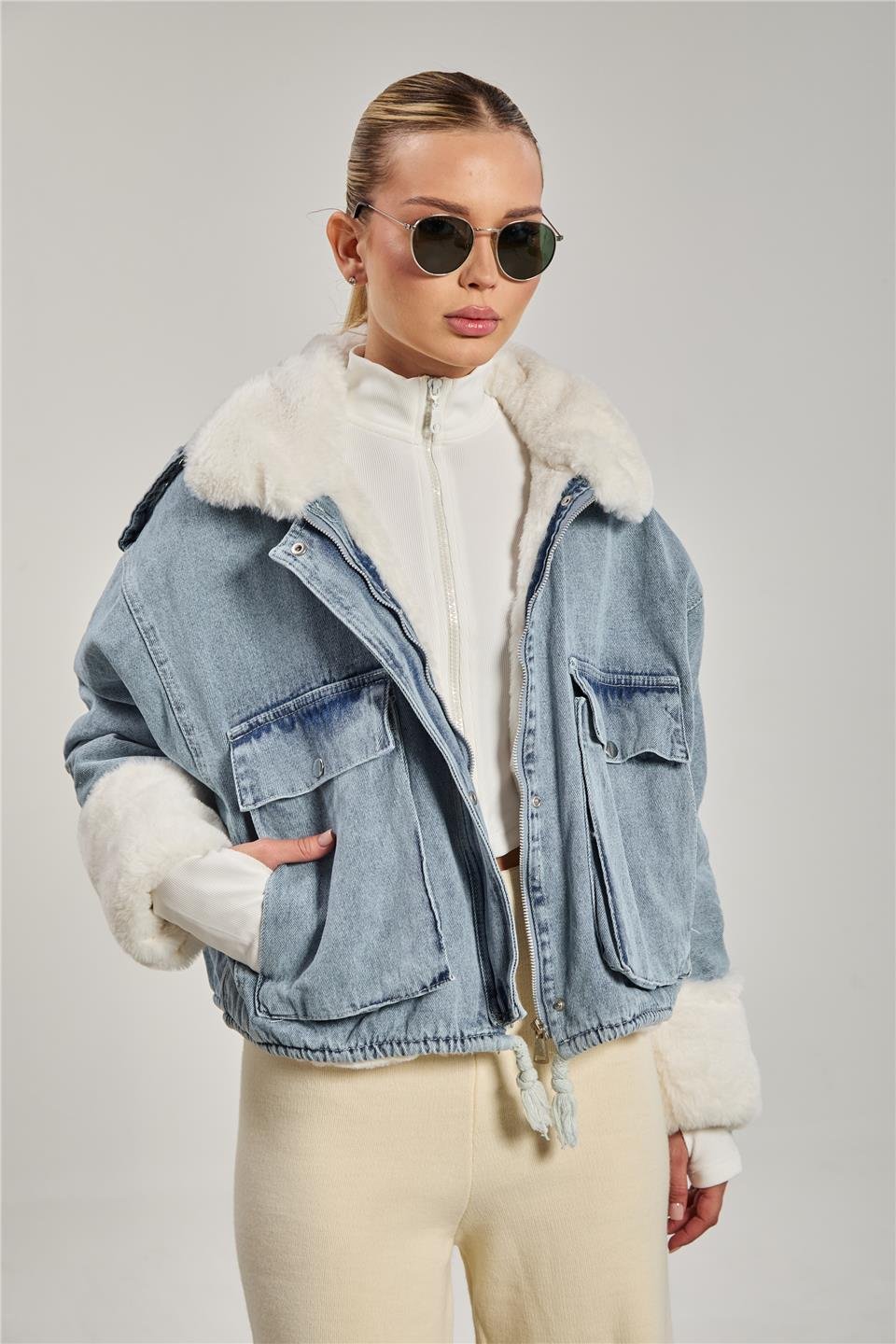 Kadın Denim İçi Kürk Detay Mont - Ekru