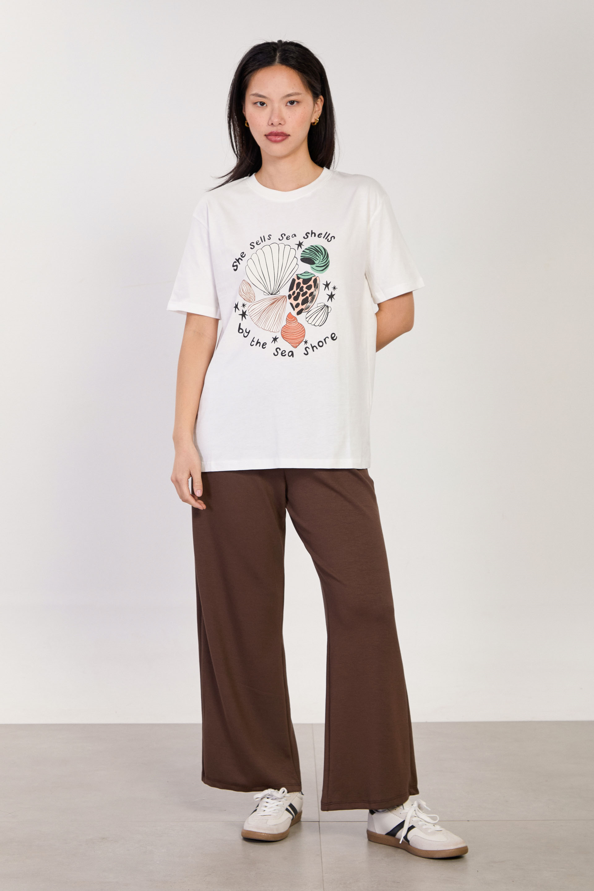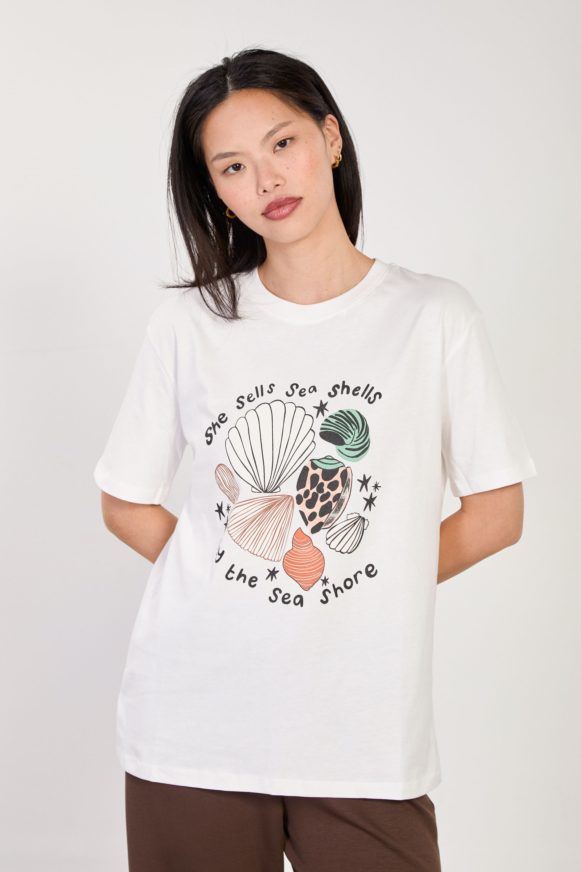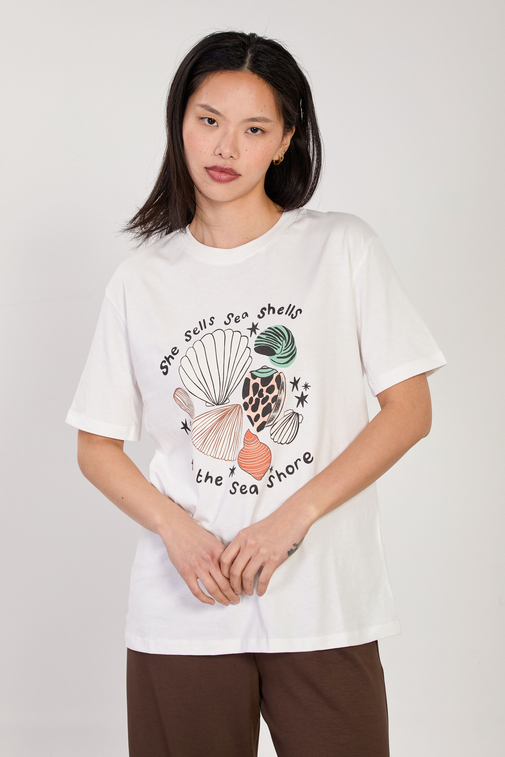 Kadın Deniz Kabuğu Baskılı T-Shirt - Ekru