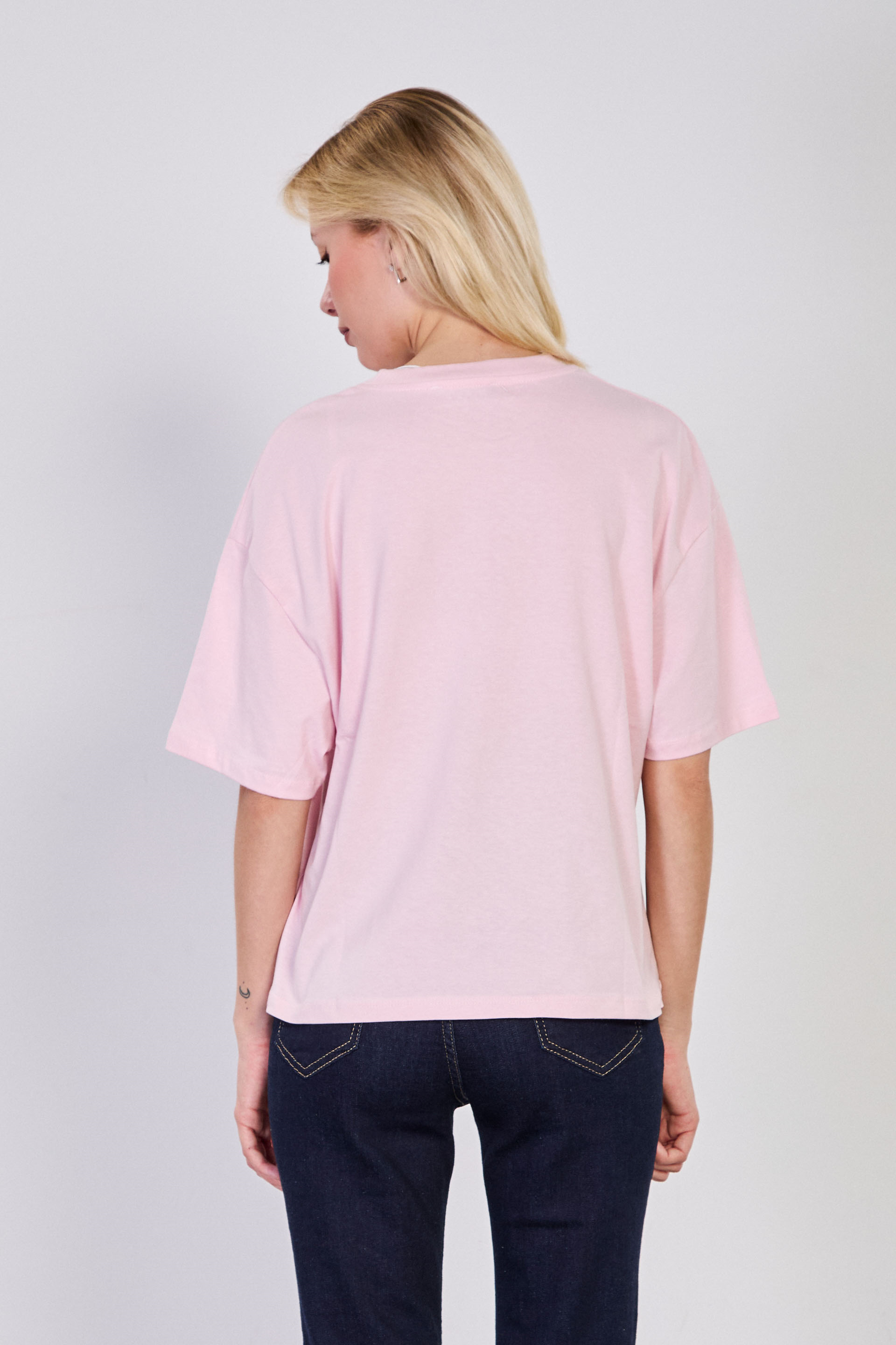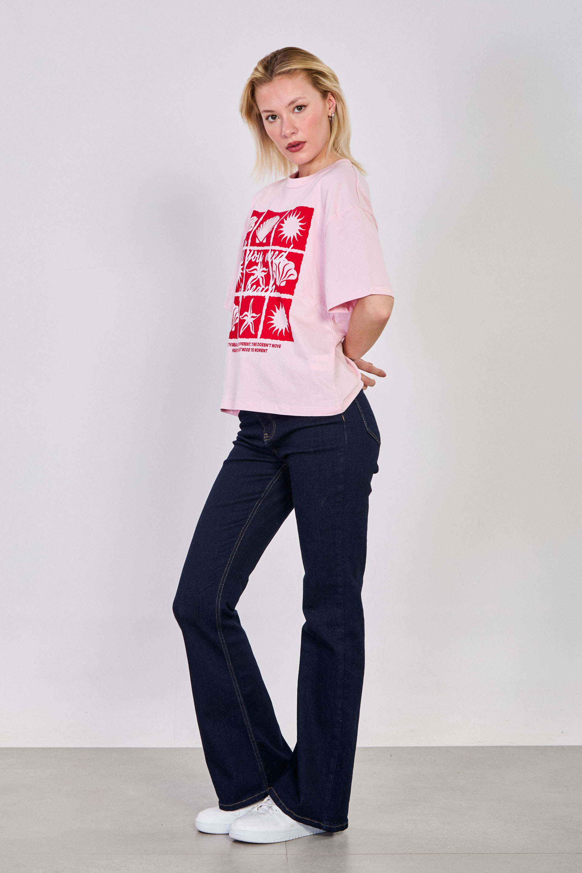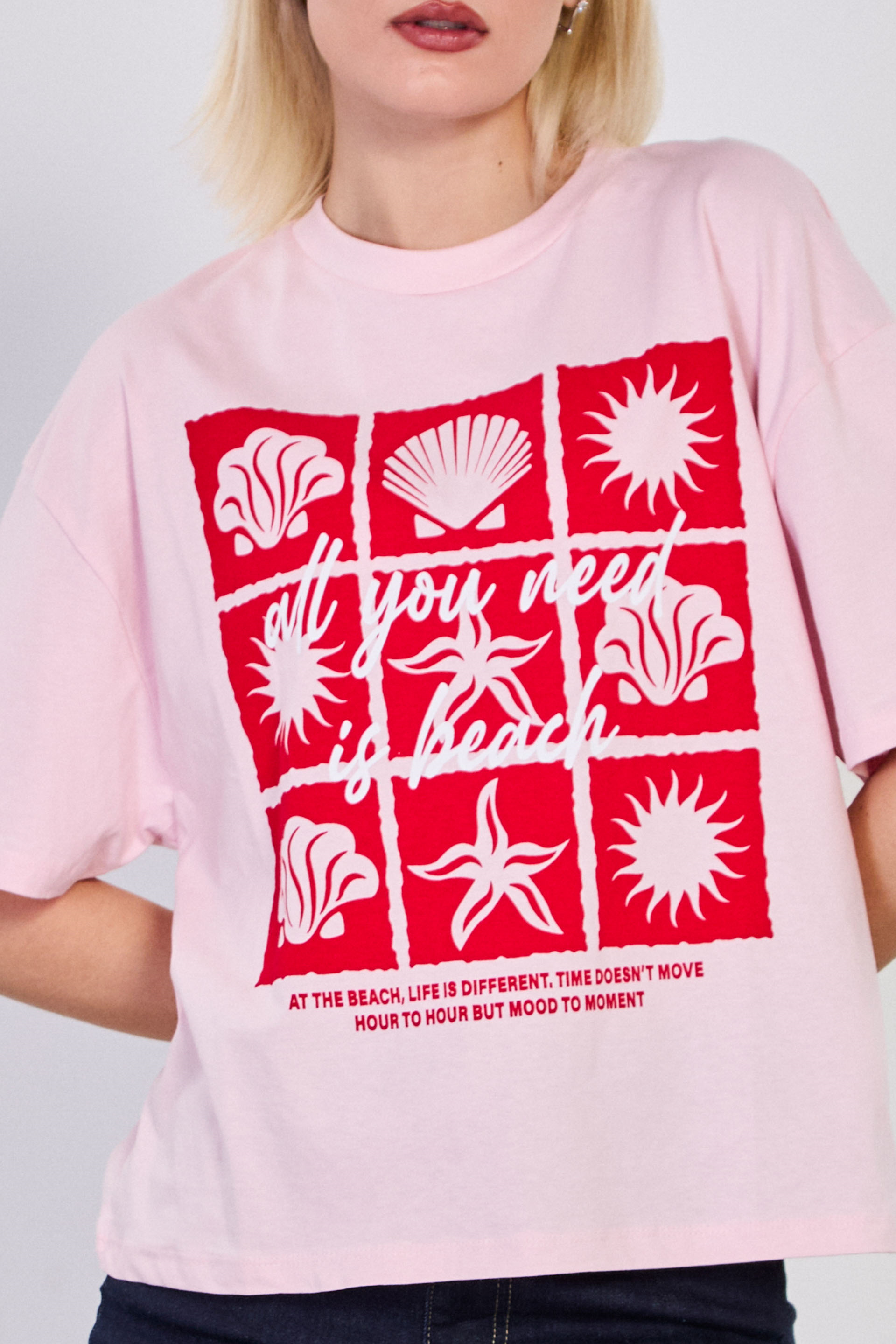 Kadın Deniz Temalı Oversize T-Shirt - Pembe/Kırmızı