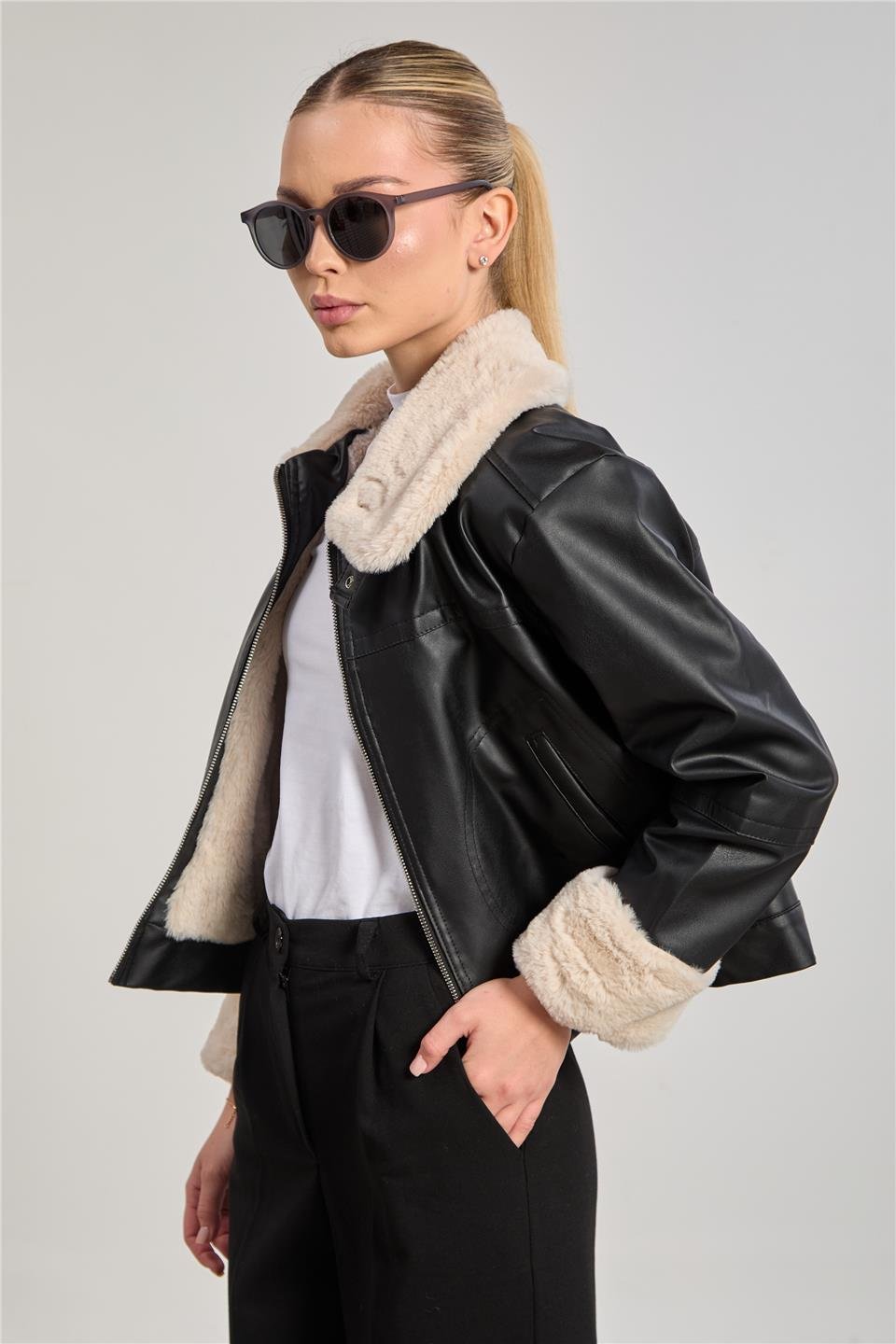 Kadın Deri Görünümlü Kısa Ceket - Siyah