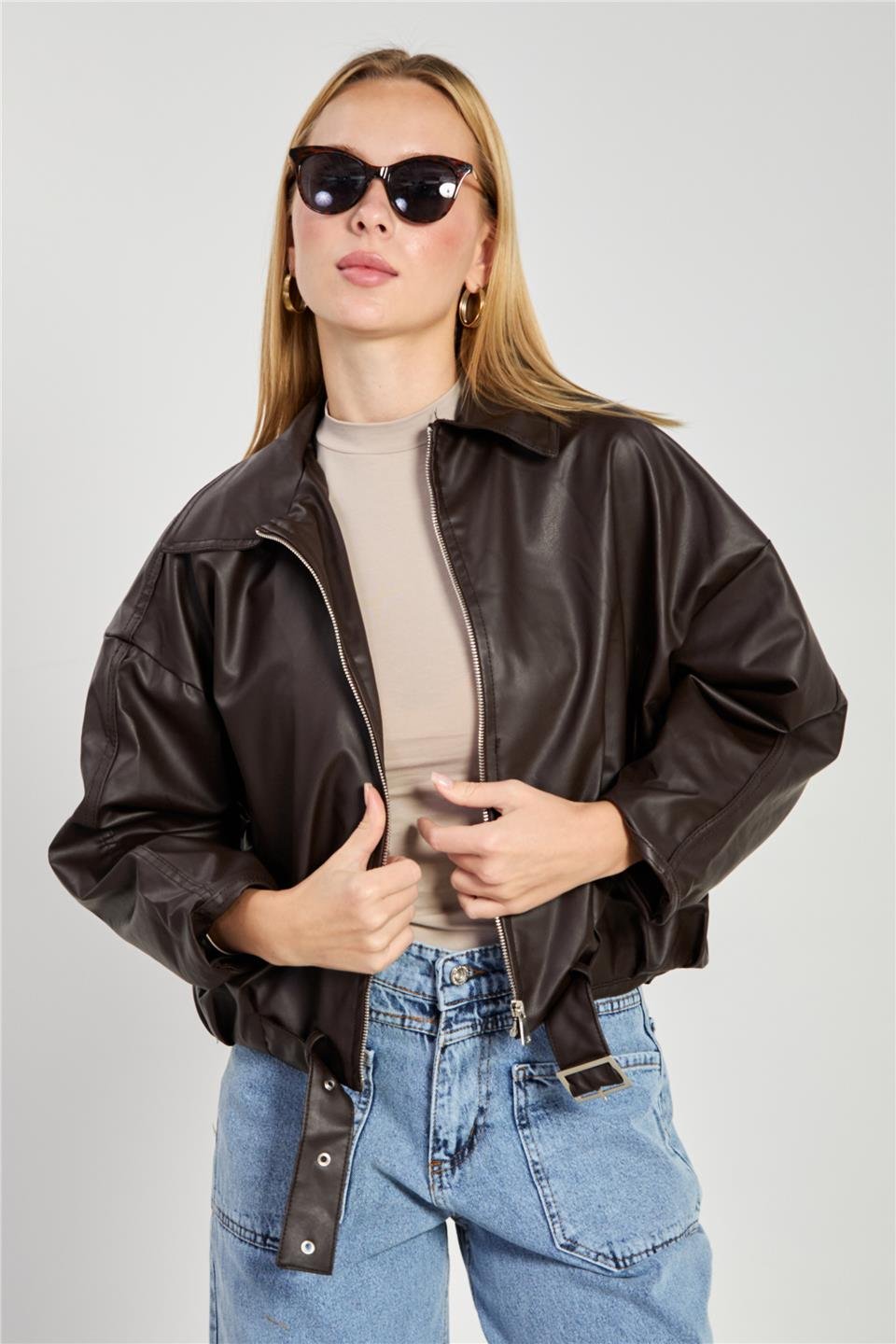 Kadın Deri Görünümlü Oversize Ceket - Acı Kahve