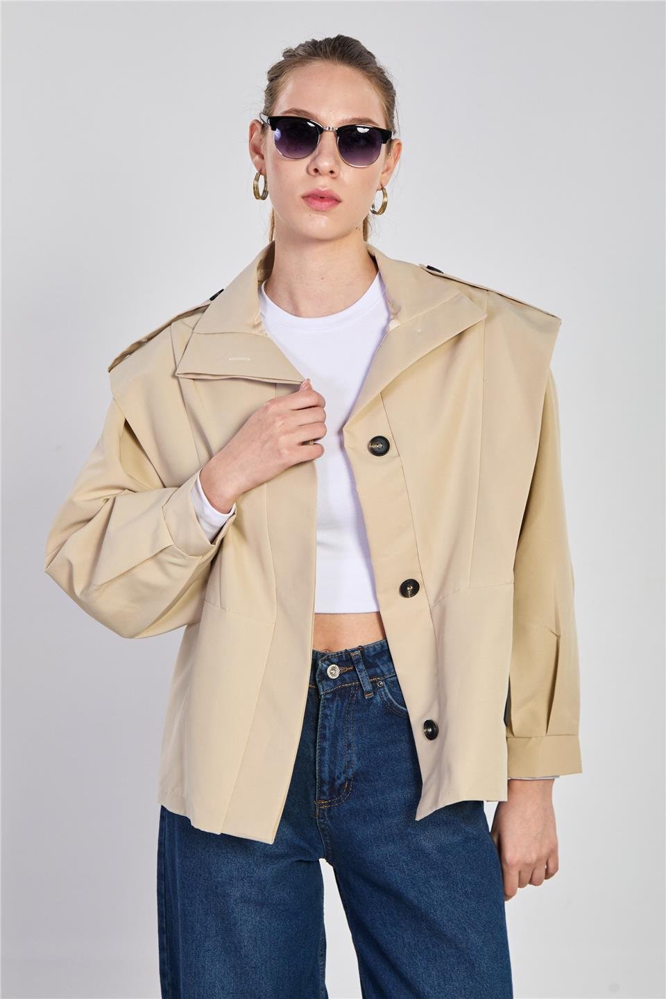Kadın Dik Yaka Beli Kemerli Kısa Trençkot - Taş