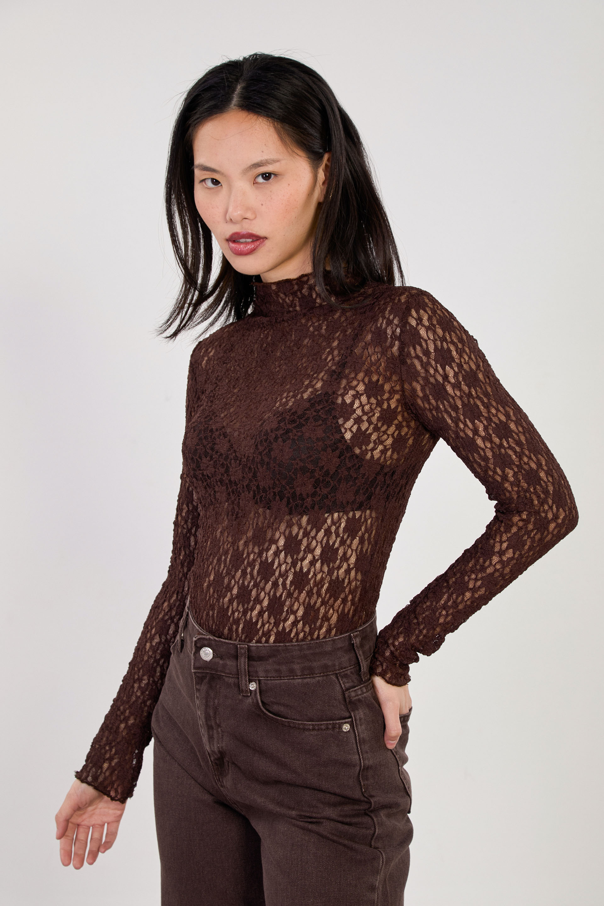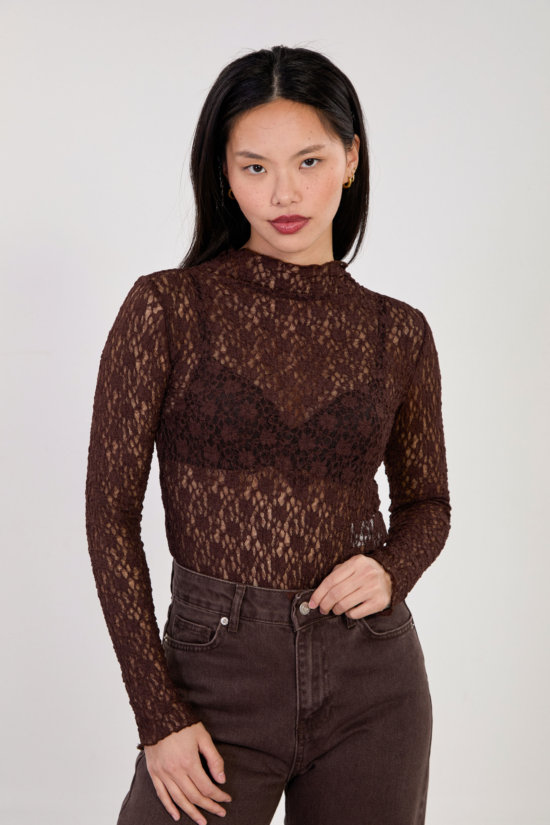 Kadın Dik Yaka Dantelli Uzun Kol Bluz - Acı Kahve