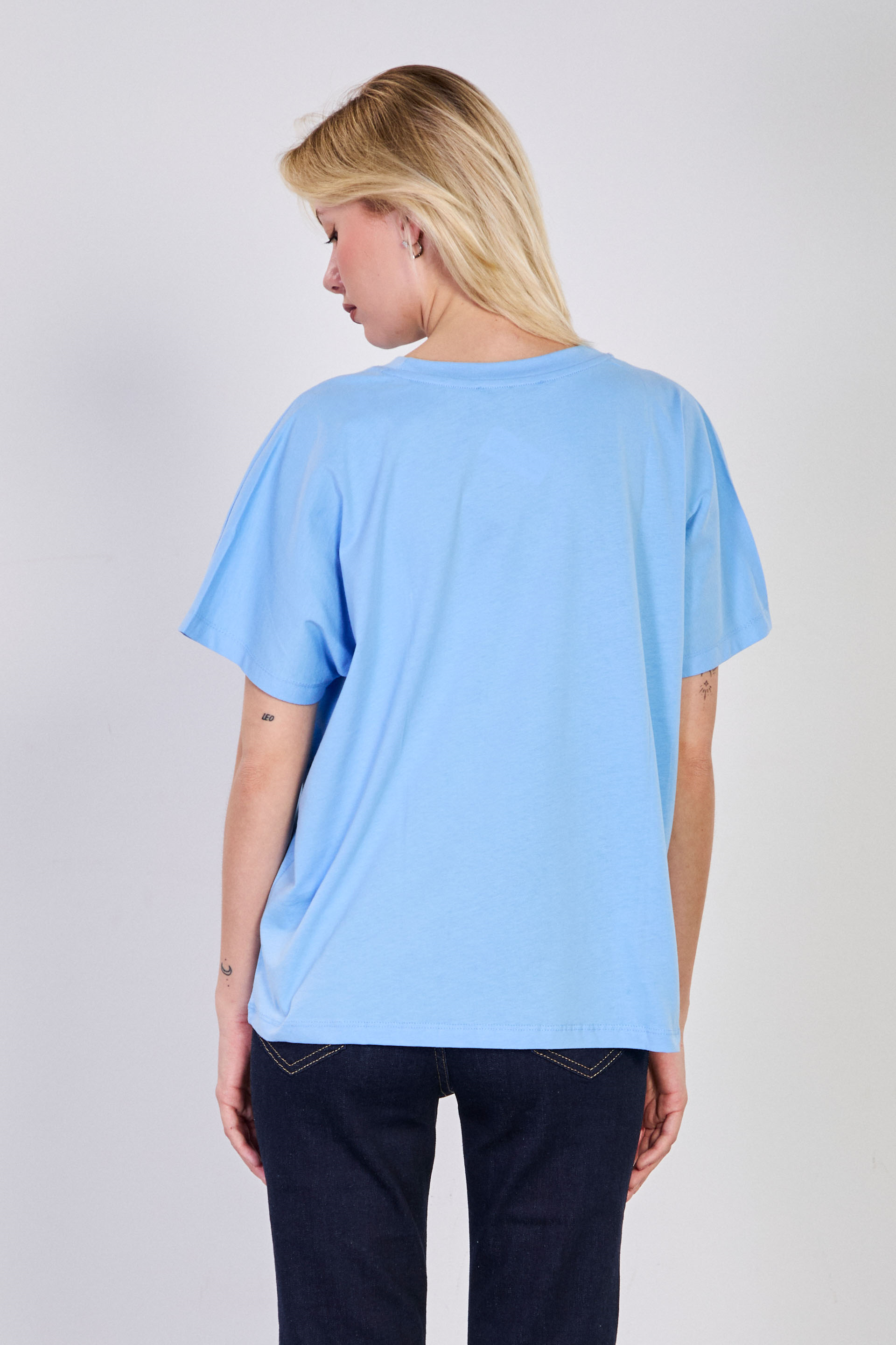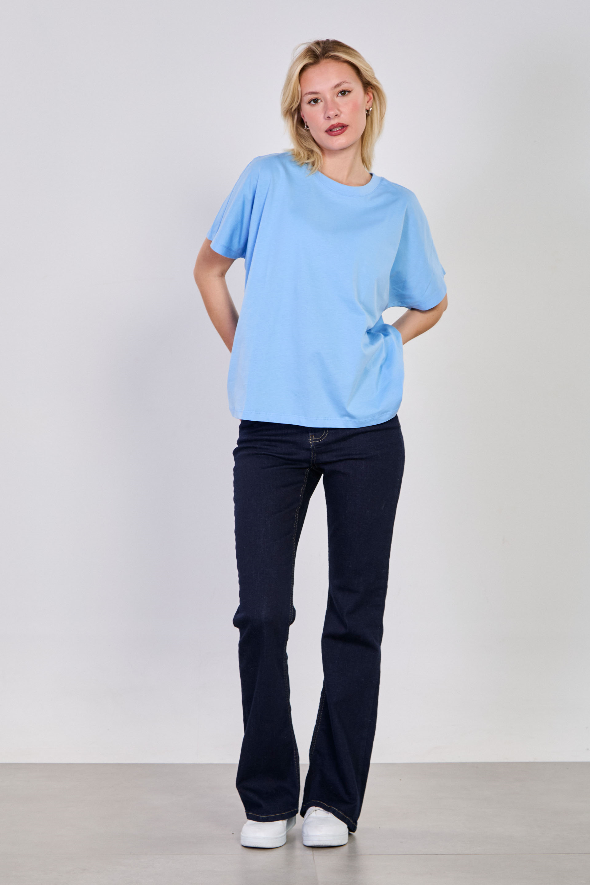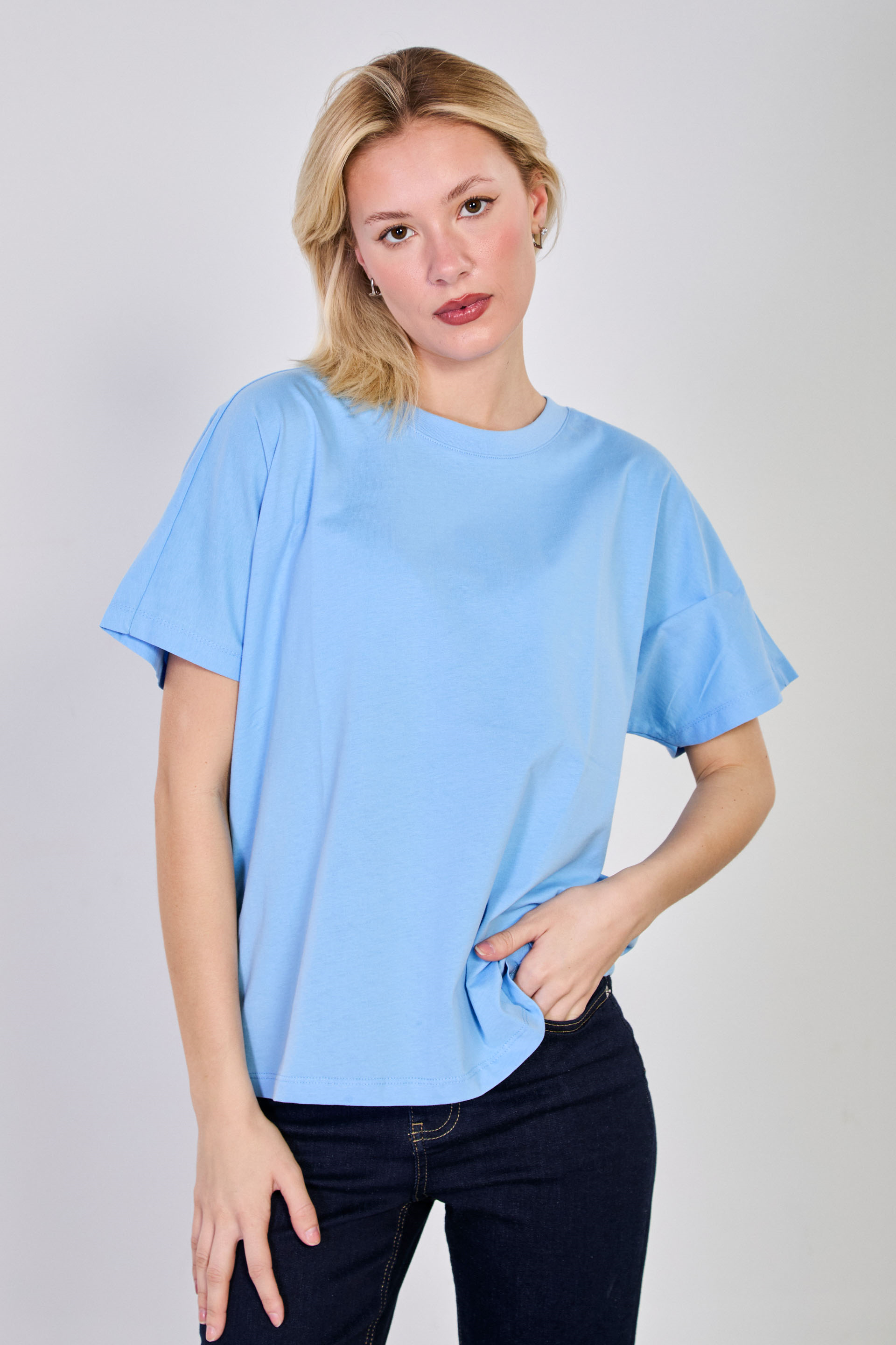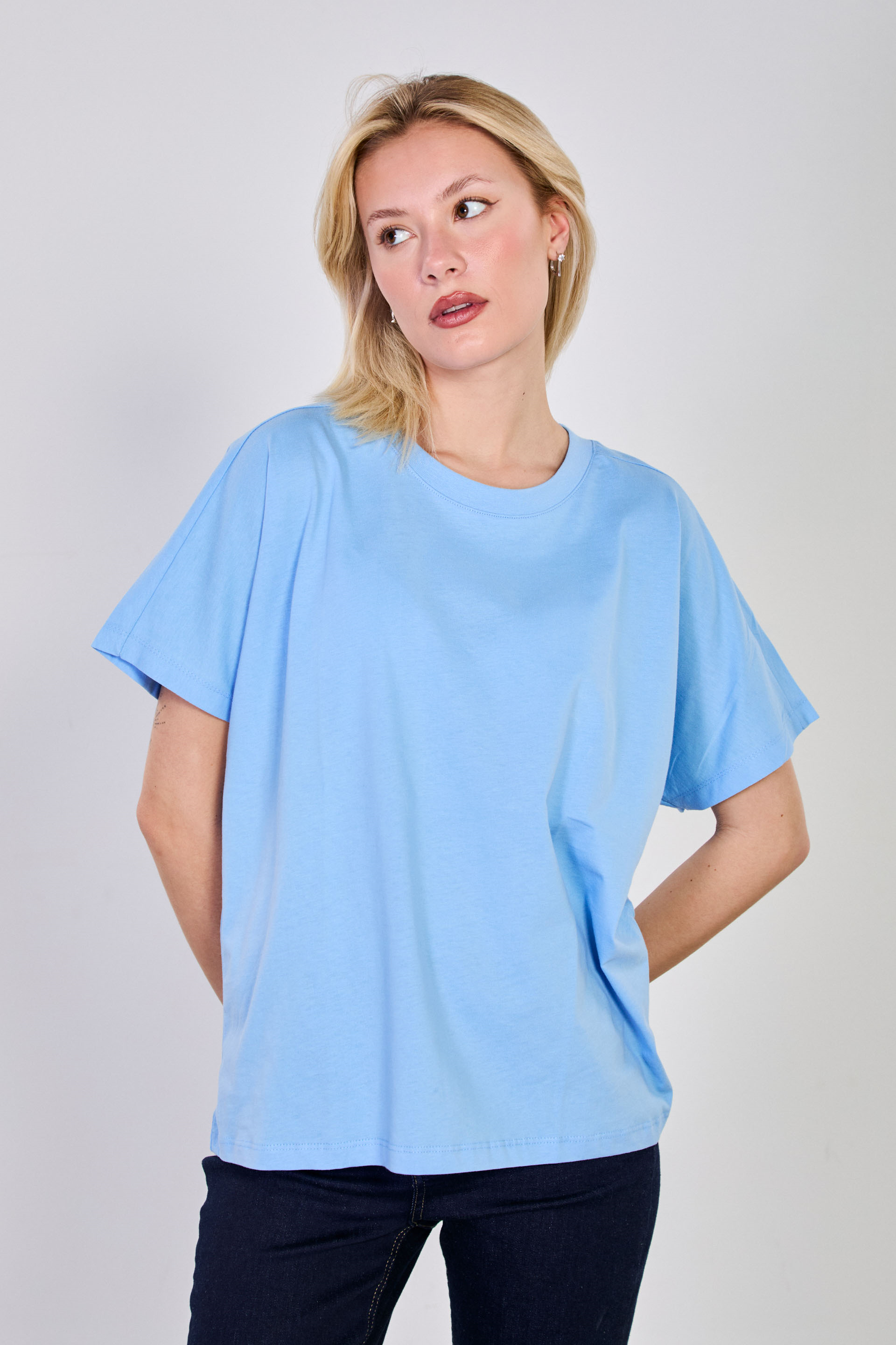 Kadın Dik yaka Düşük Kol Oversize T-Shirt - Mavi