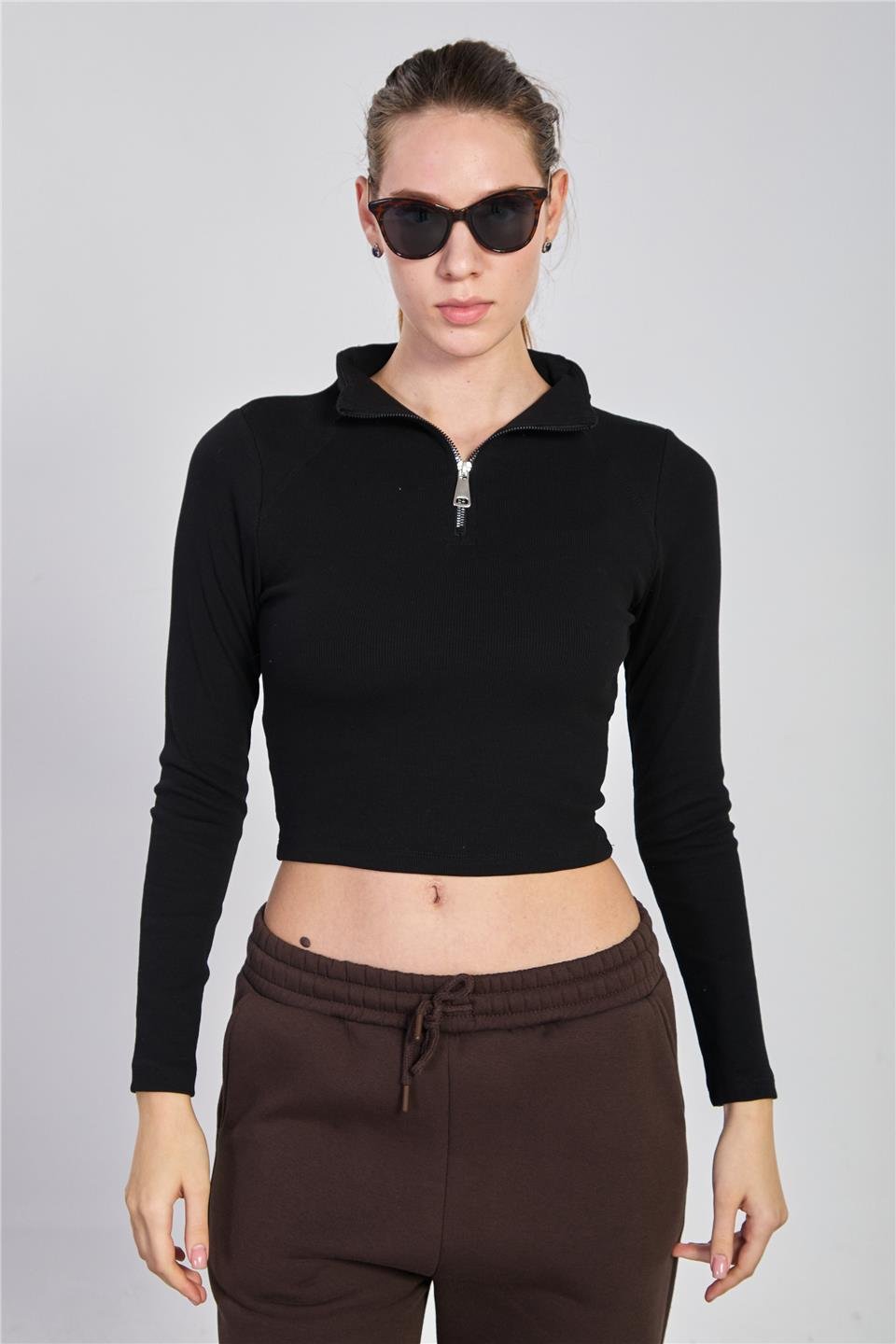 Kadın Dik Yaka Önü Fermuarlı Crop Body - Siyah