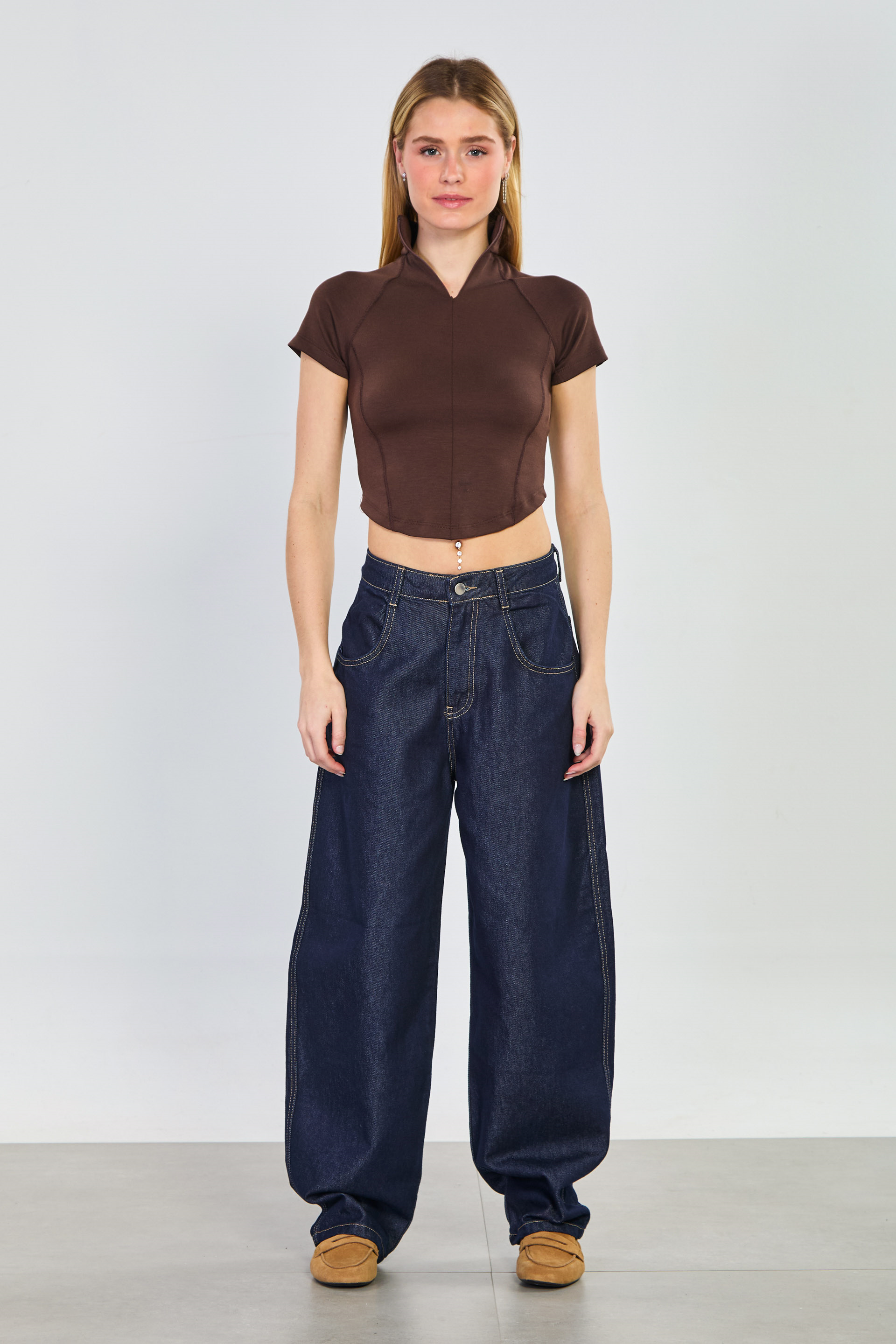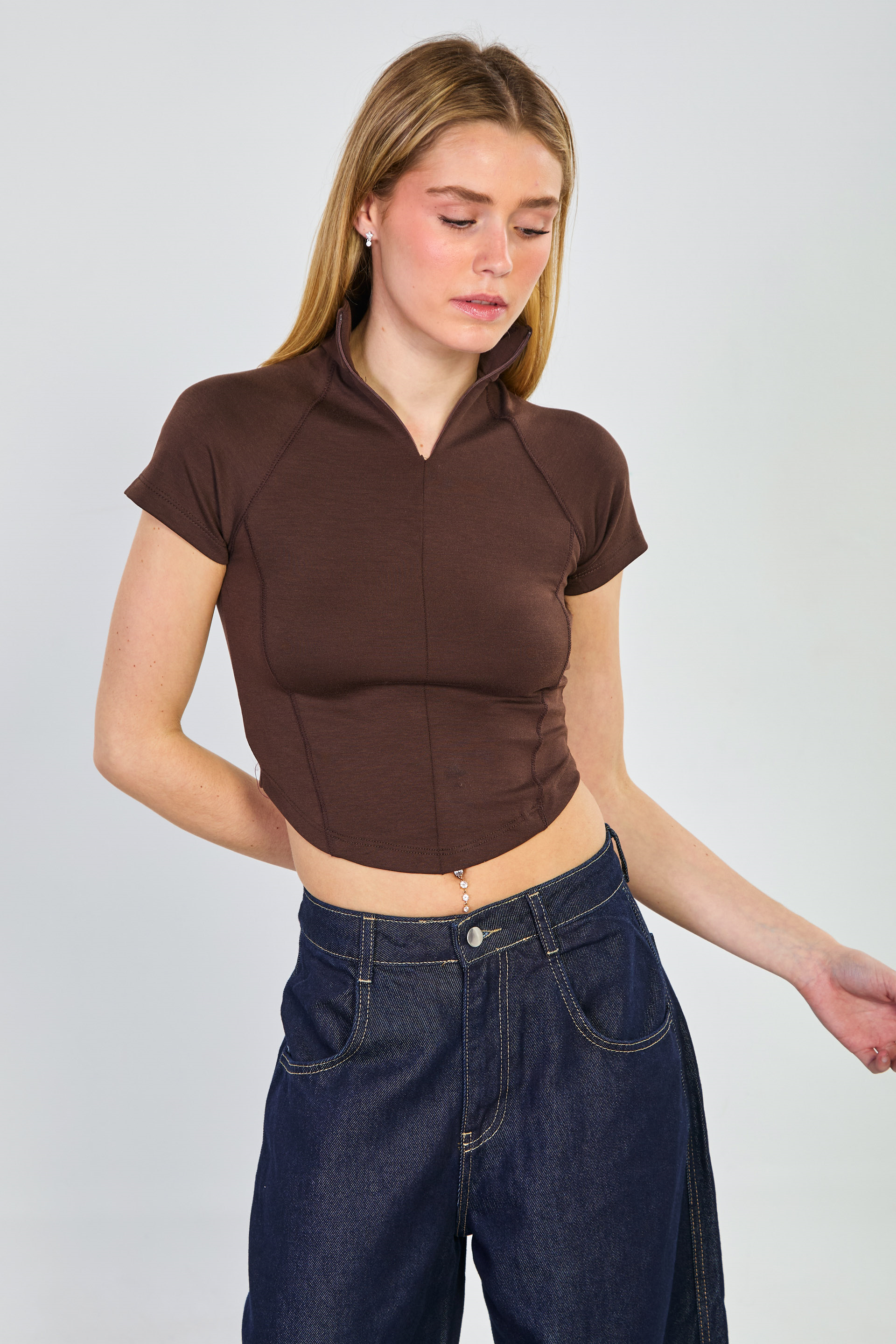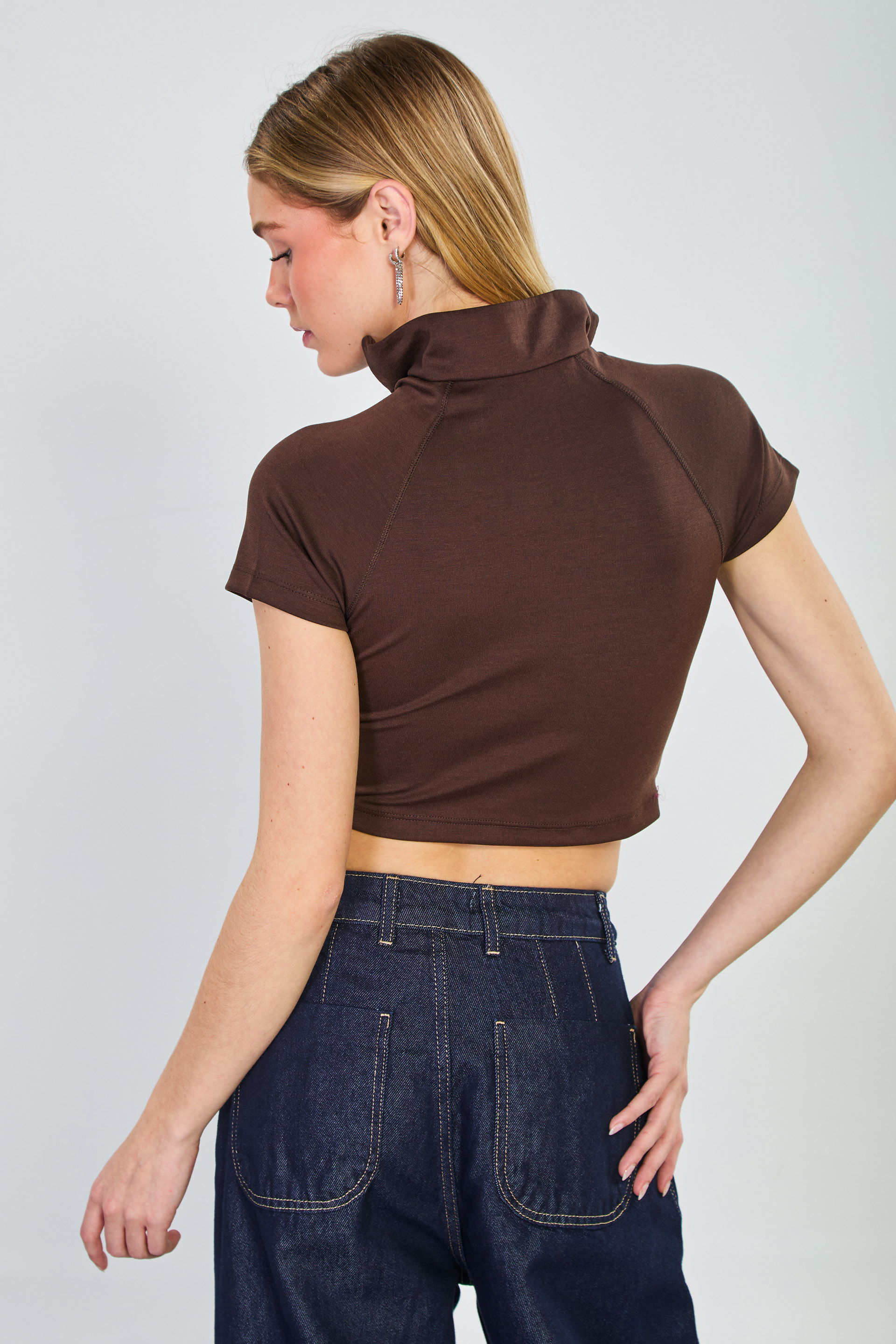 Kadın Dik Yaka Önü Fermuarlı Kısa Kol Body - Acı Kahve