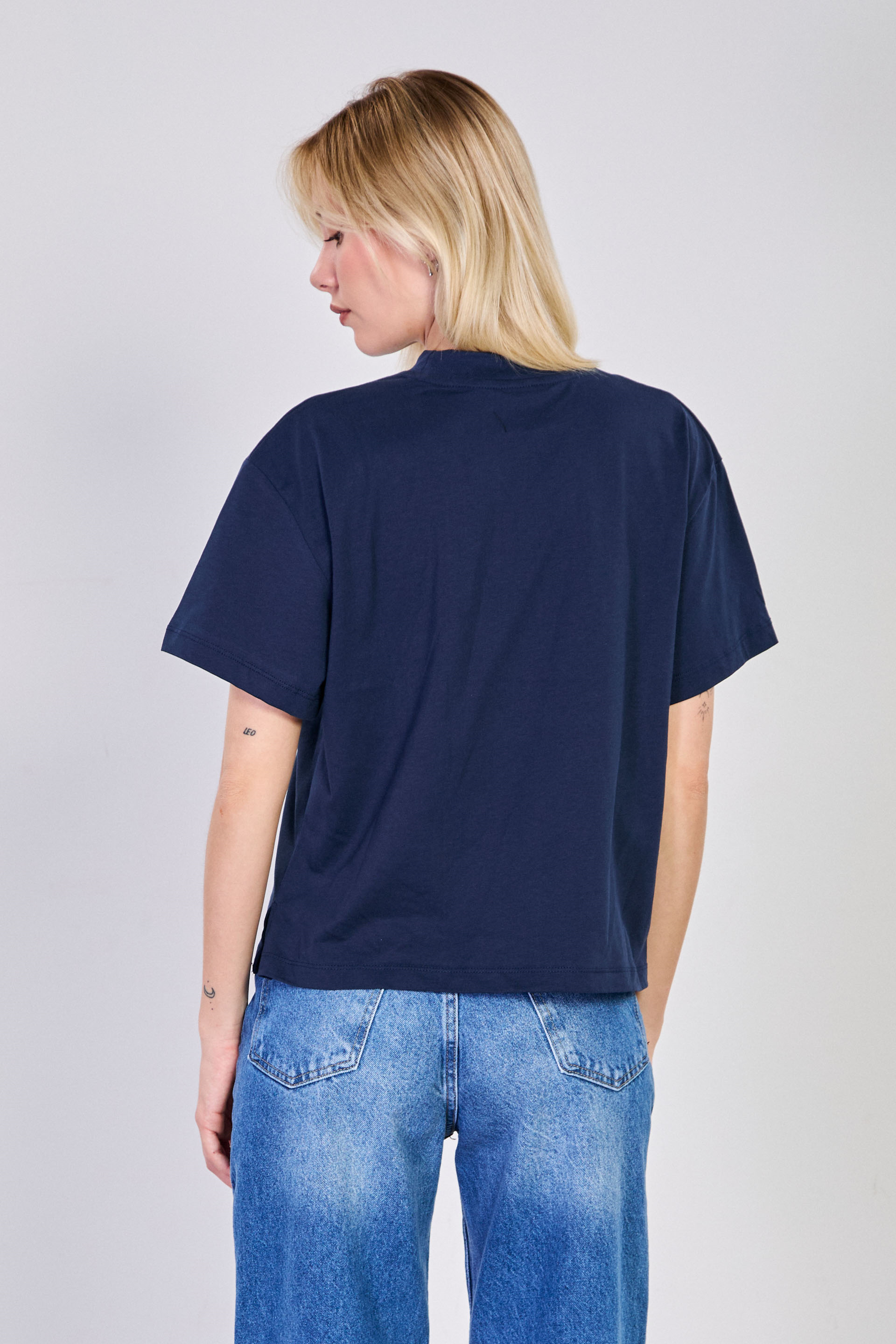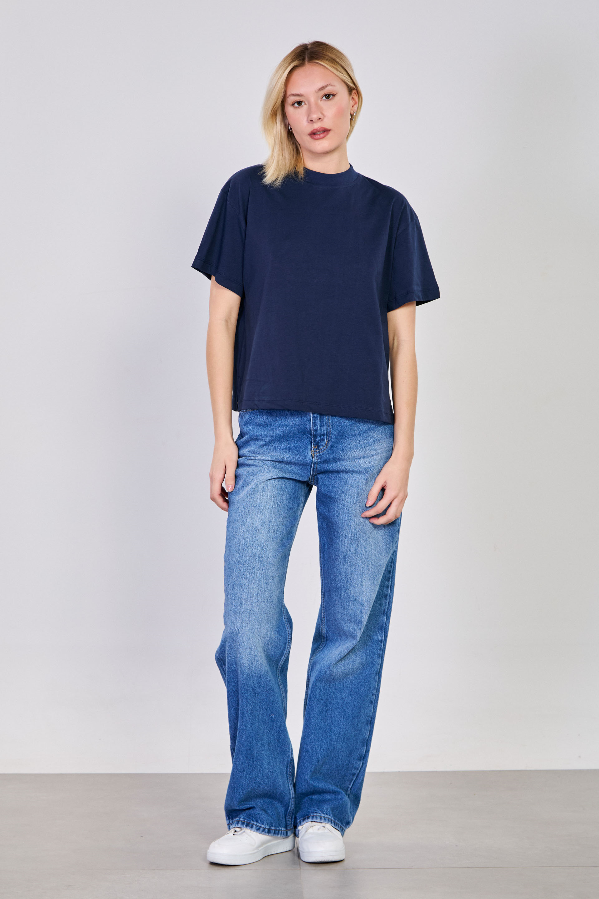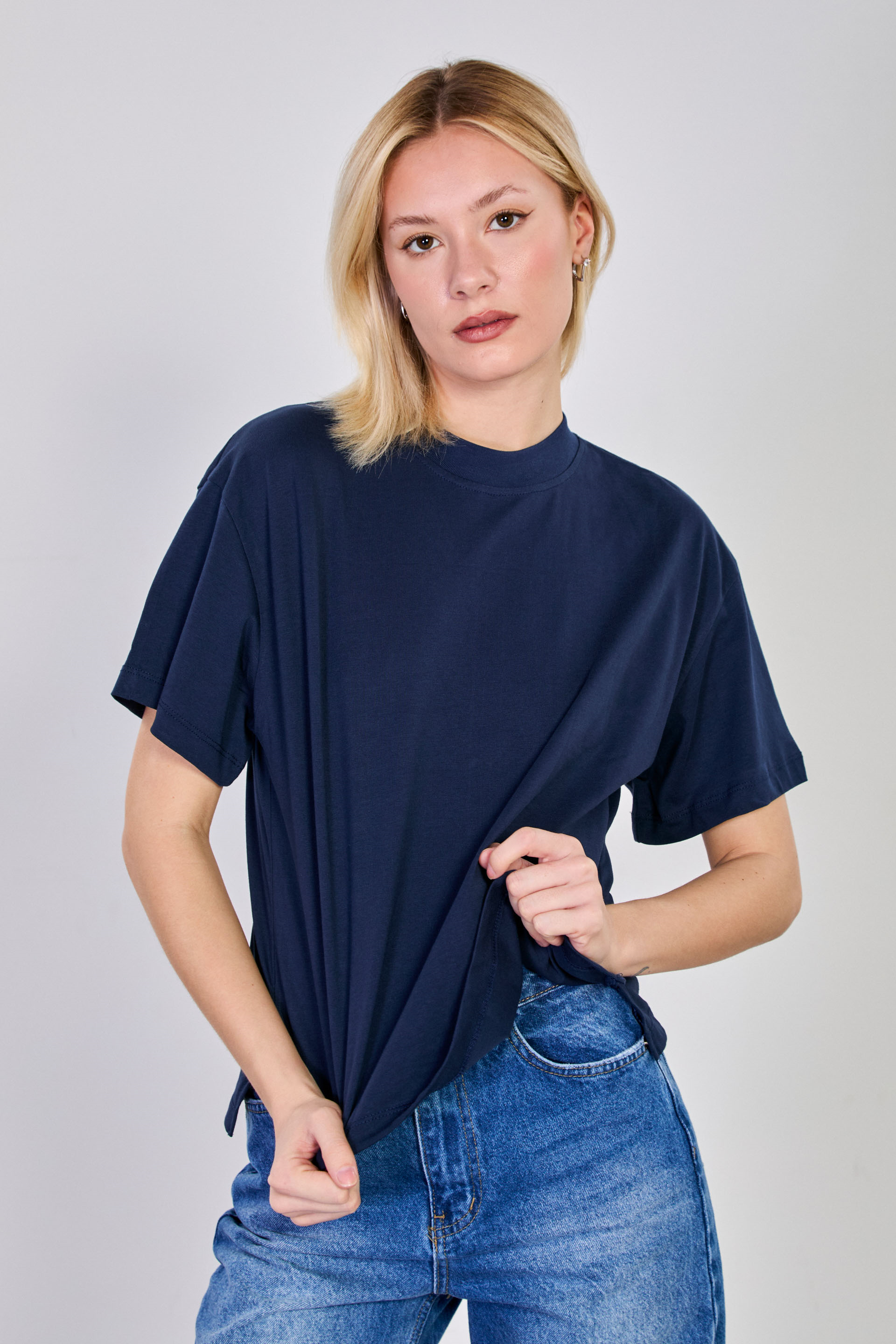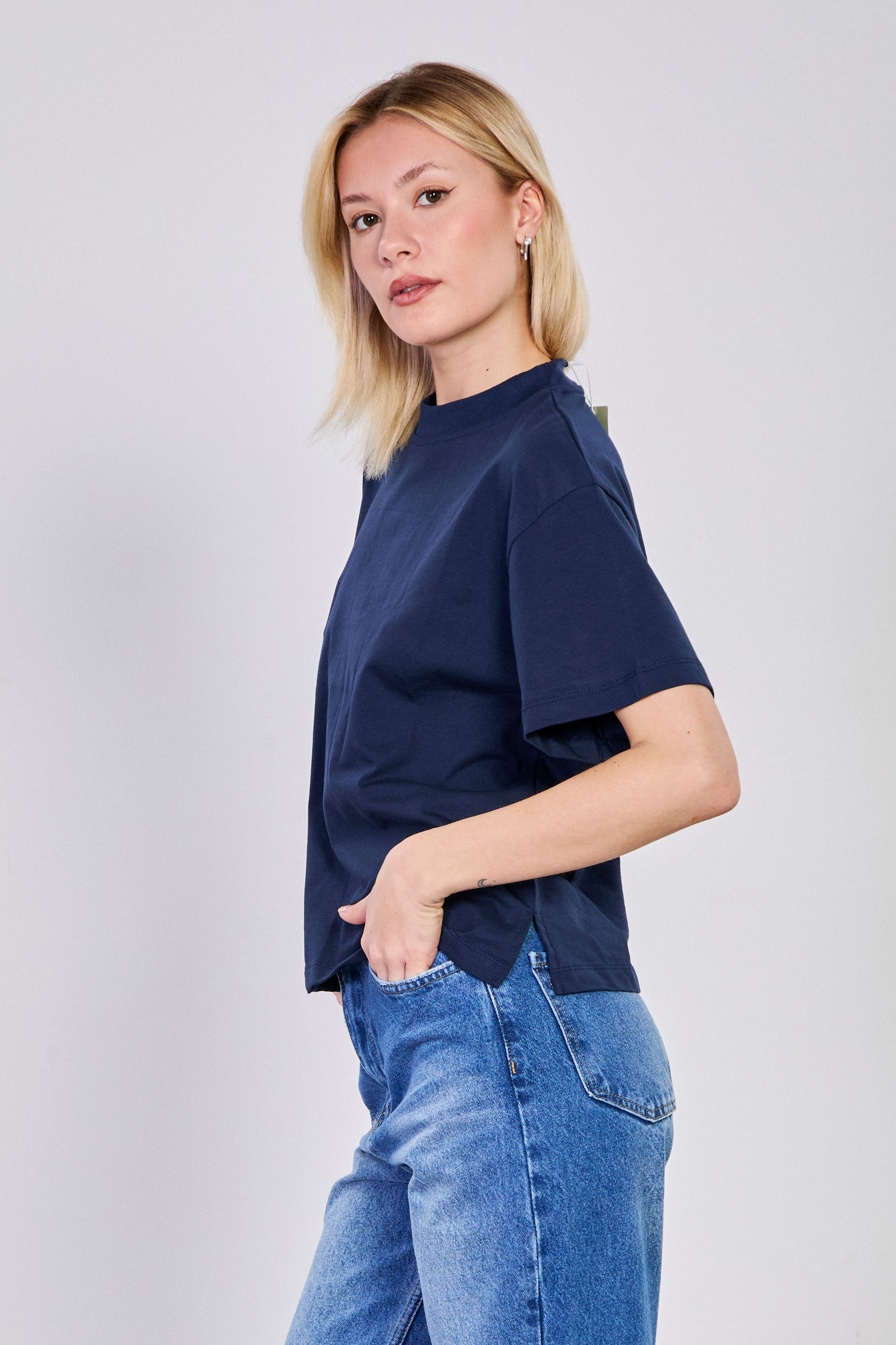 Kadın Dik Yaka Yanı Yırtmaçlı Basic T-Shirt - Lacivert