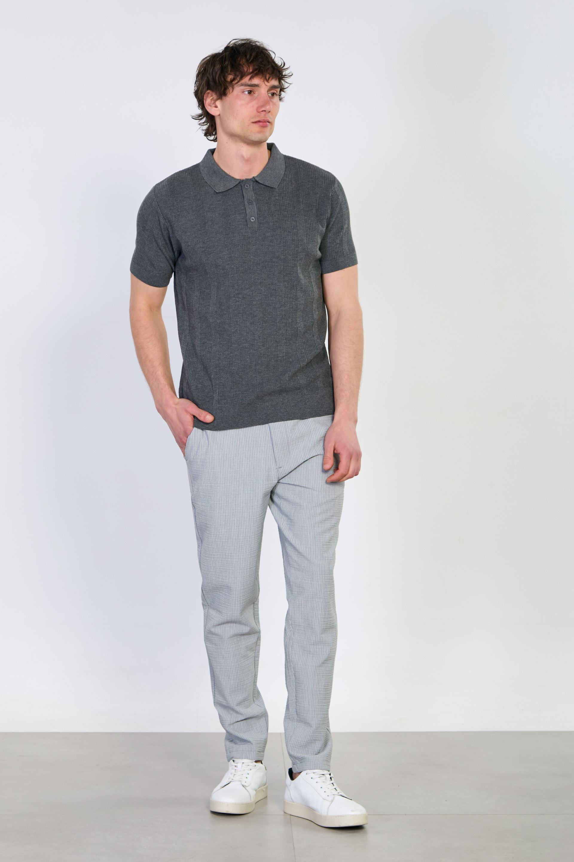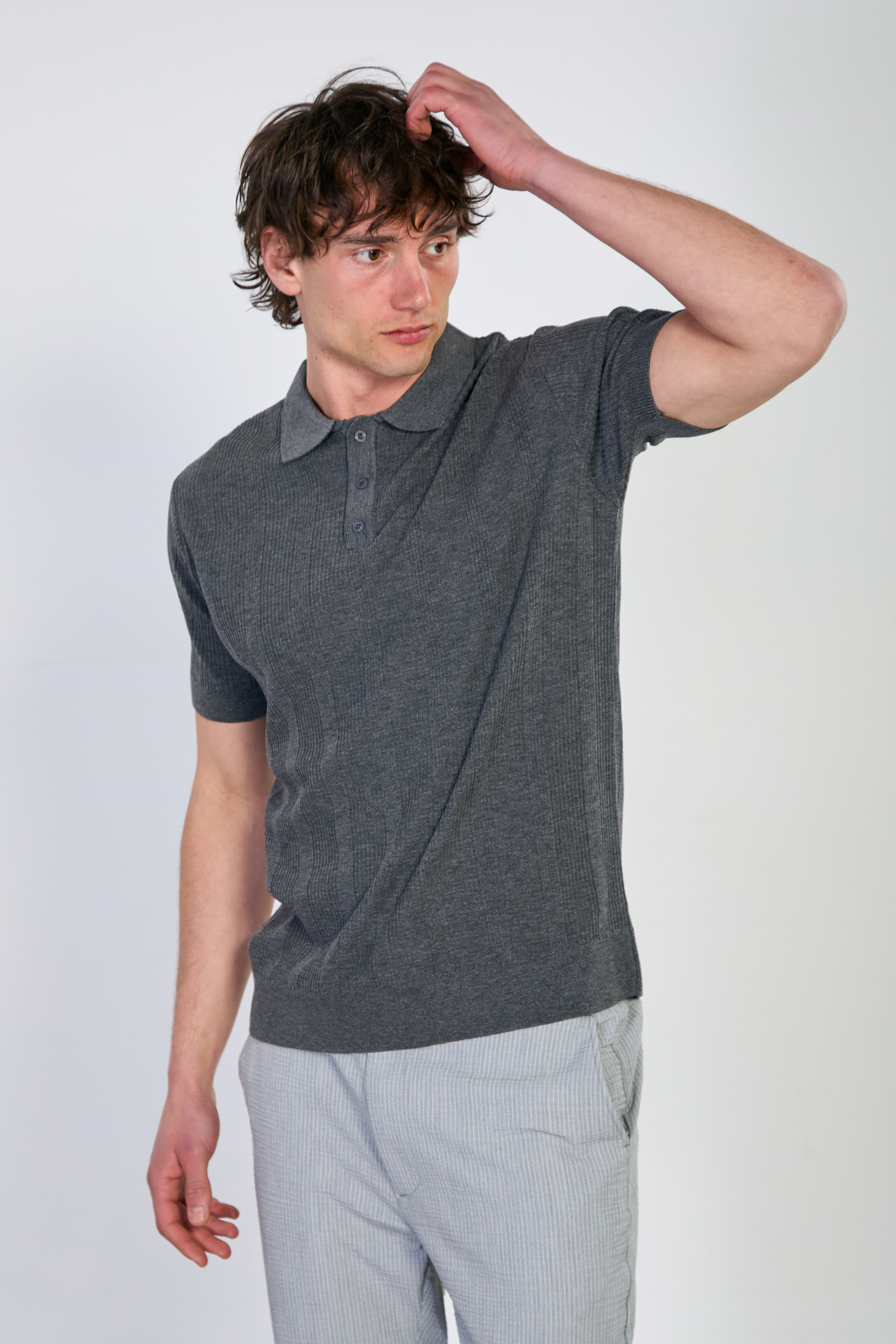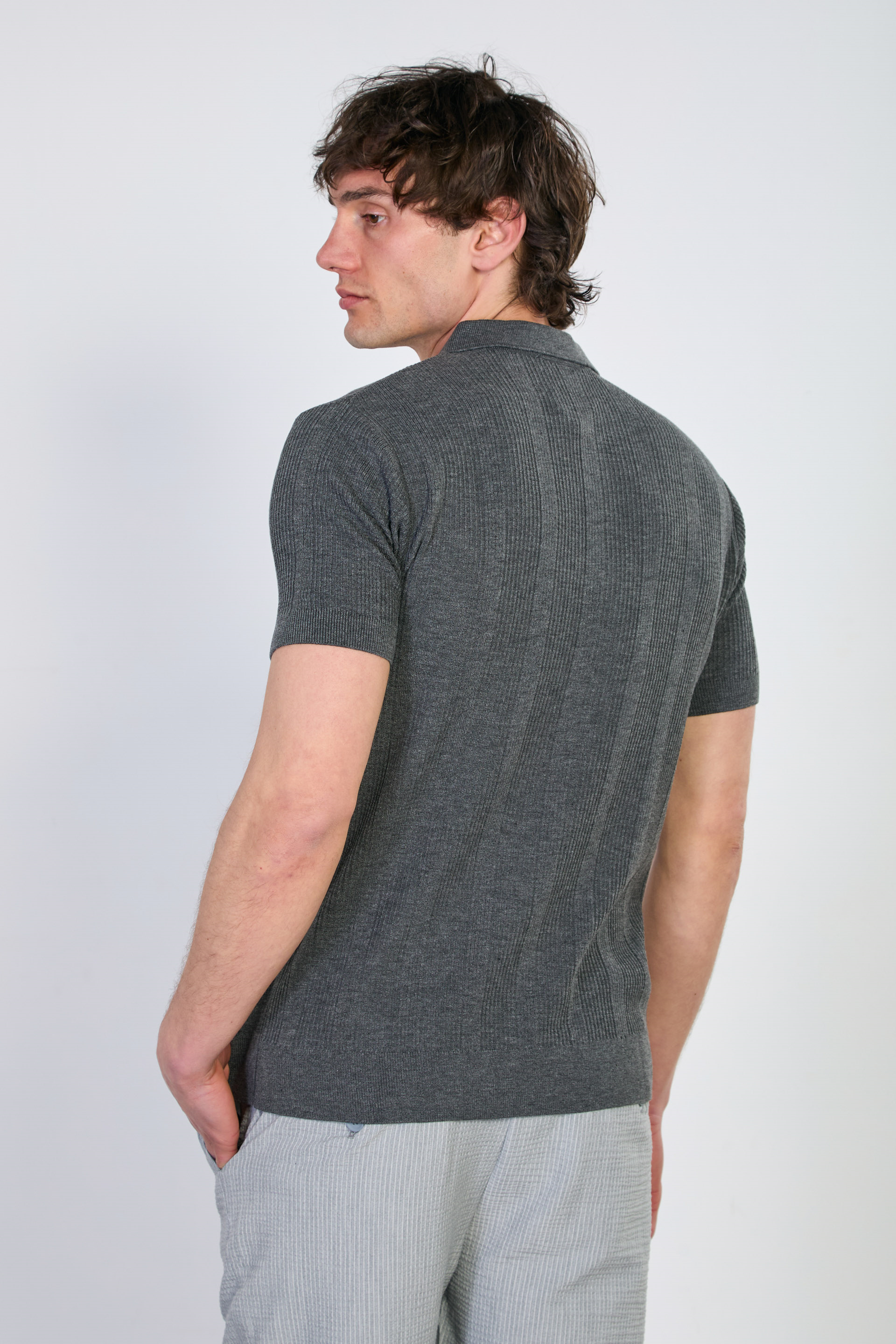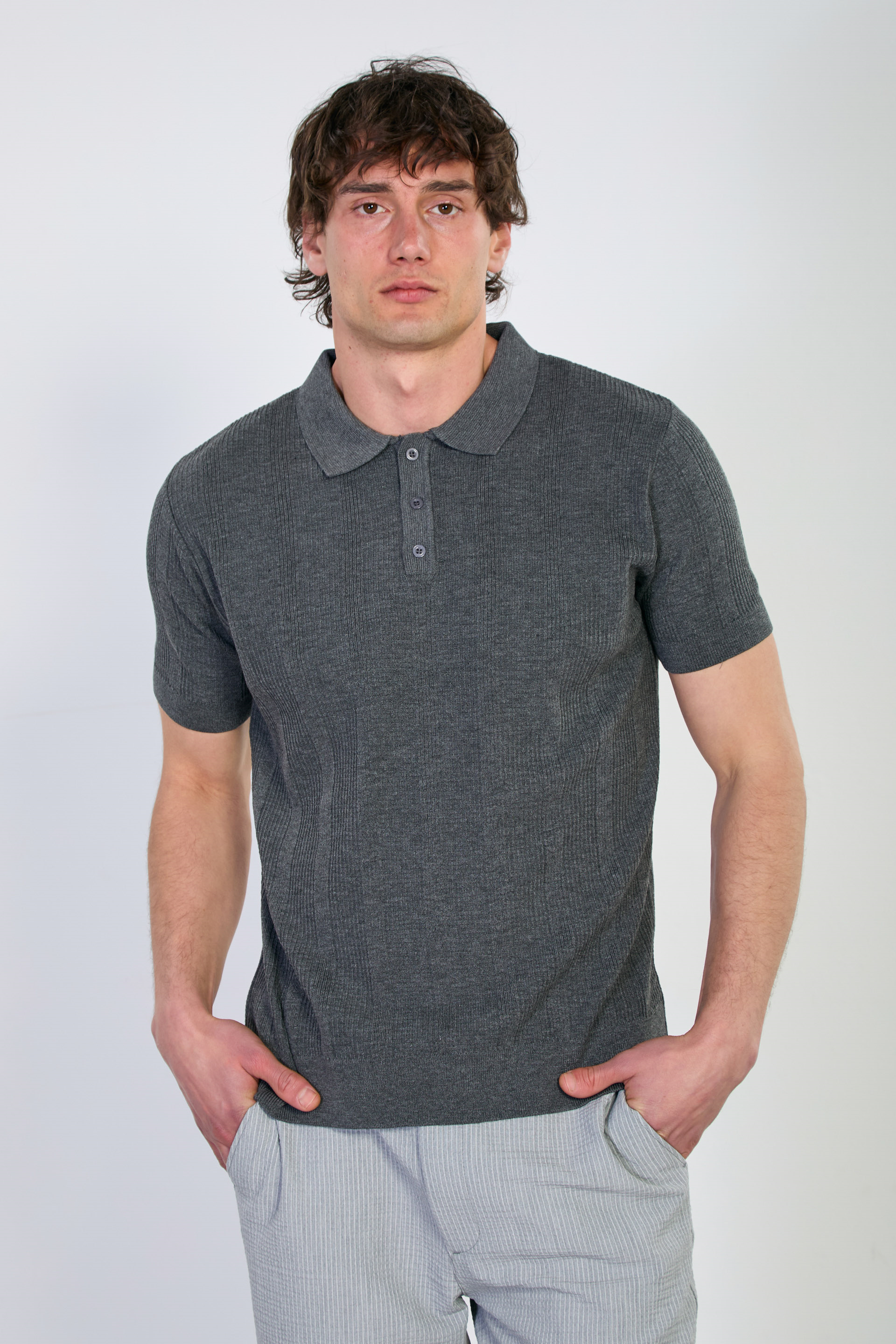 Erkek Dokulu Polo Yaka Düğmeli Triko T-Shirt - Antrasit