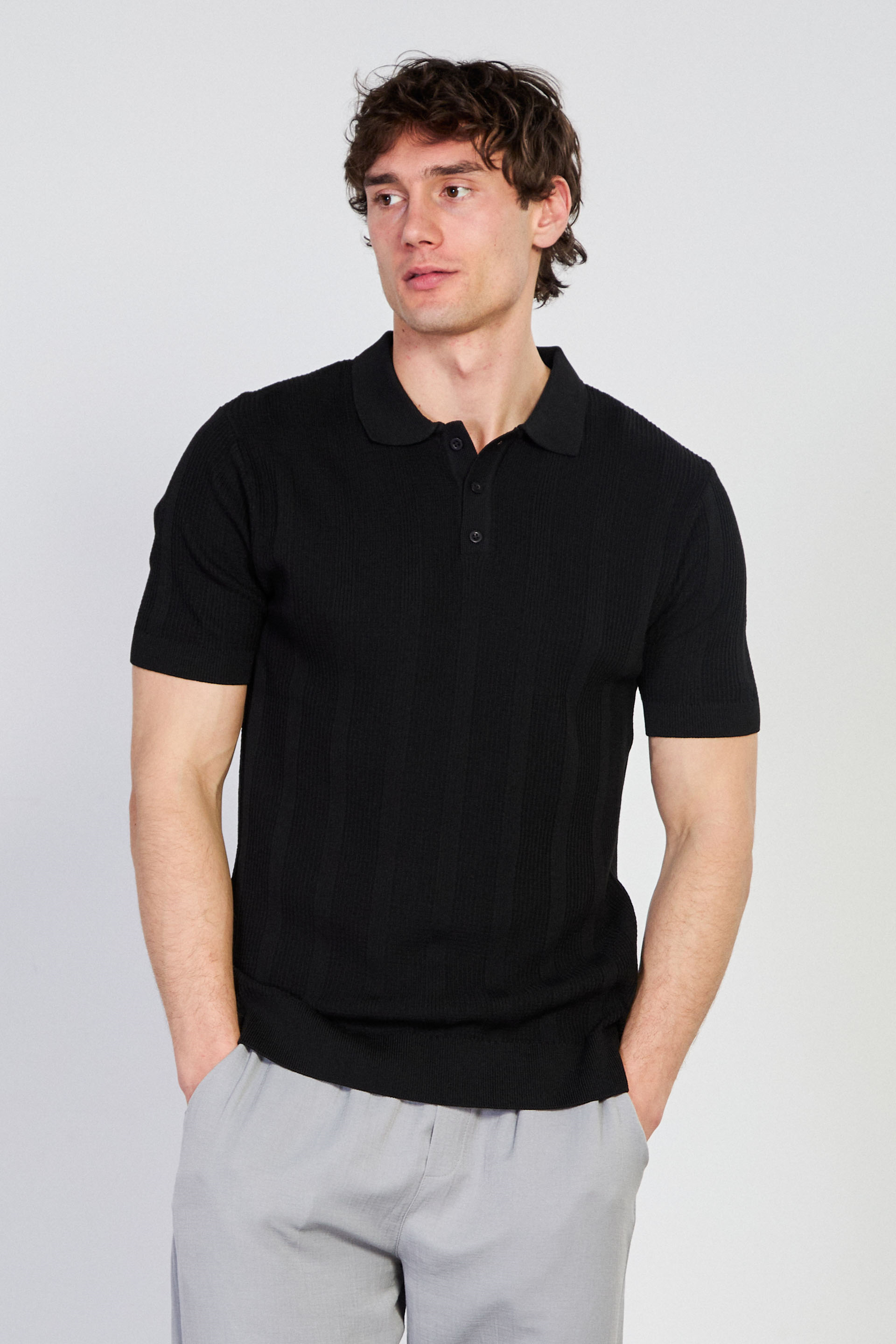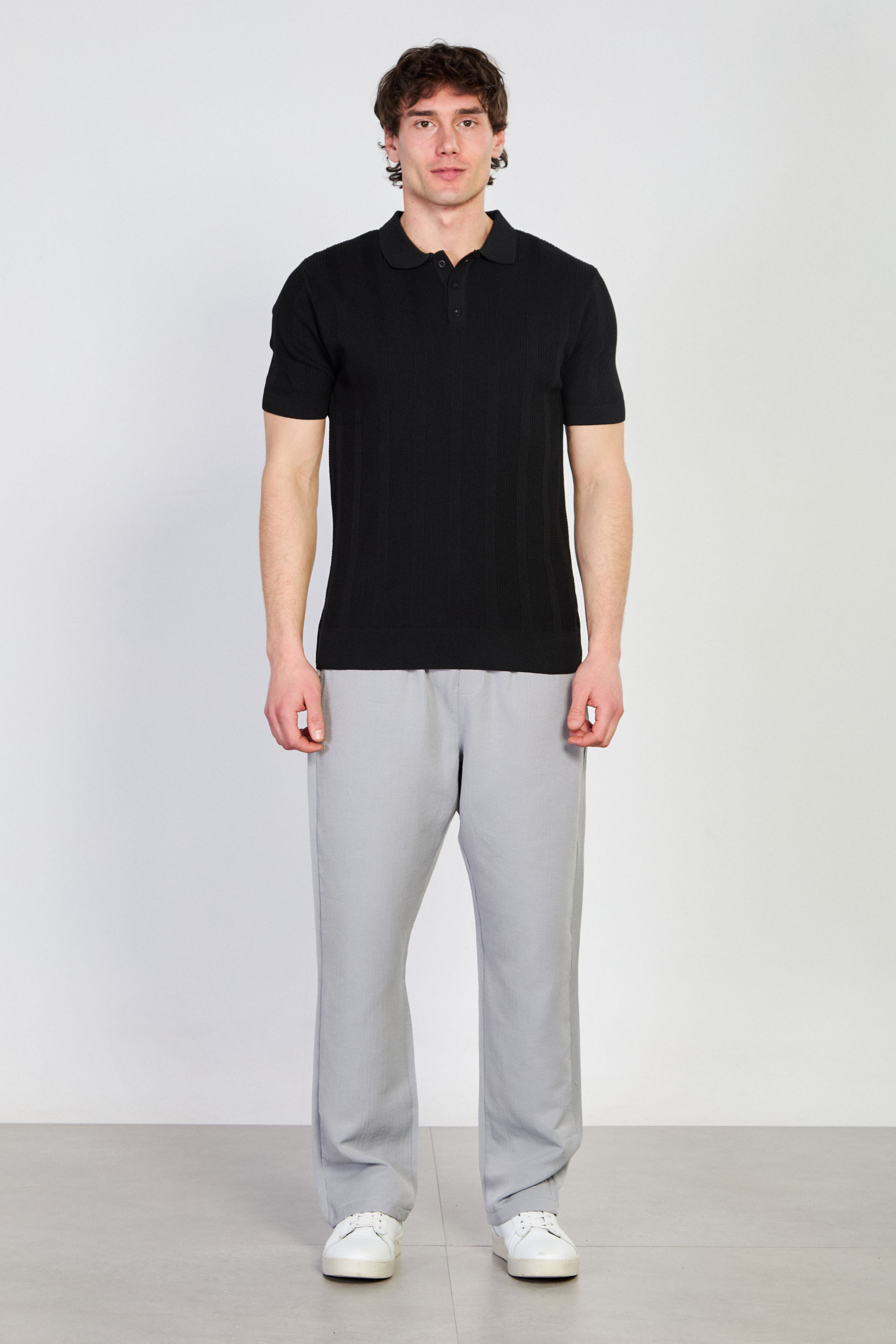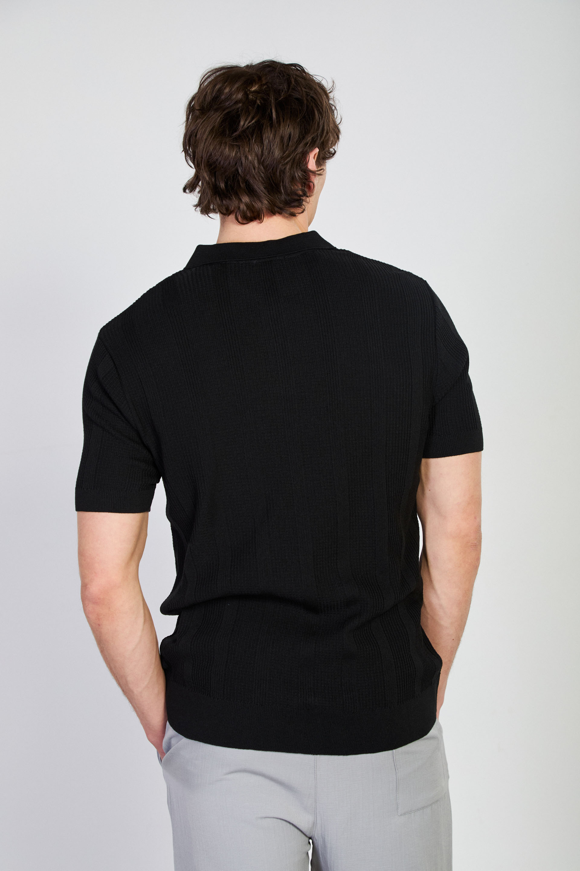 Erkek Dokulu Polo Yaka Düğmeli Triko T-Shirt - Siyah