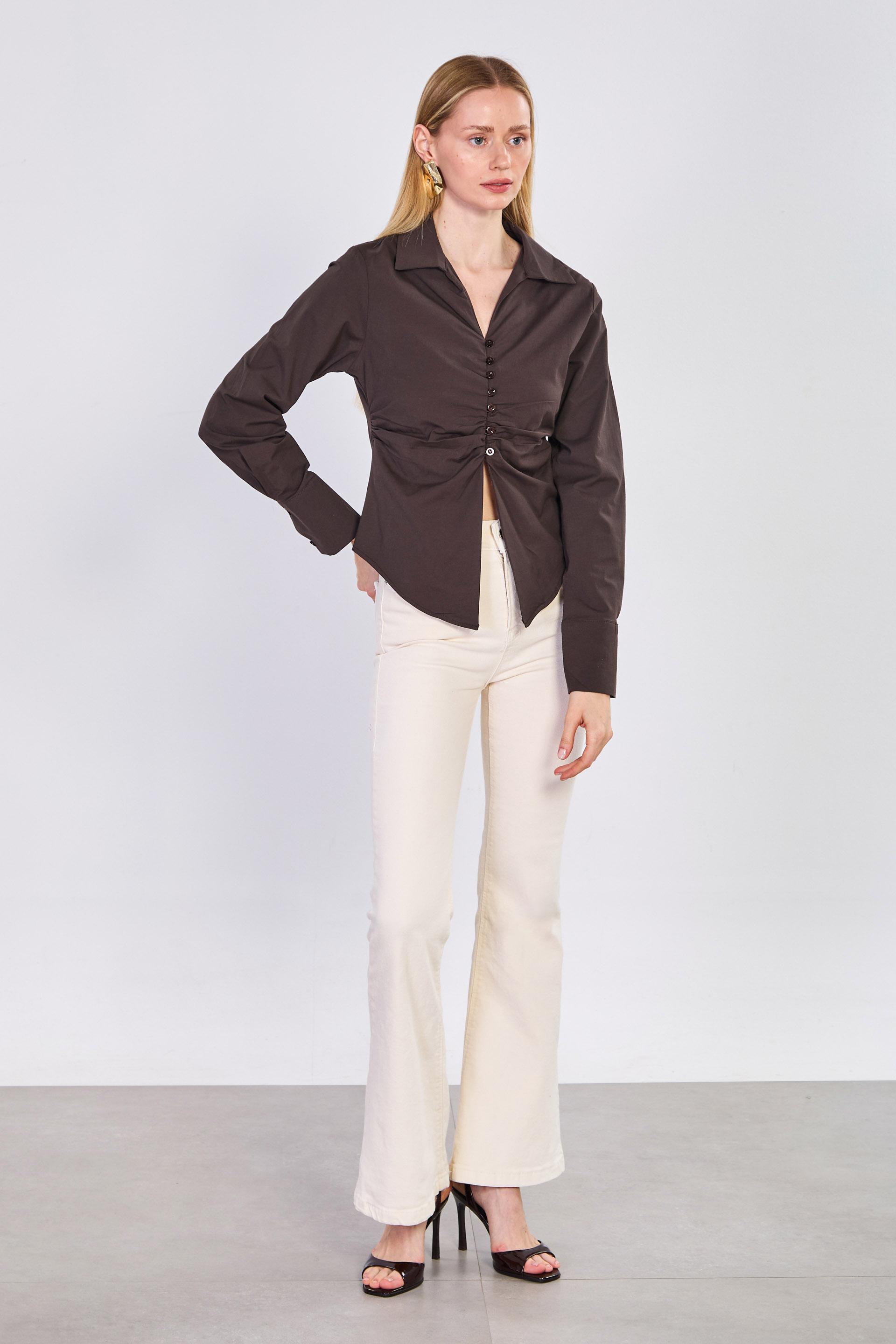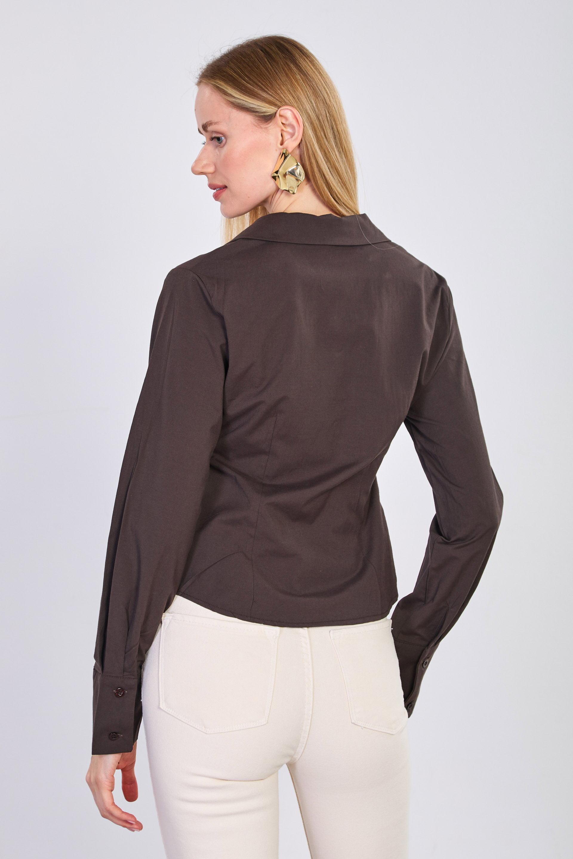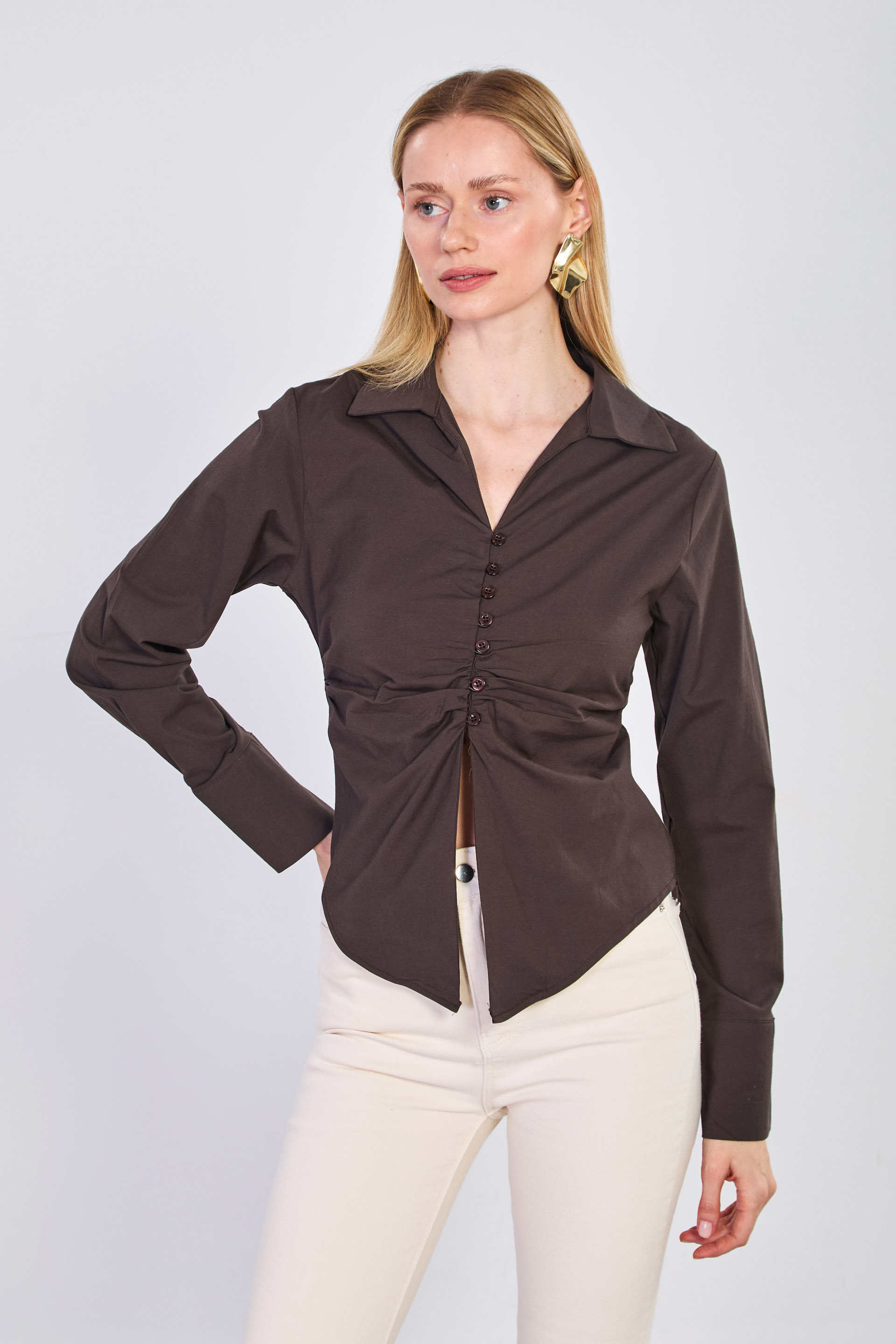 Kadın Drape Detaylı Kalın Manşetli Gömlek - Acı Kahve