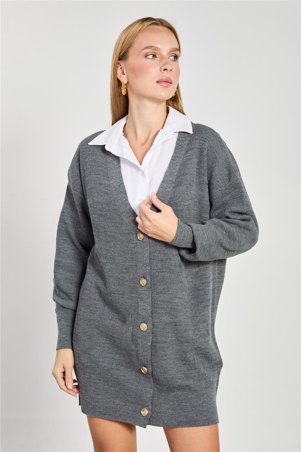 Kadın Düğmeli Fitilli Uzun Triko Hırka - Antrasit