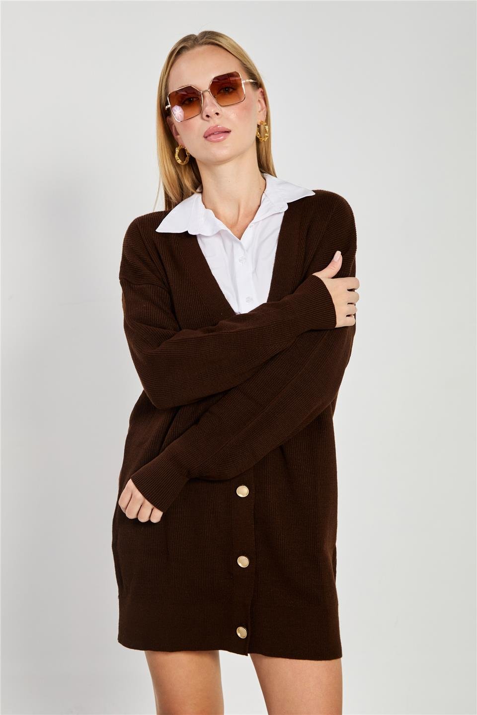 Kadın Düğmeli Fitilli Uzun Triko Hırka - Kahve