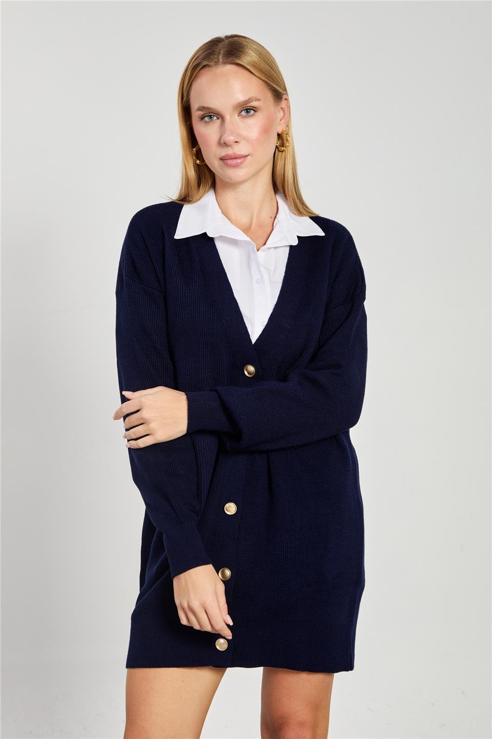 Kadın Düğmeli Fitilli Uzun Triko Hırka - Lacivert