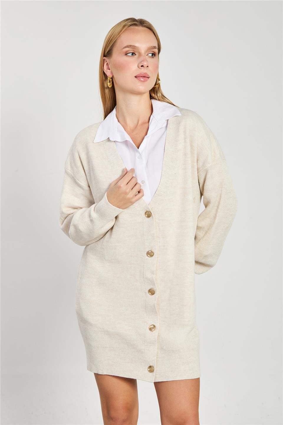 Kadın Düğmeli Fitilli Uzun Triko Hırka - Taş Rengi