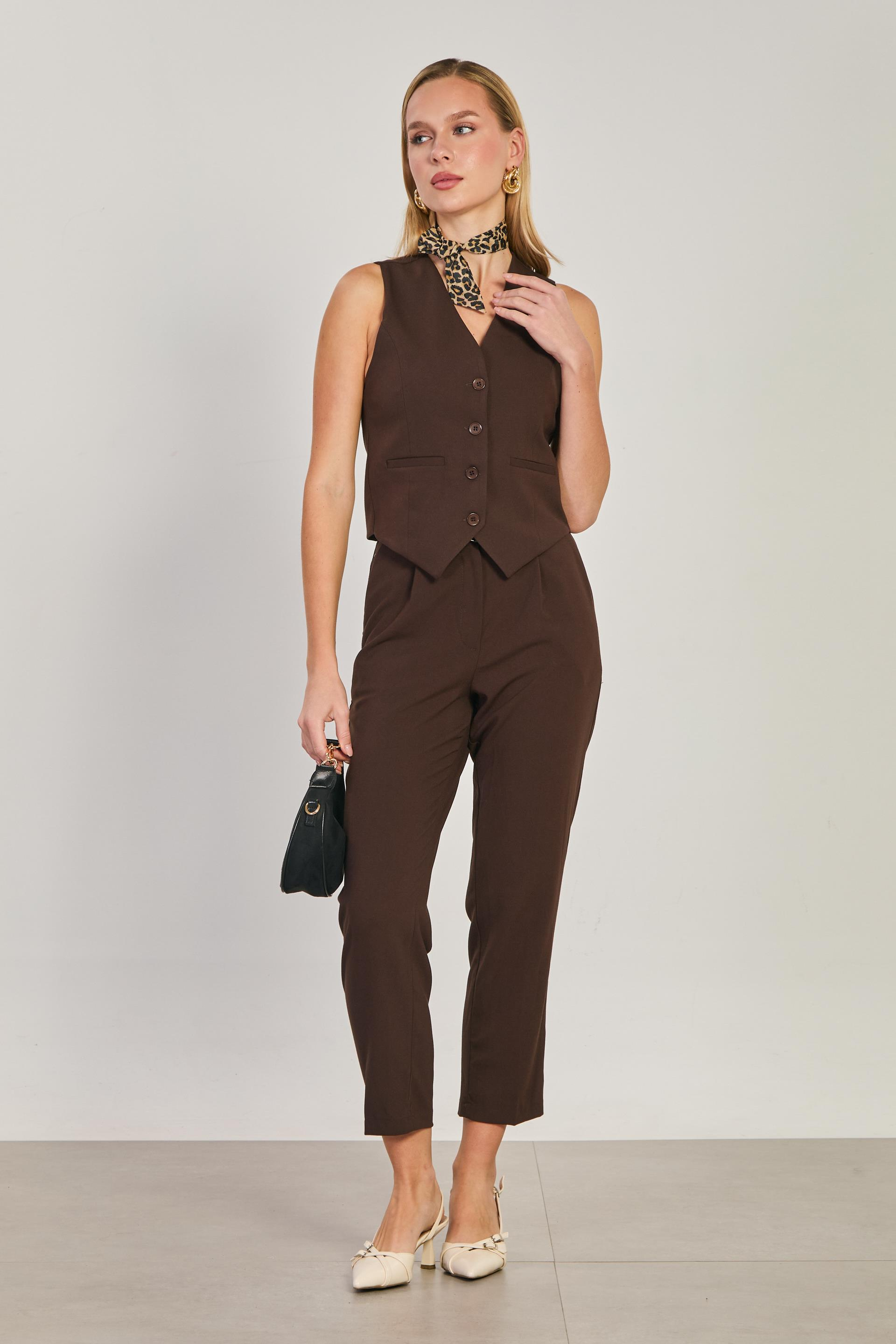 Kadın Düğmeli Fleto Cepli Yelek - Kahve