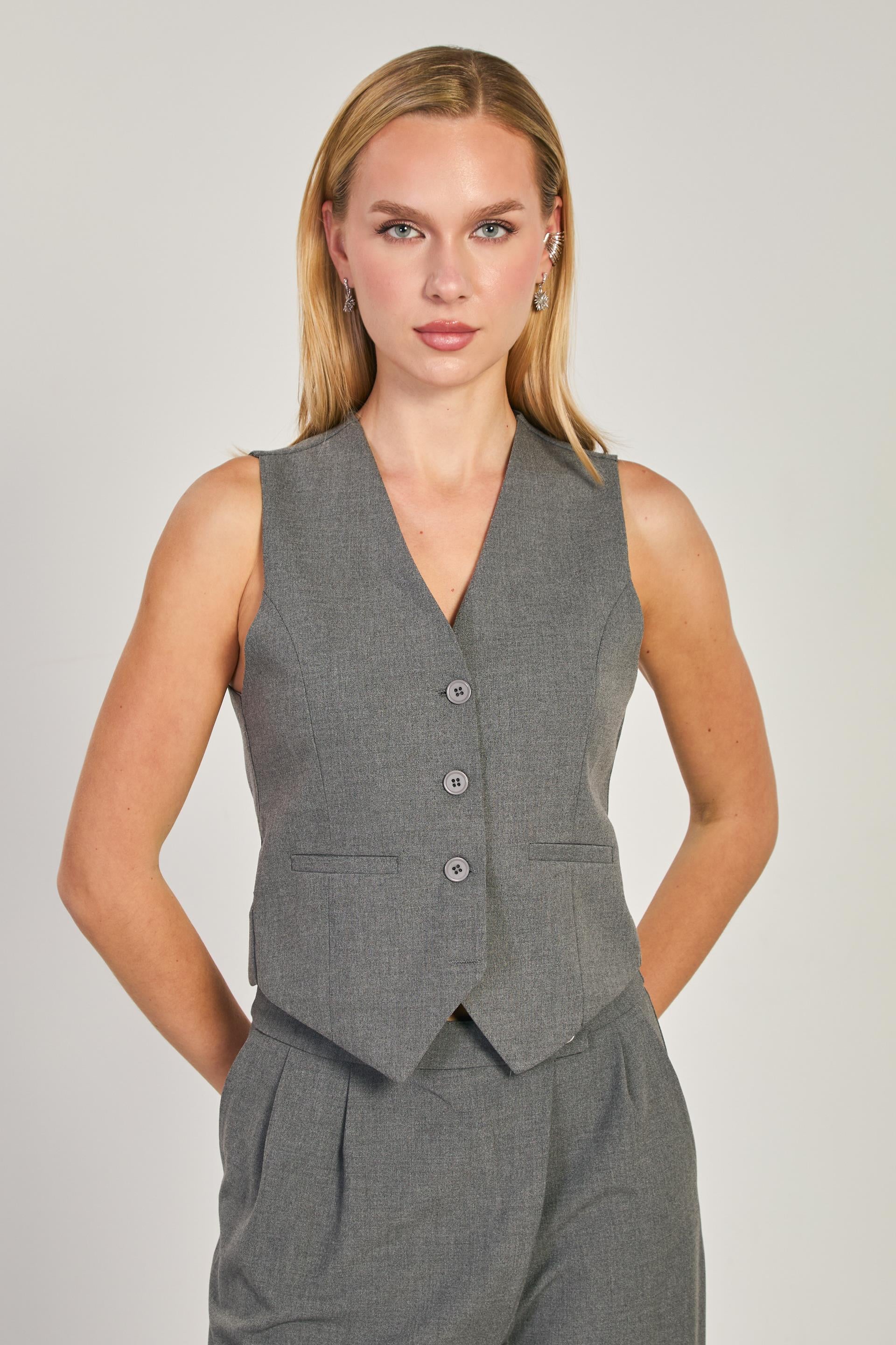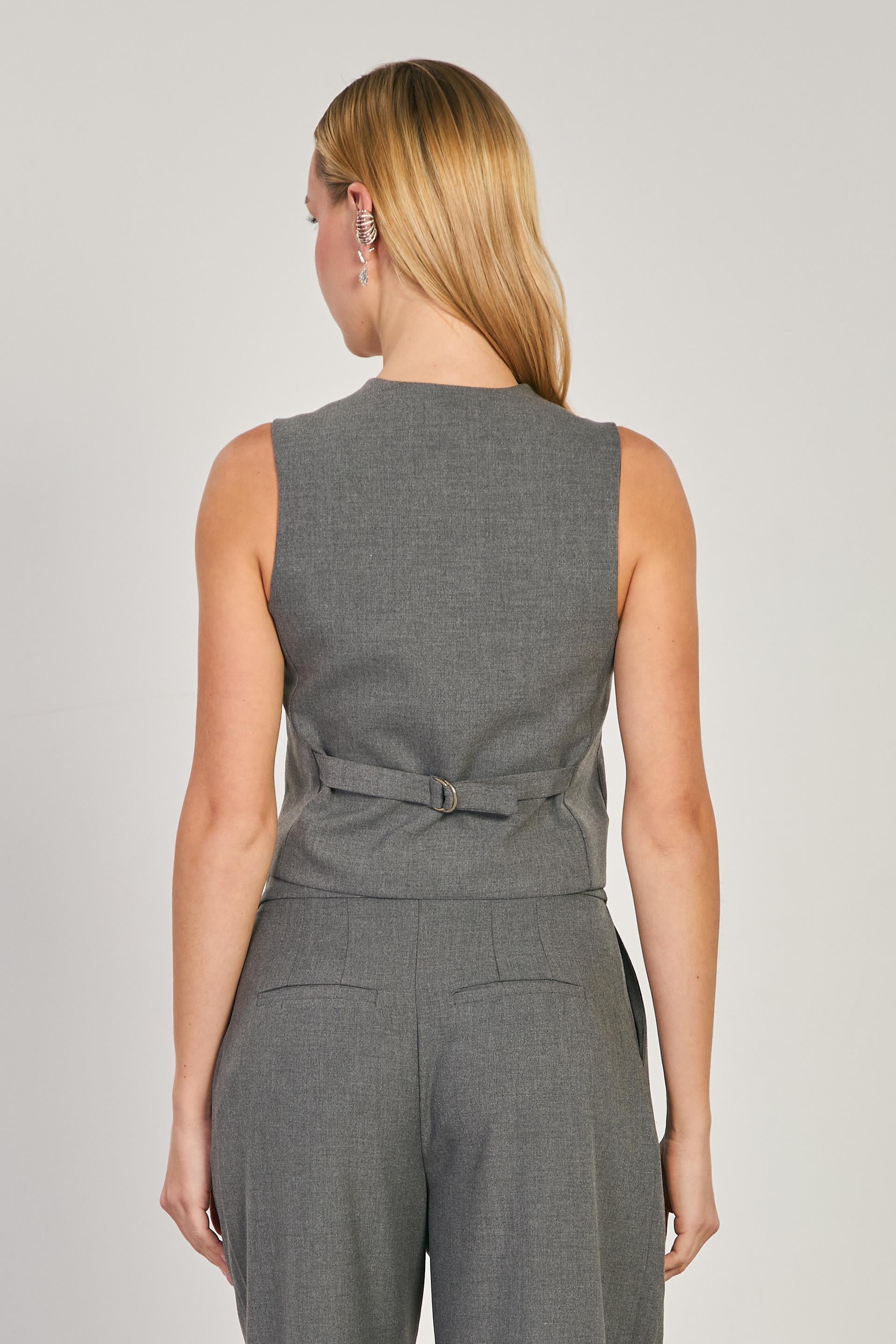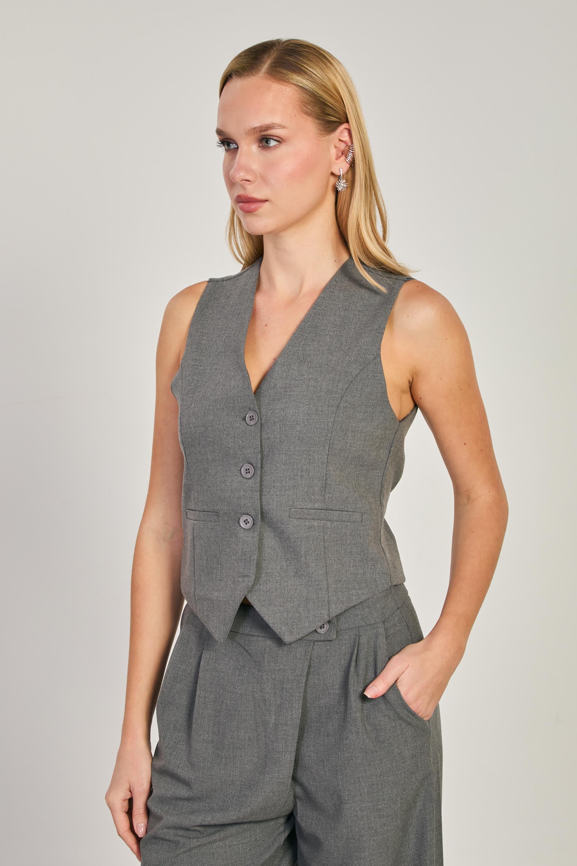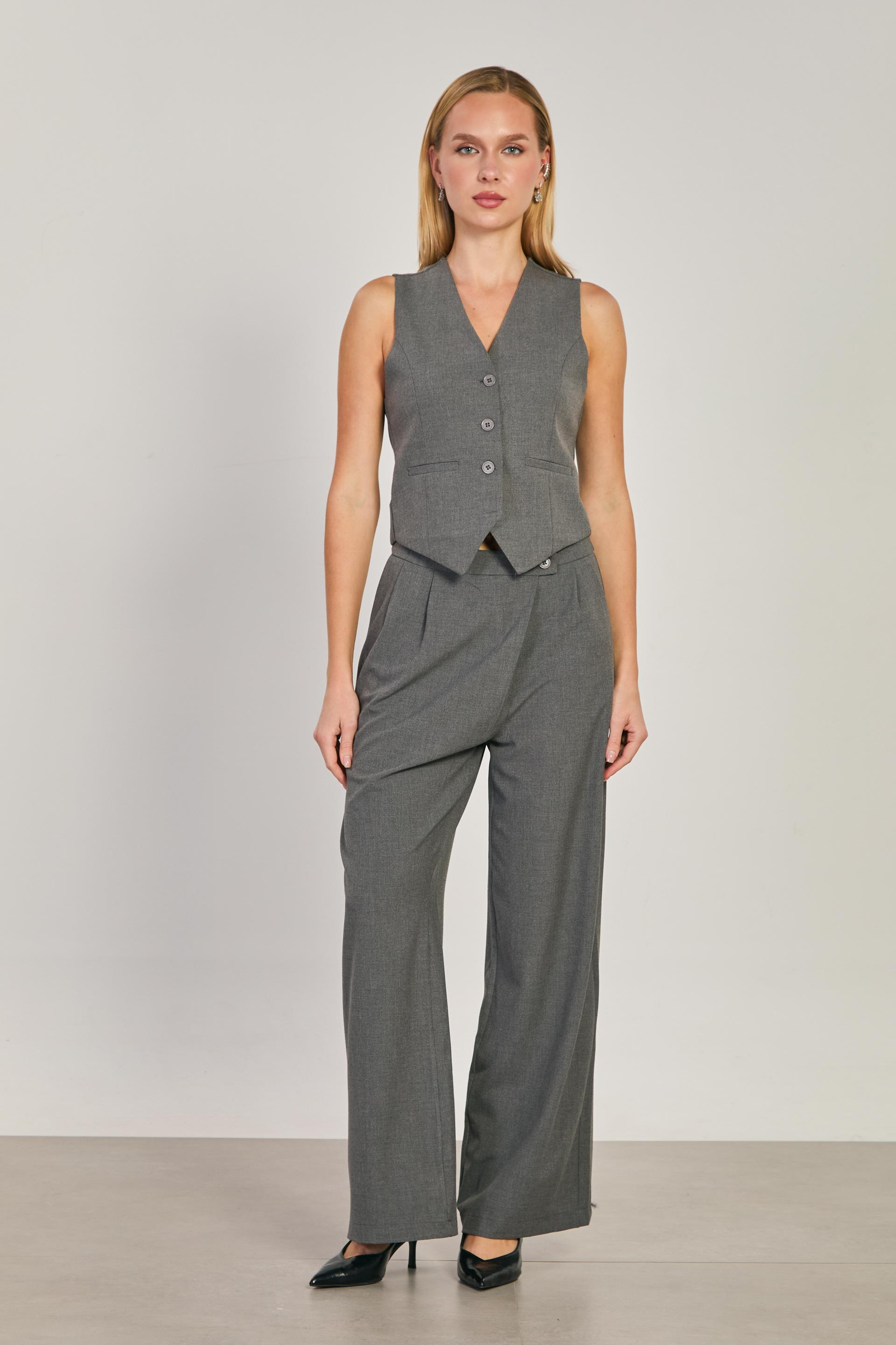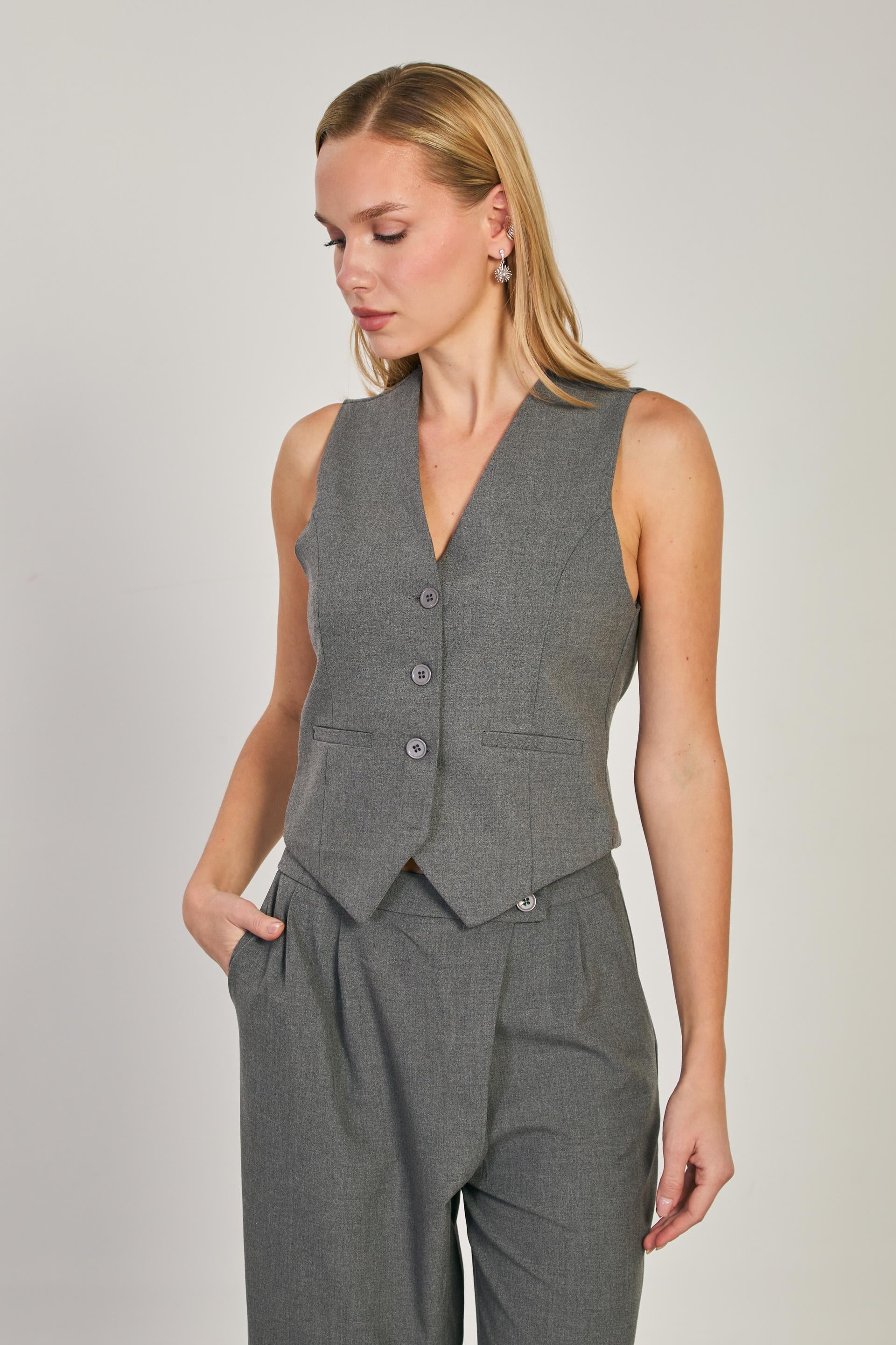 Kadın Düğmeli Fleto Cepli Yelek - Okul Gri