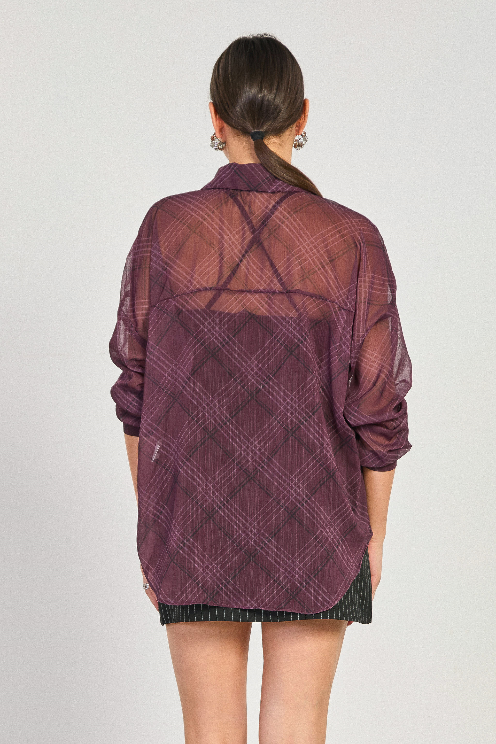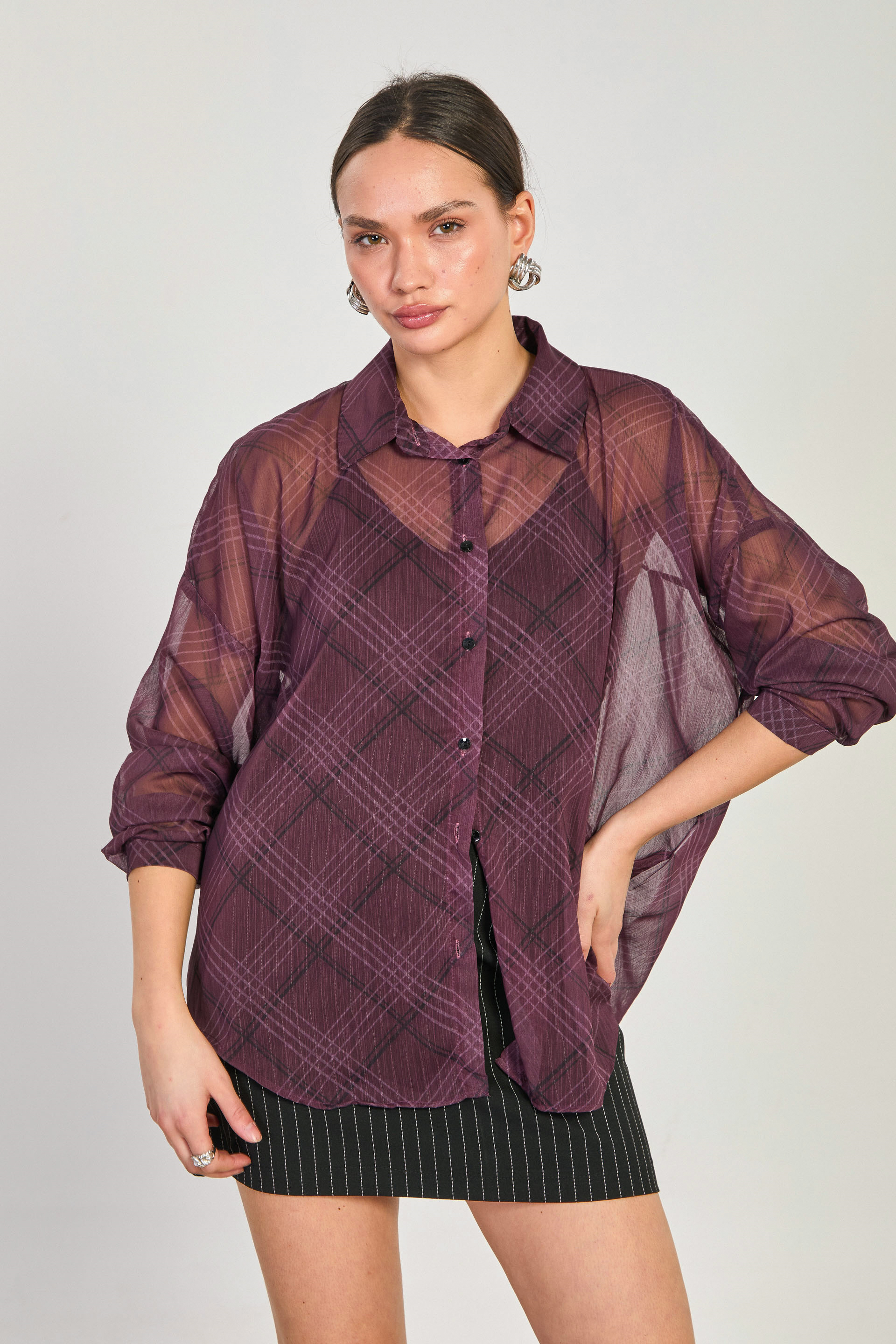 Kadın Ekose Desen Şifon Gömlek - Mürdüm