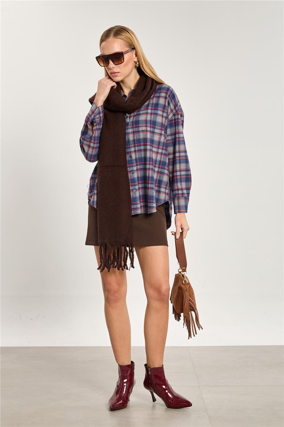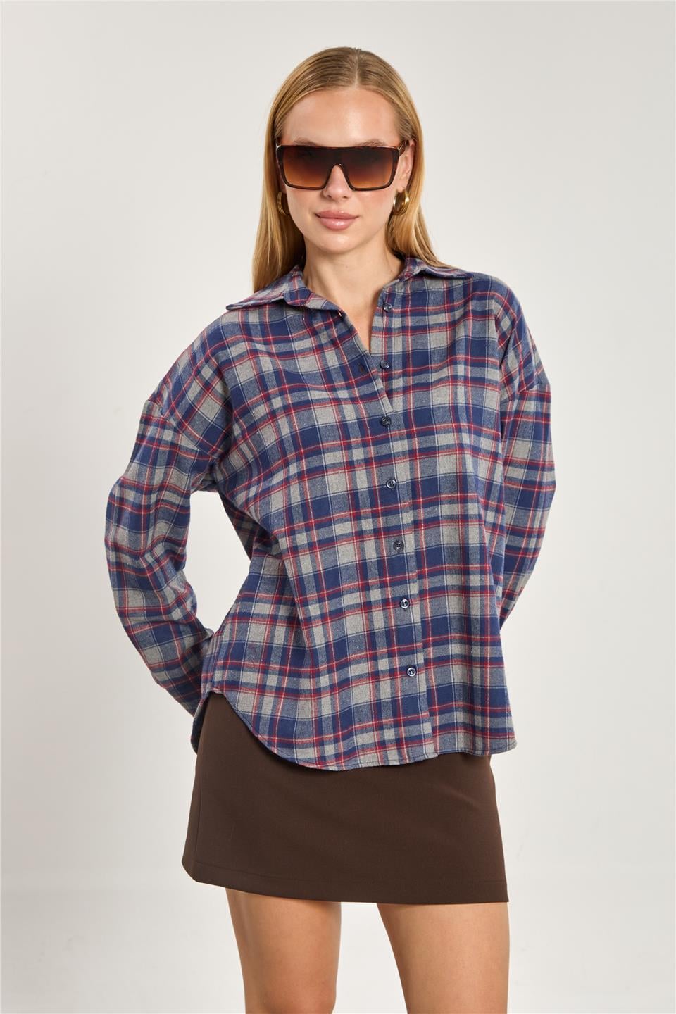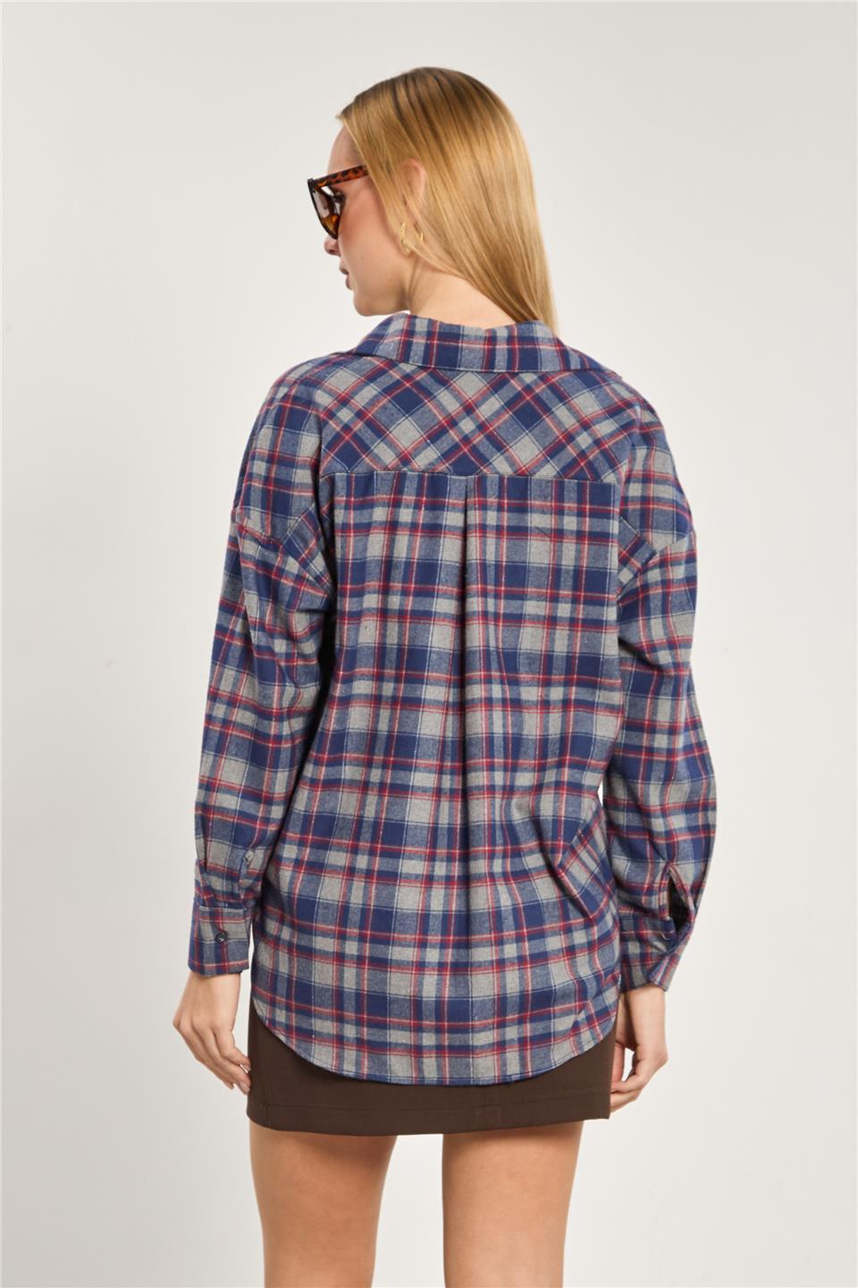 Kadın Ekose Desen Uzun Kol Gömlek - Antrasit/Lacivert