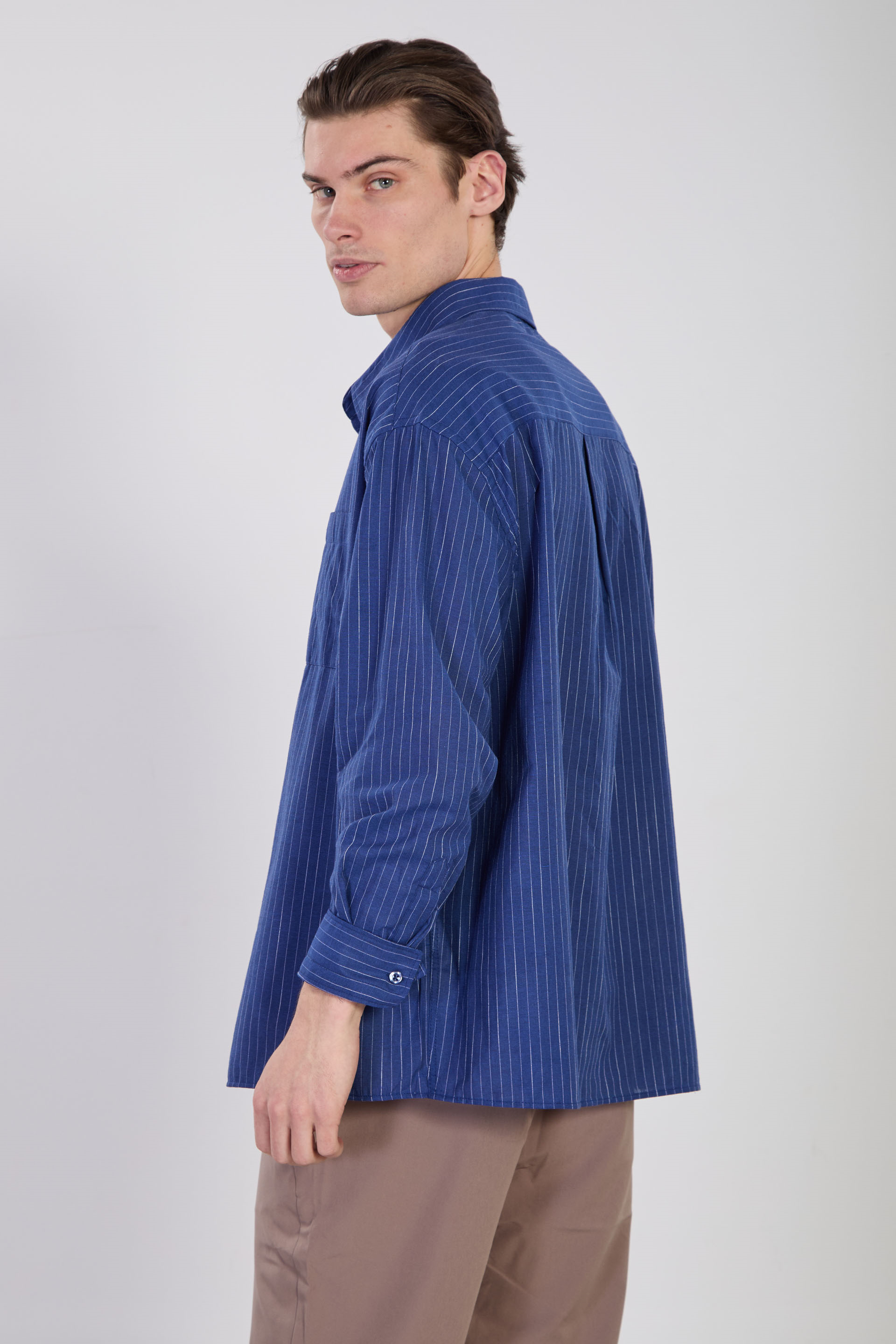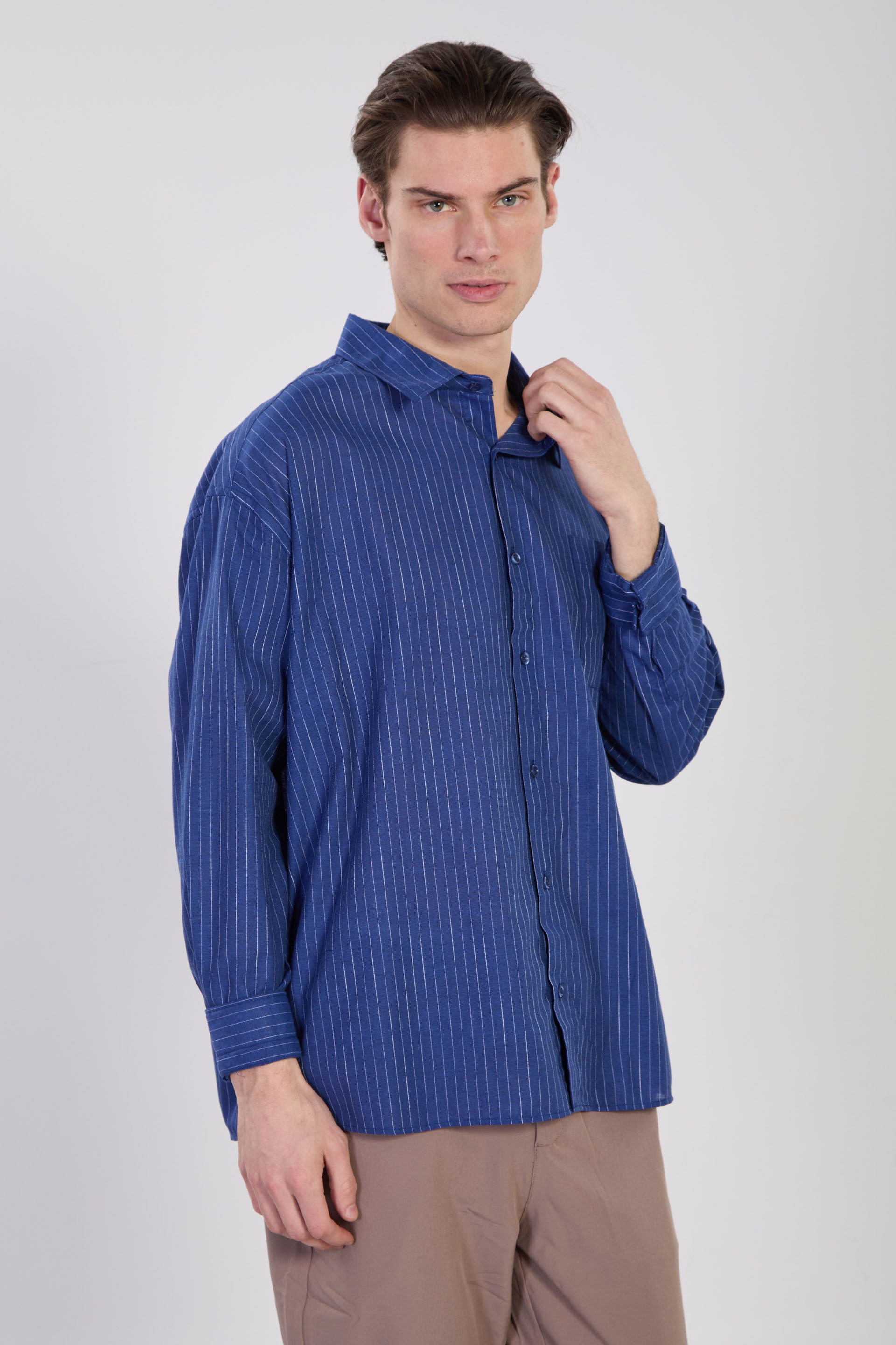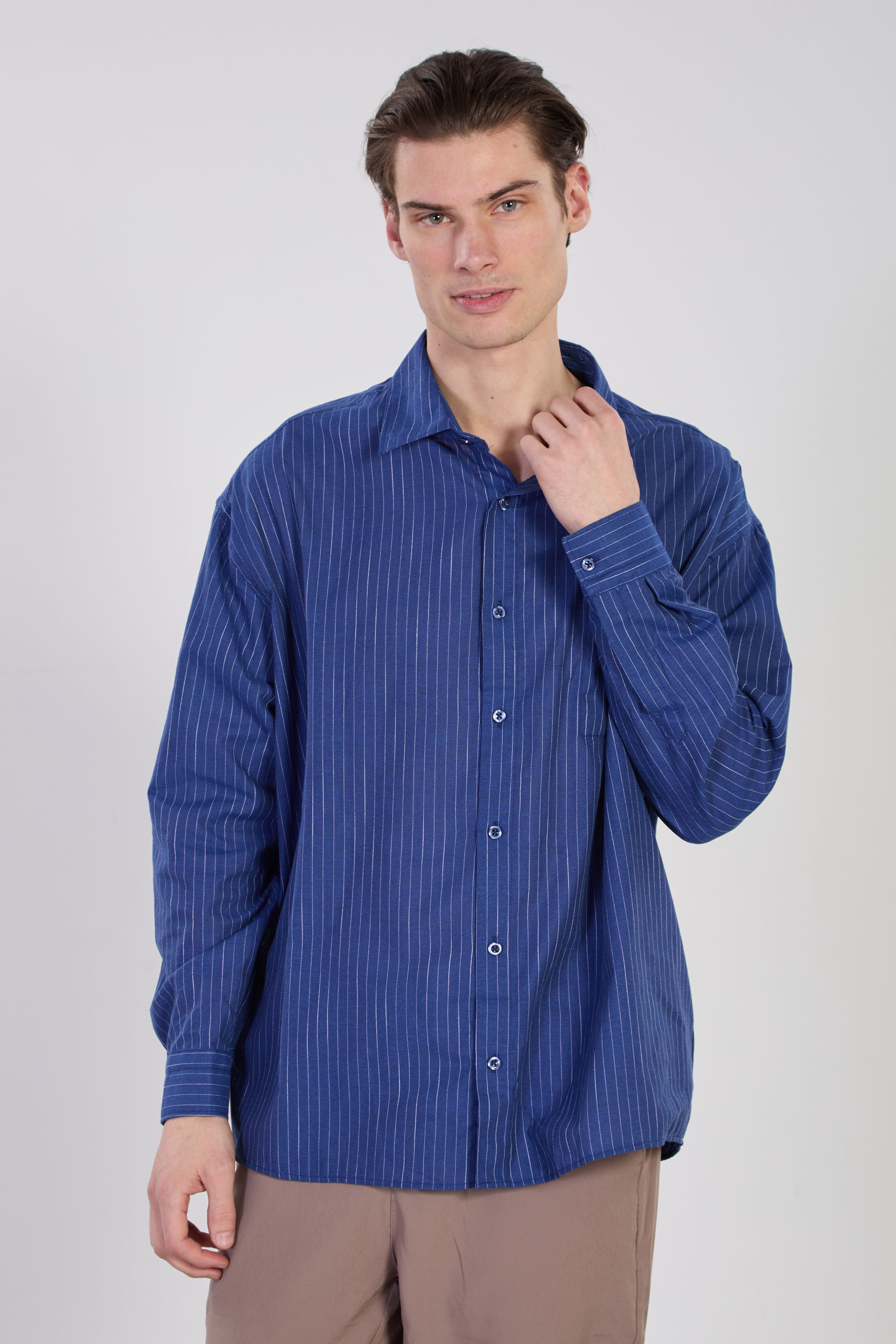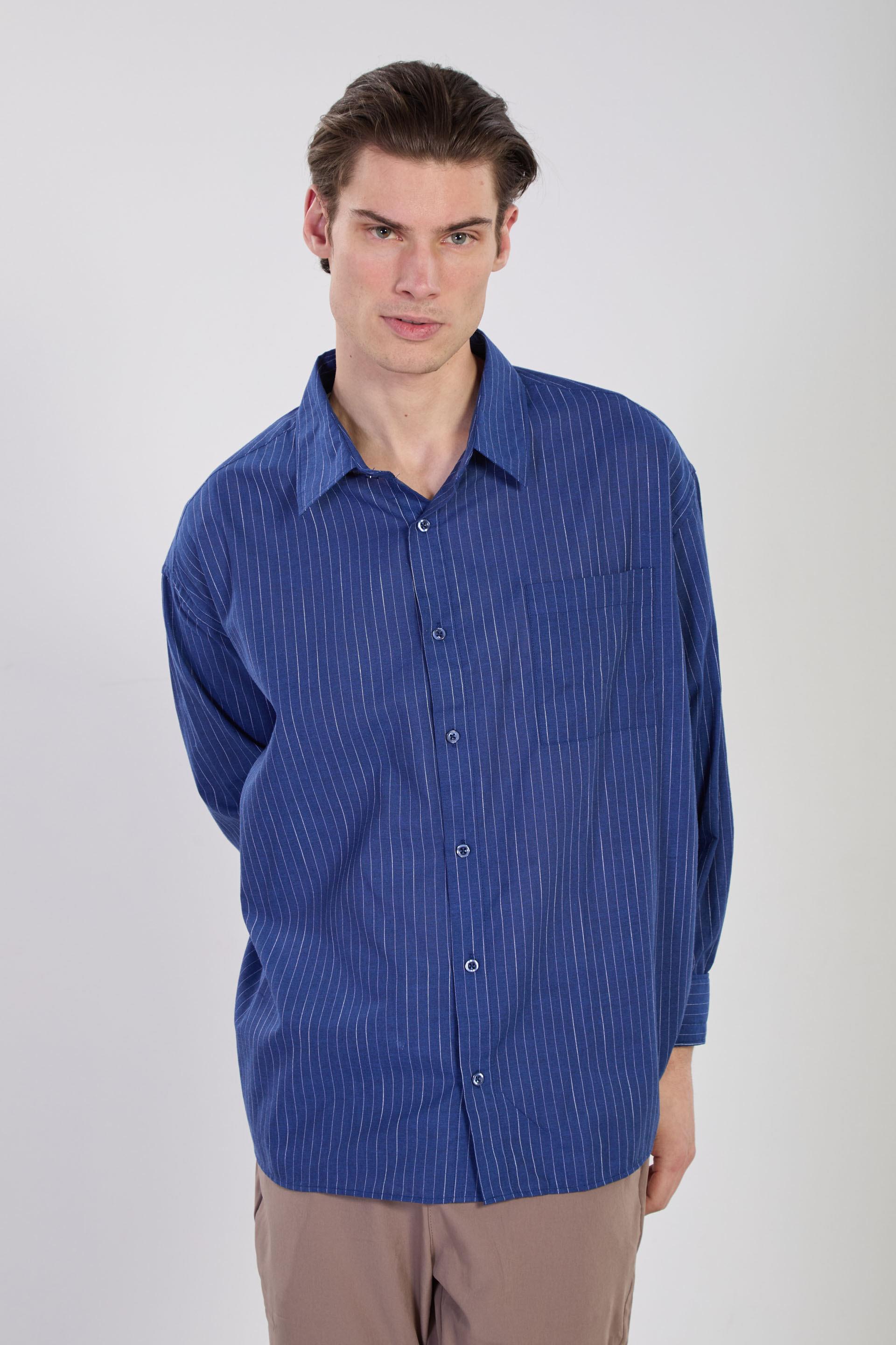 Erkek Çizgili Oversize Gömlek - Mavi