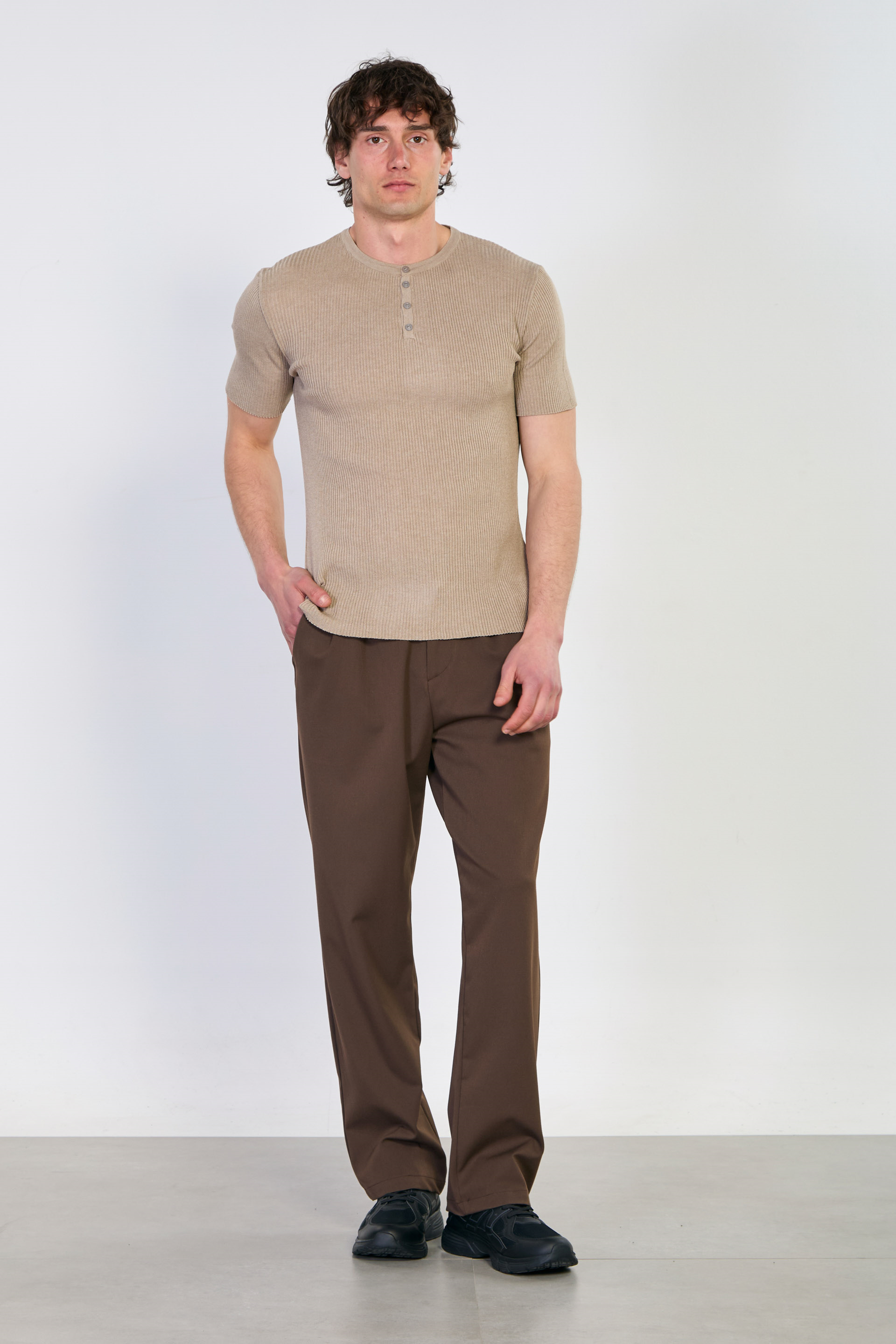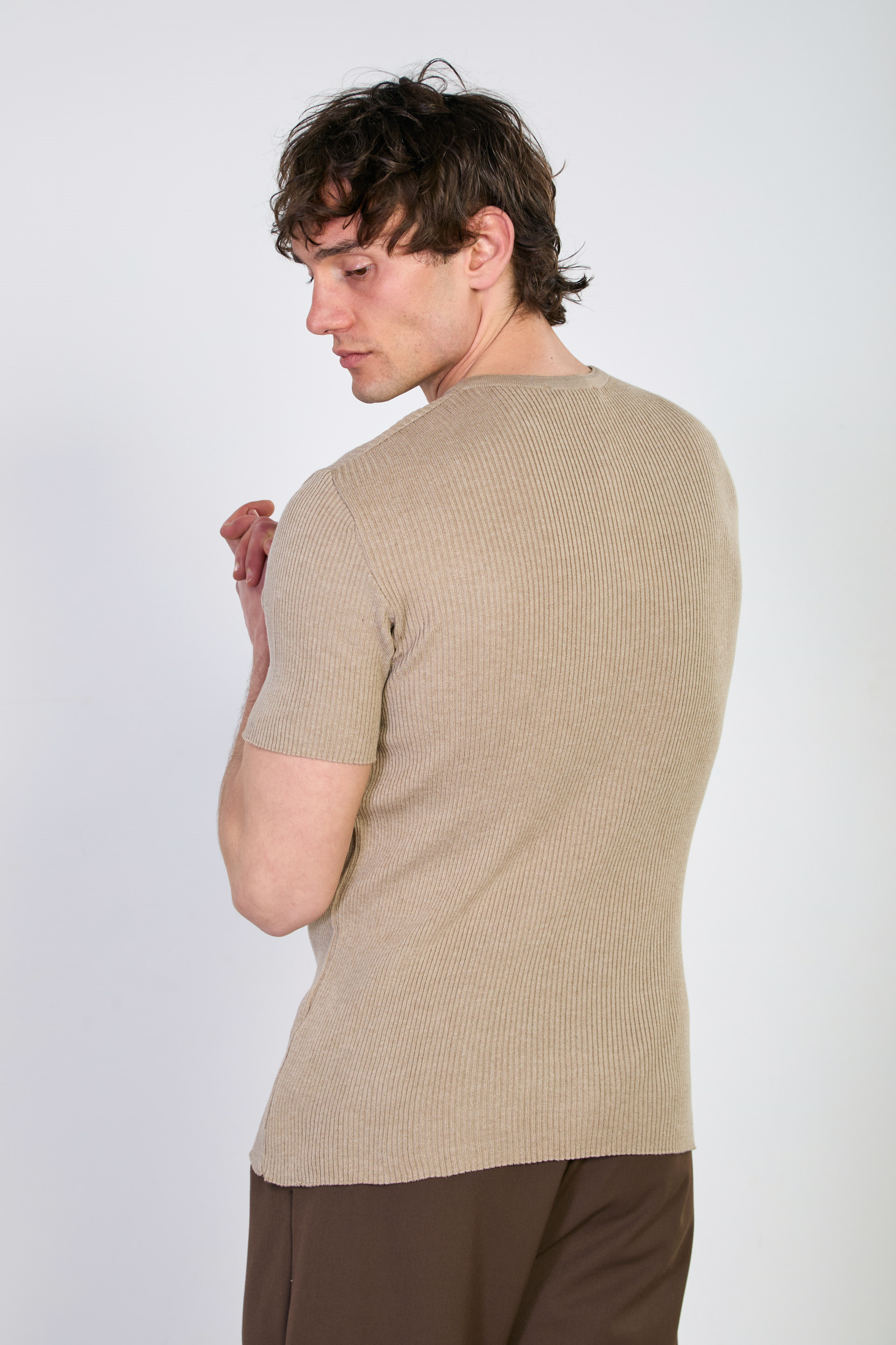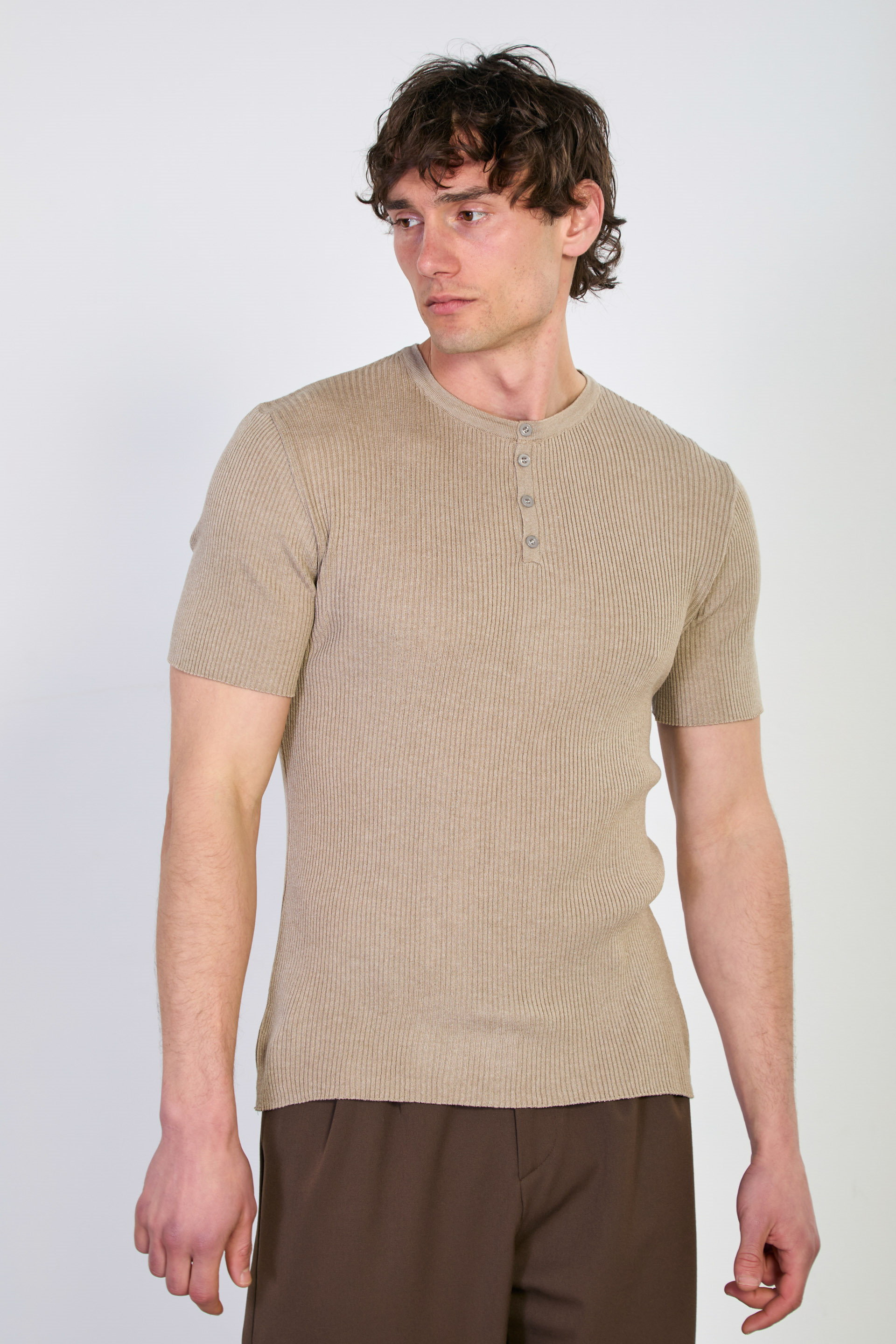 Erkek Düğmeli Kaşkorse Triko T-Shirt - Vizon