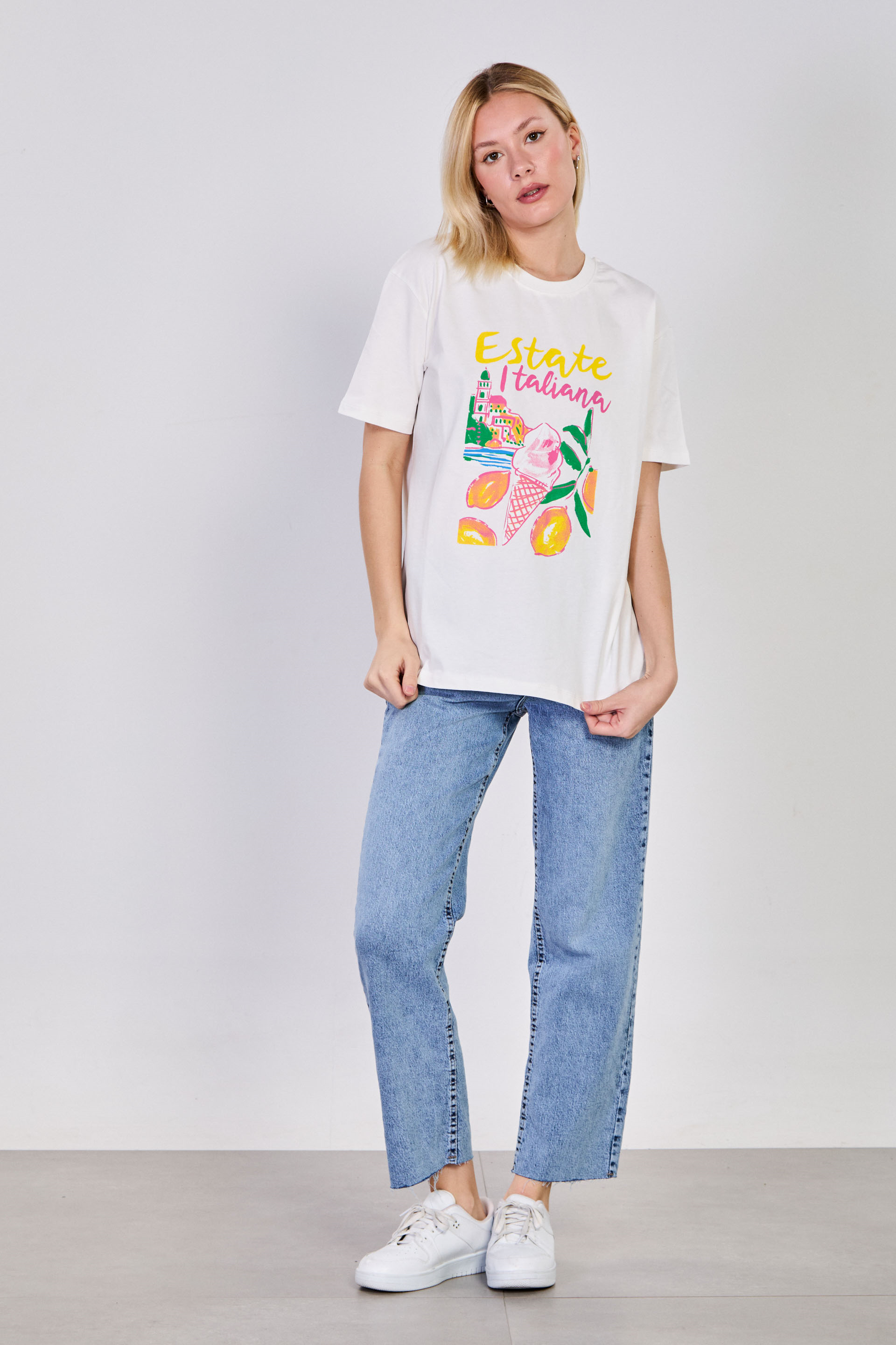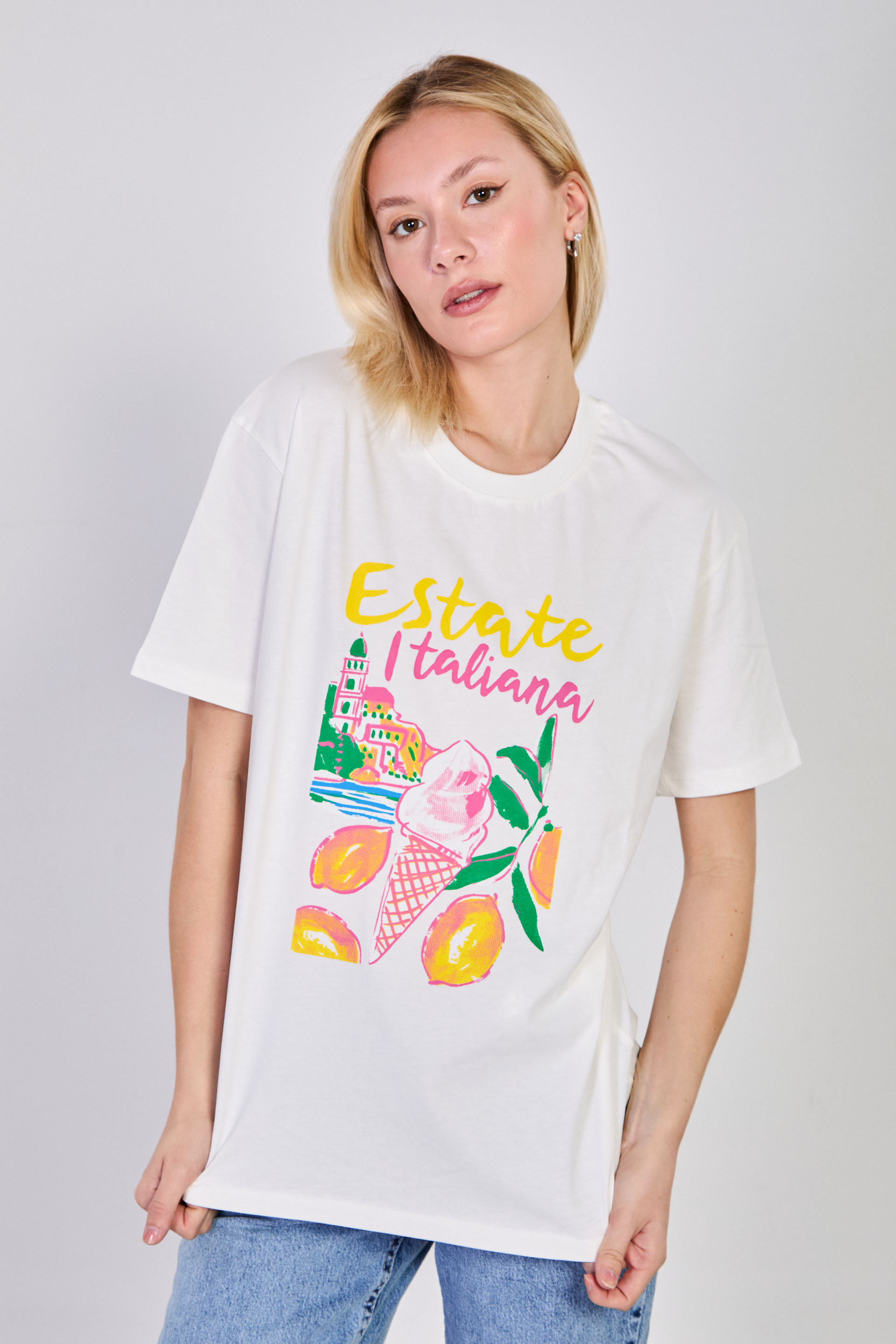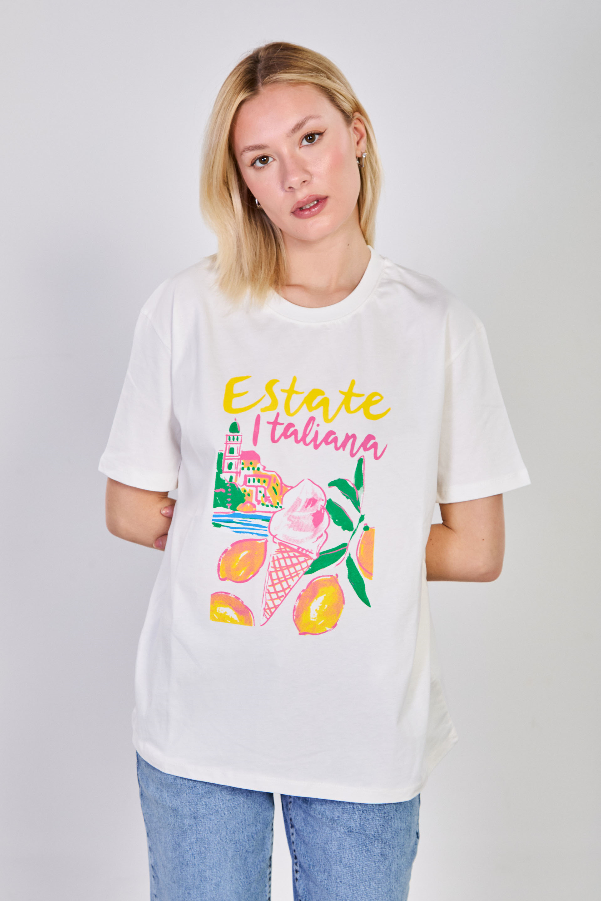 Kadın Estate Itiliana Baskılı T-Shirt - Ekru