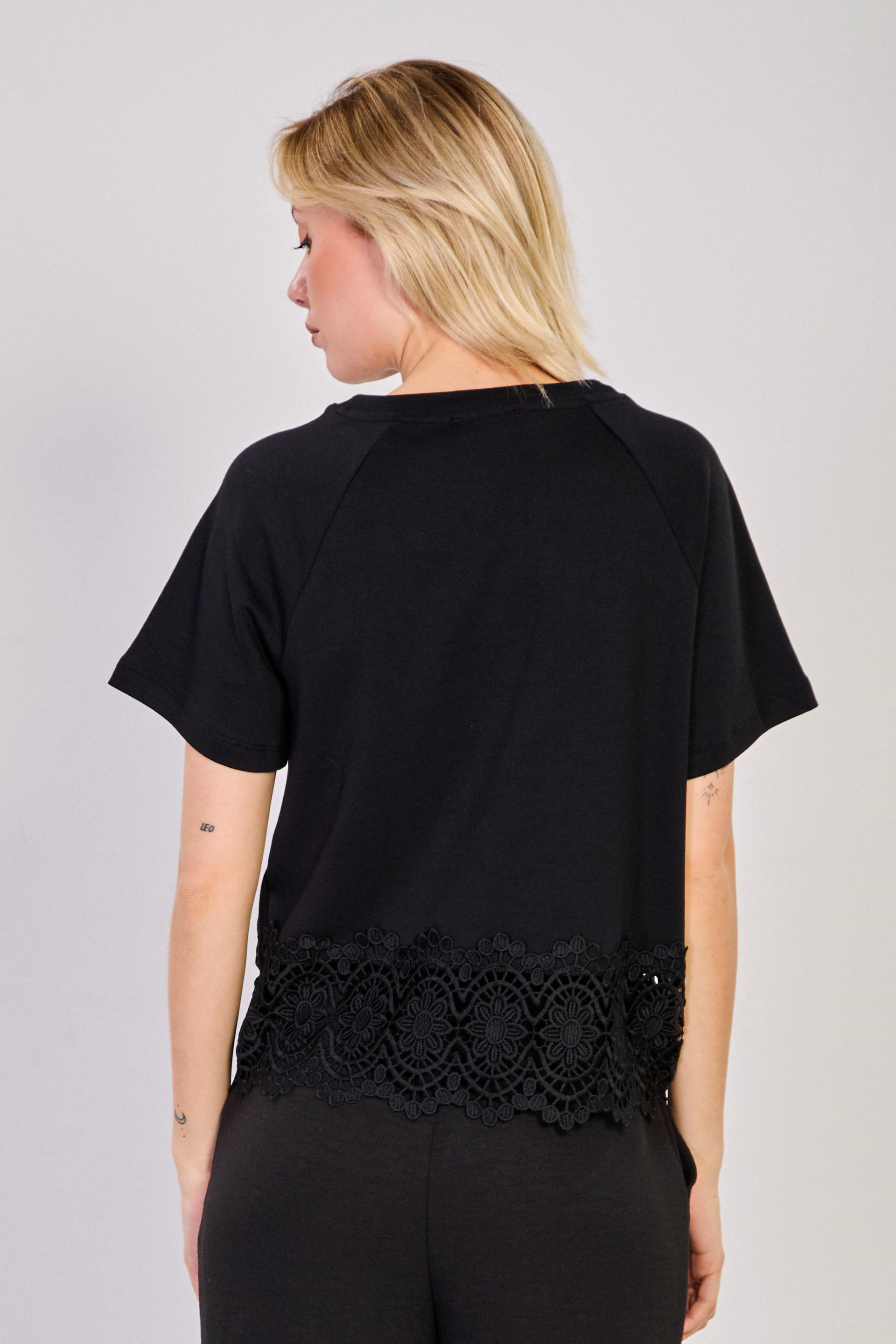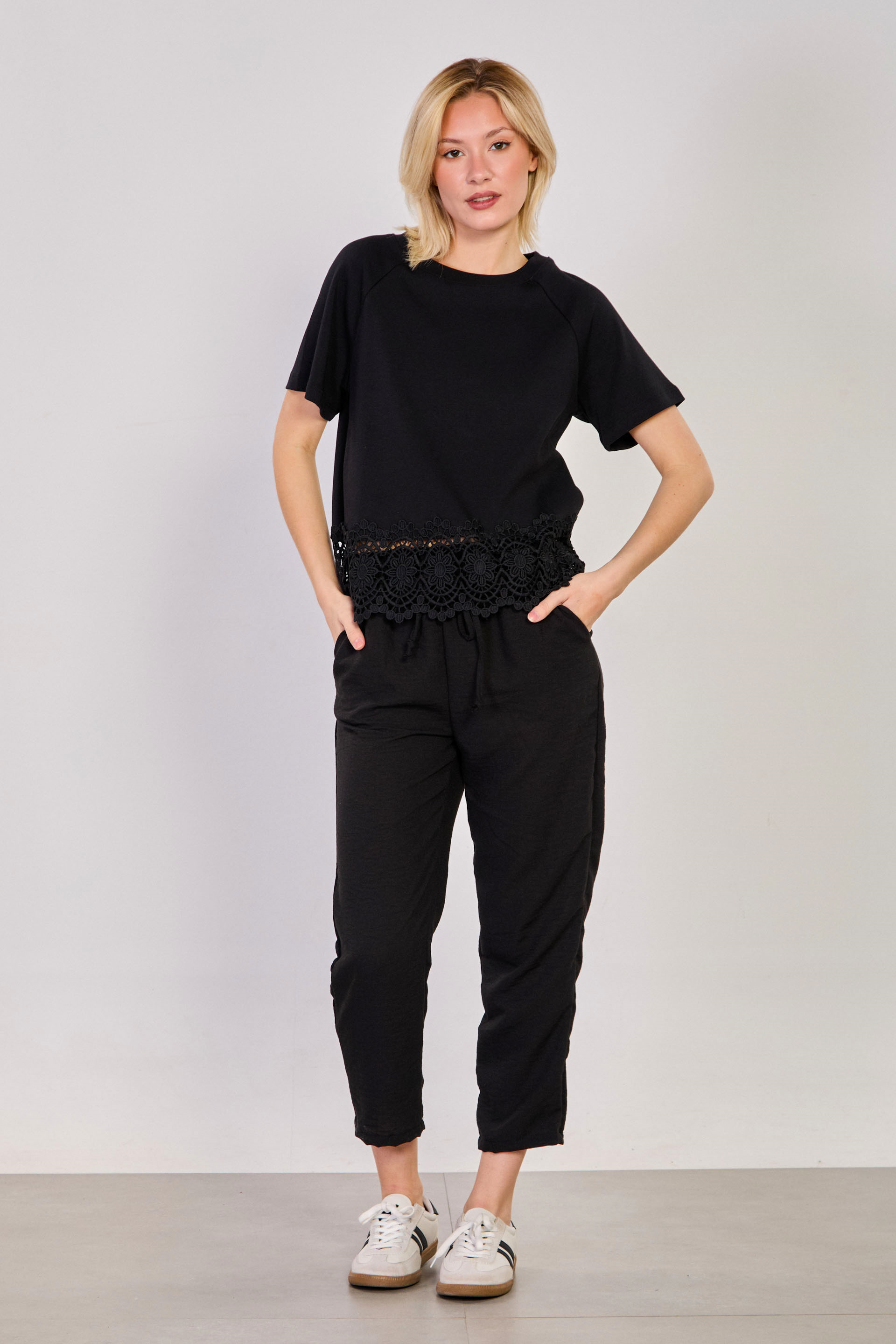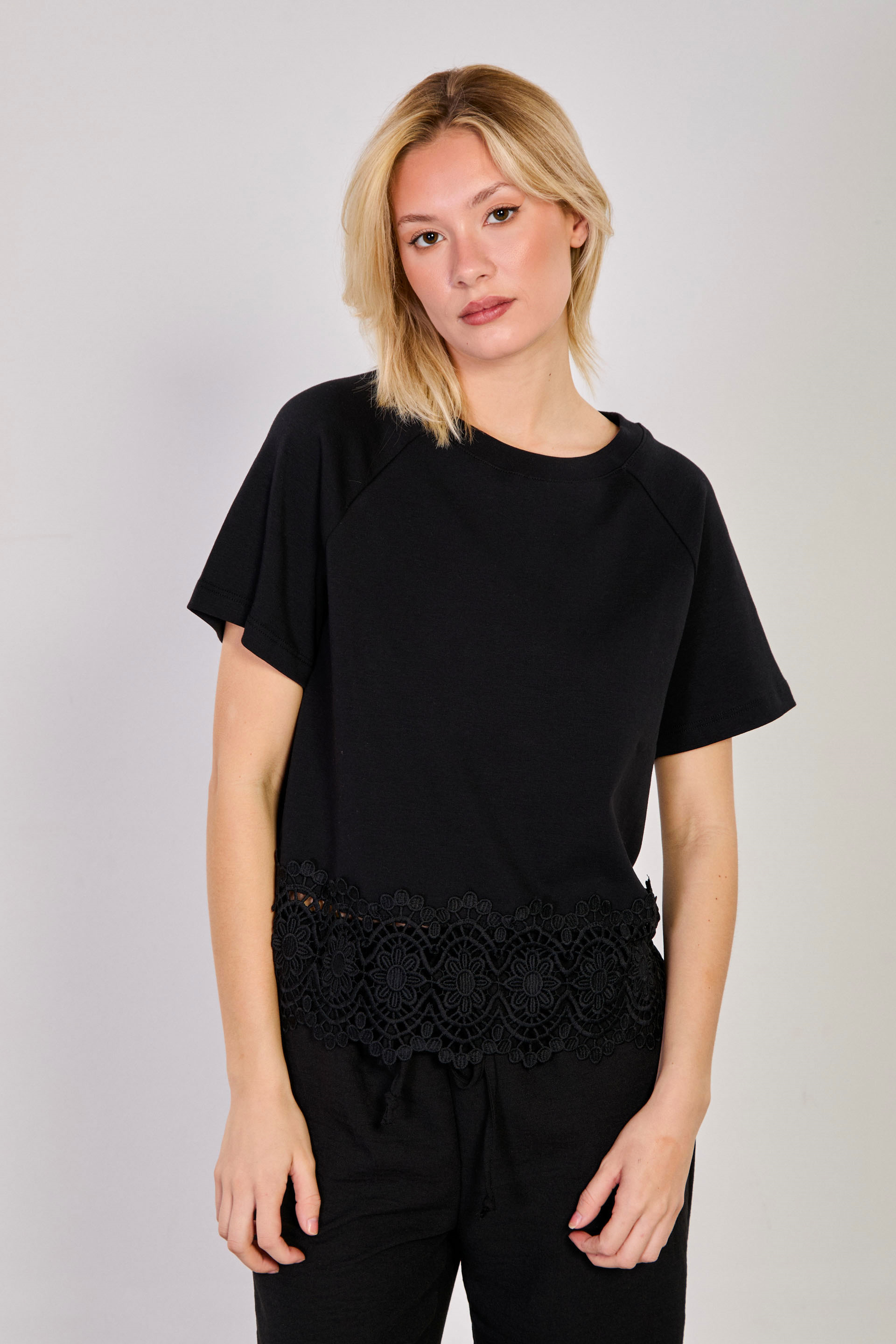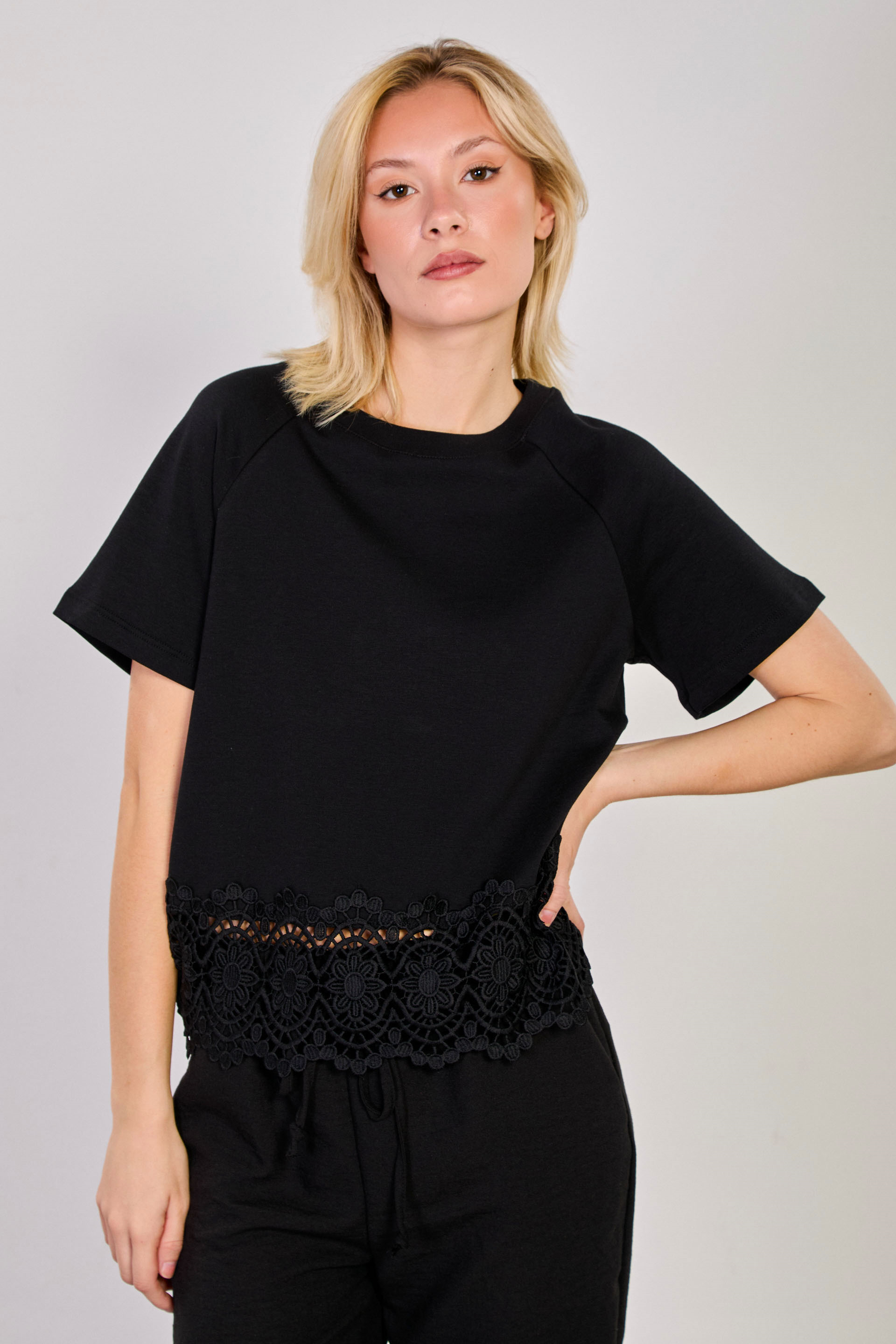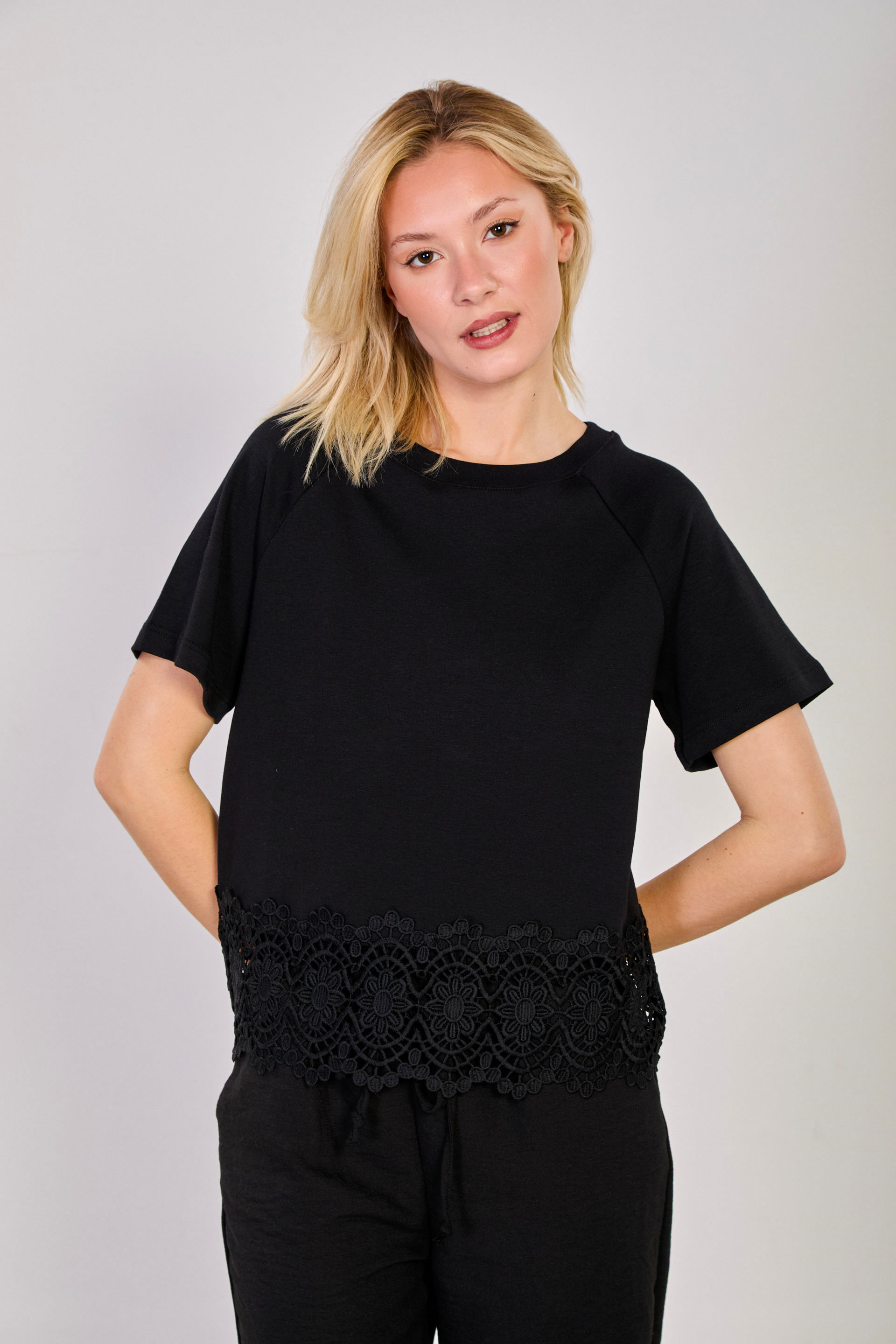 Kadın Etek Ucu Dantelli T-Shirt - Siyah
