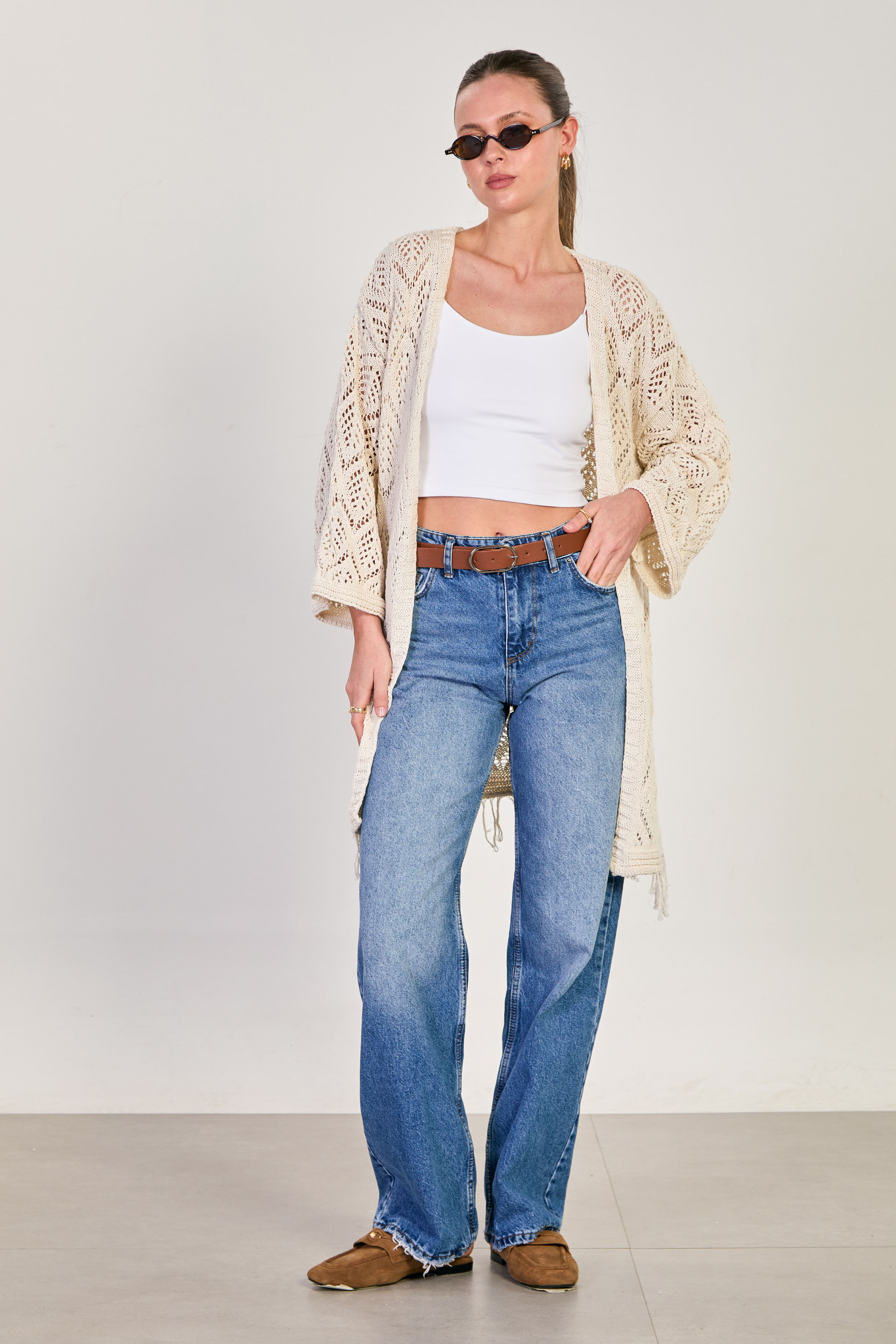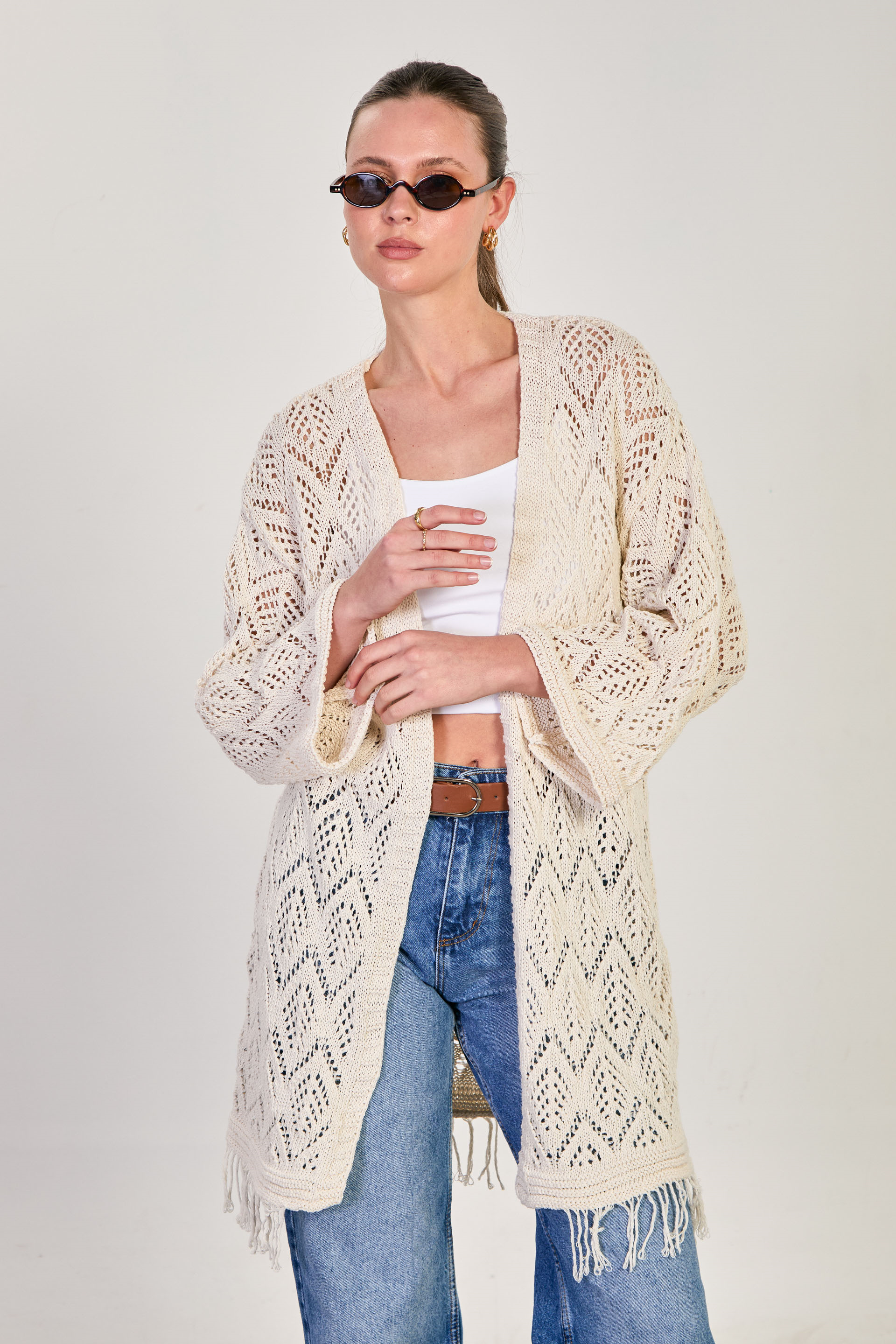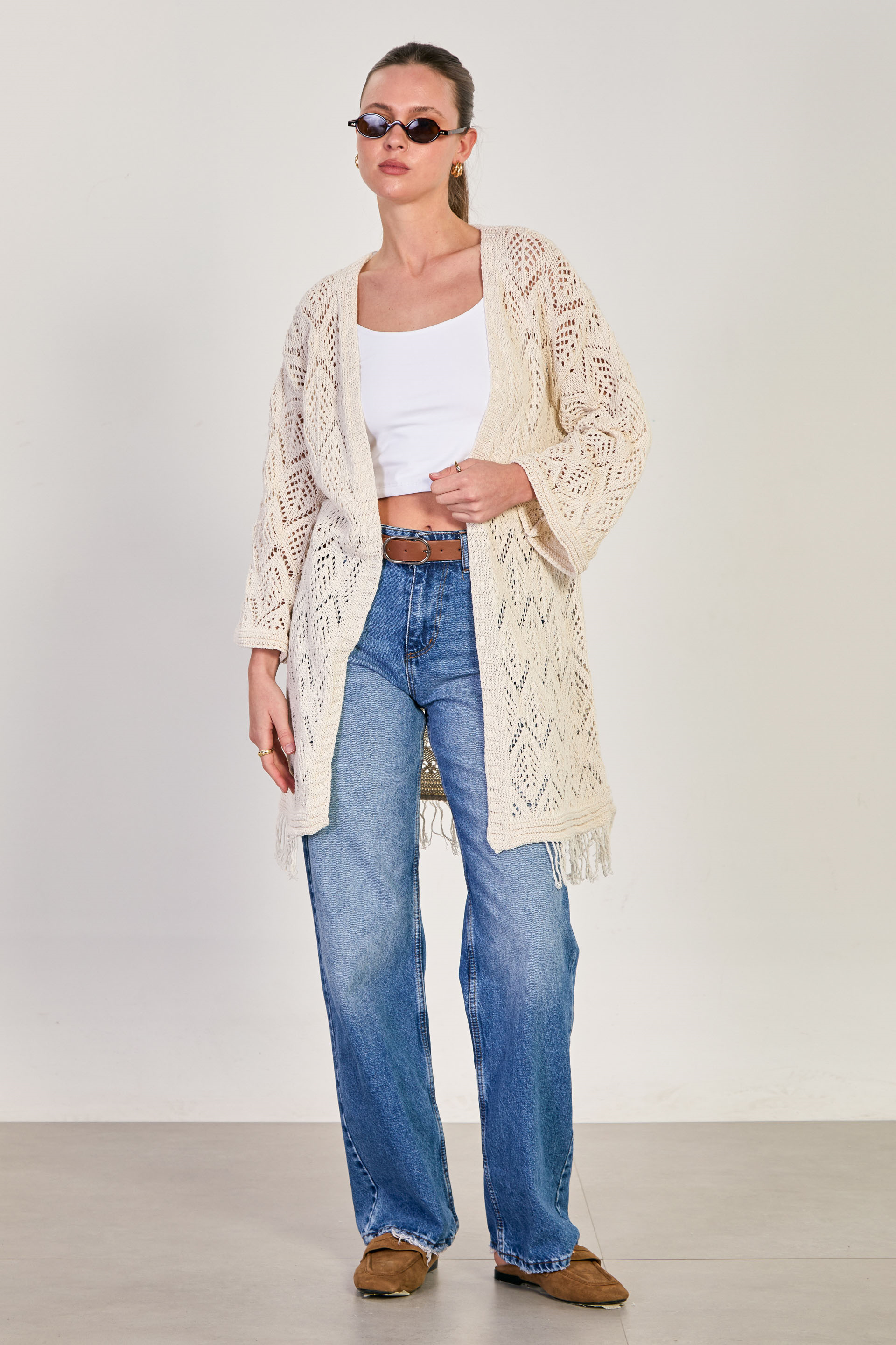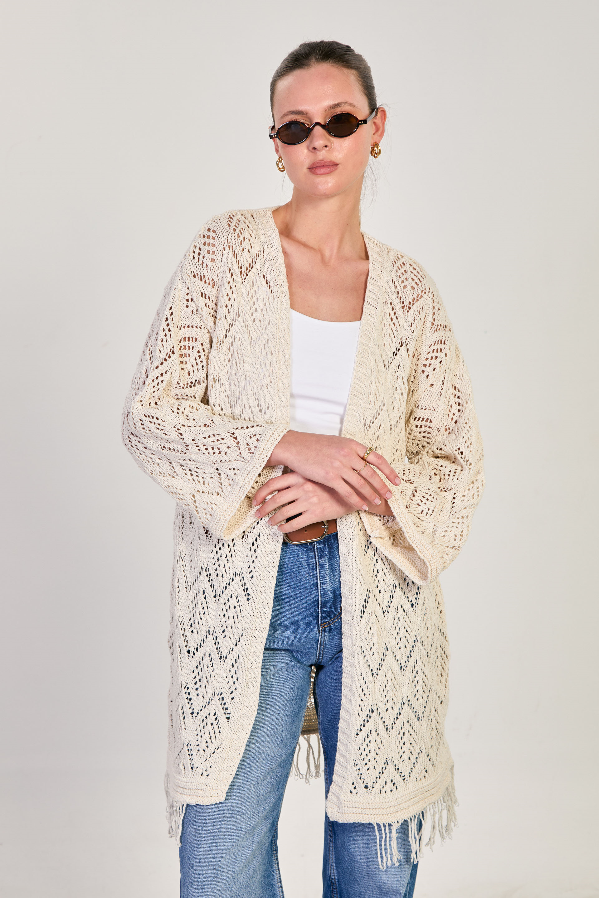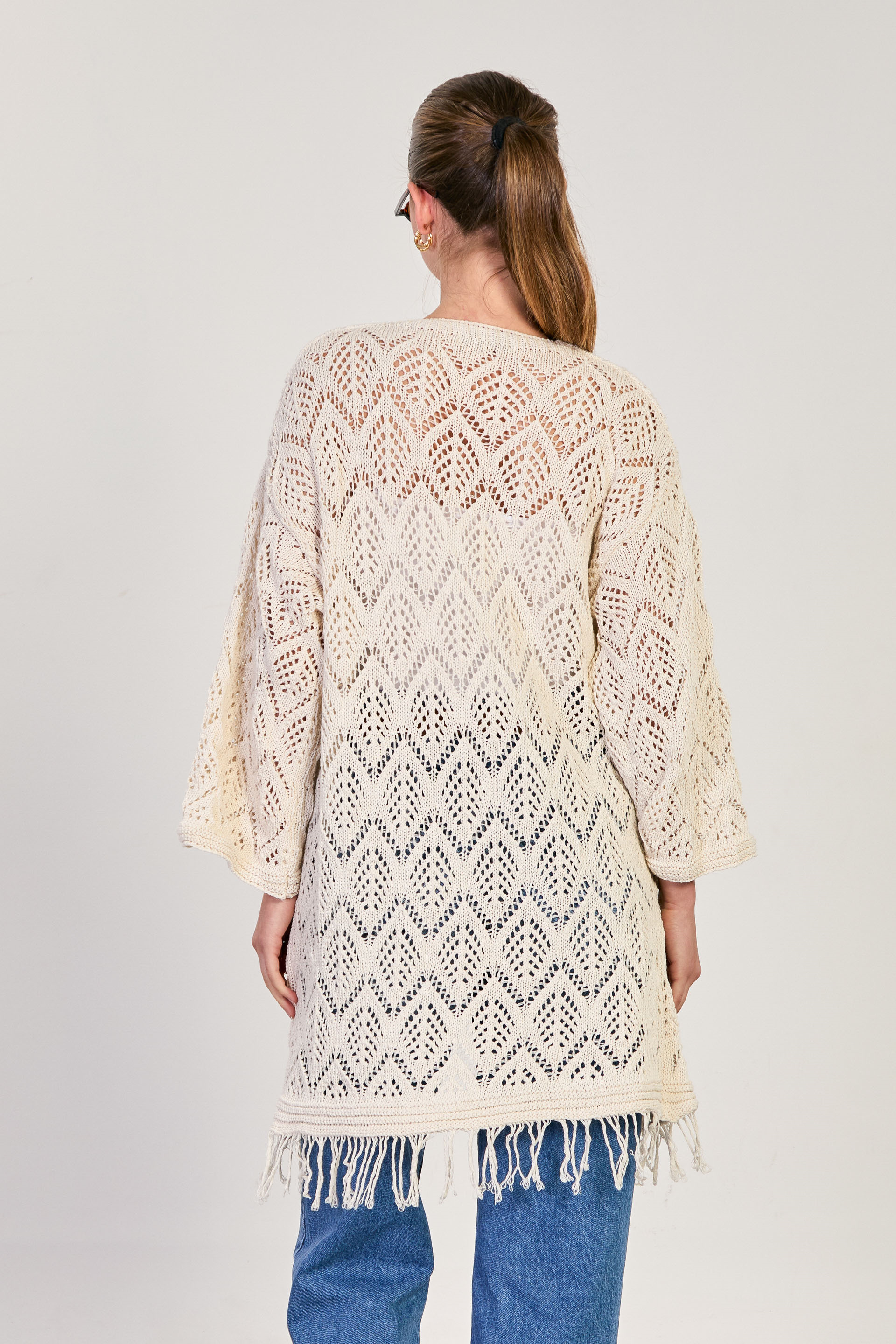 Kadın Etek Ucu Saçaklı Ajurlu Uzun Kol Hırka - Natural