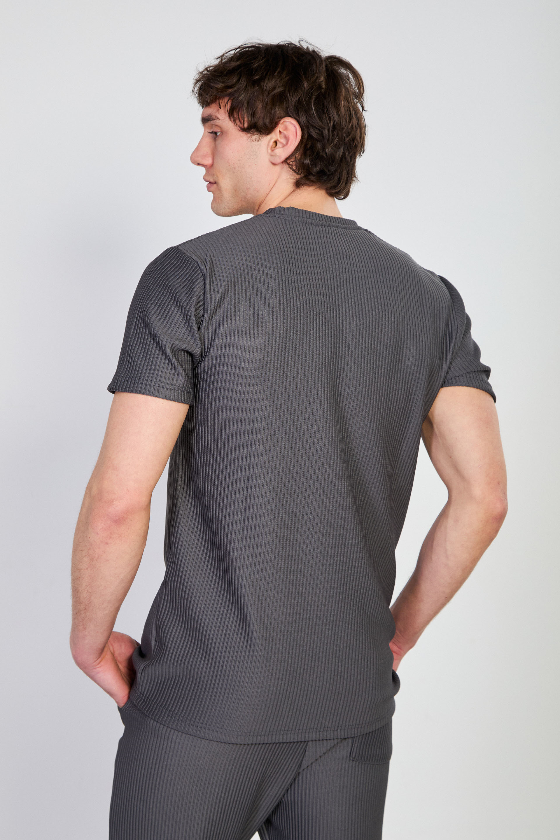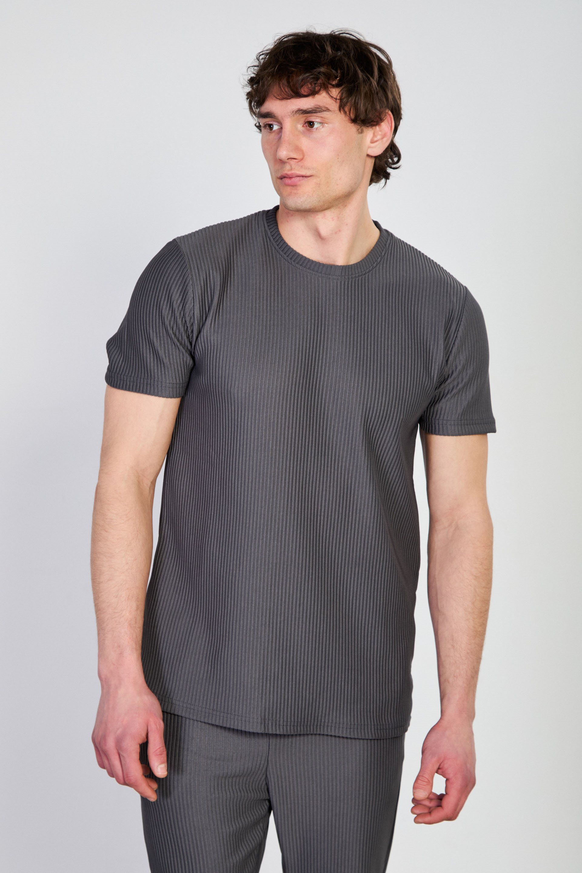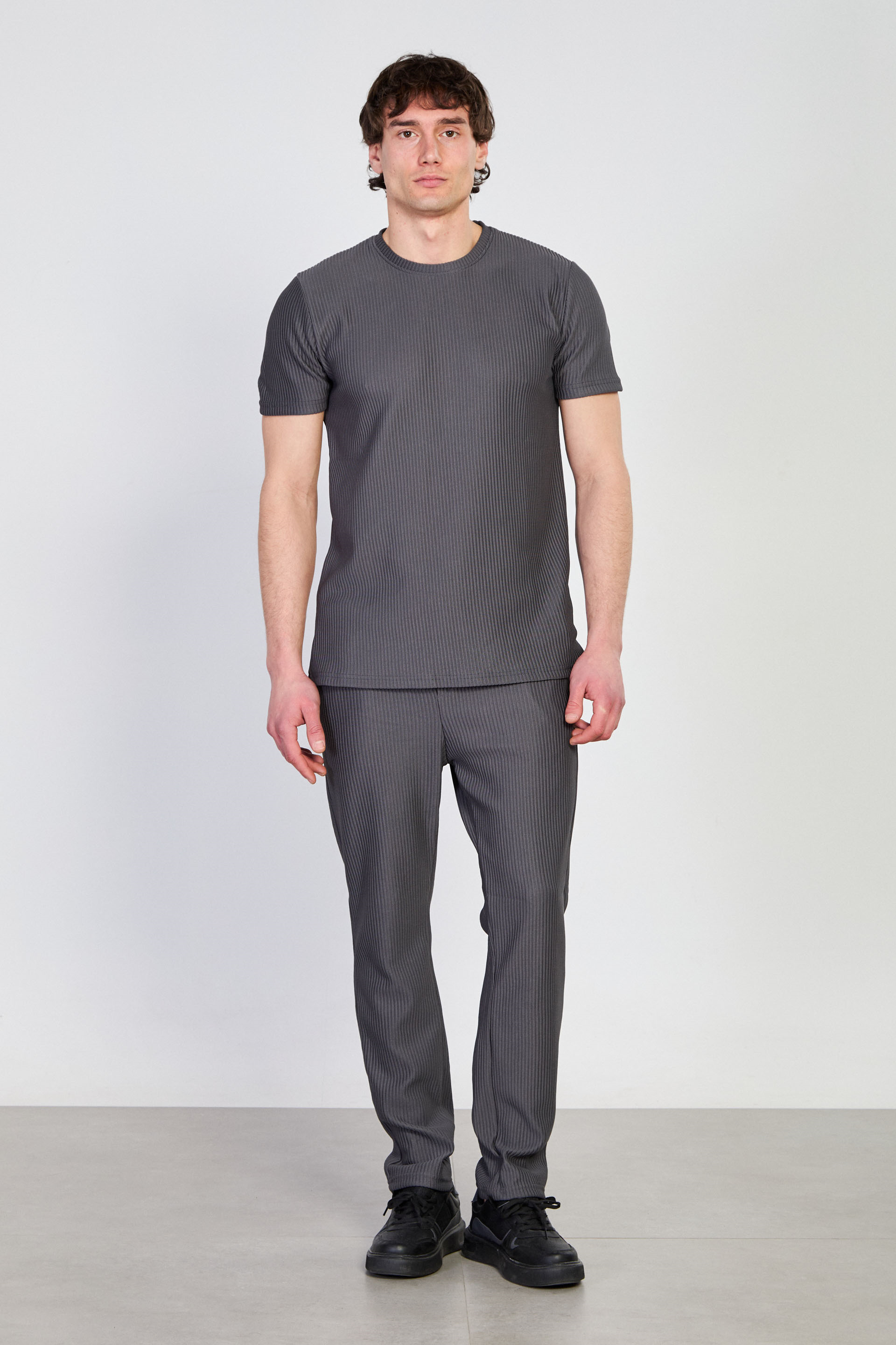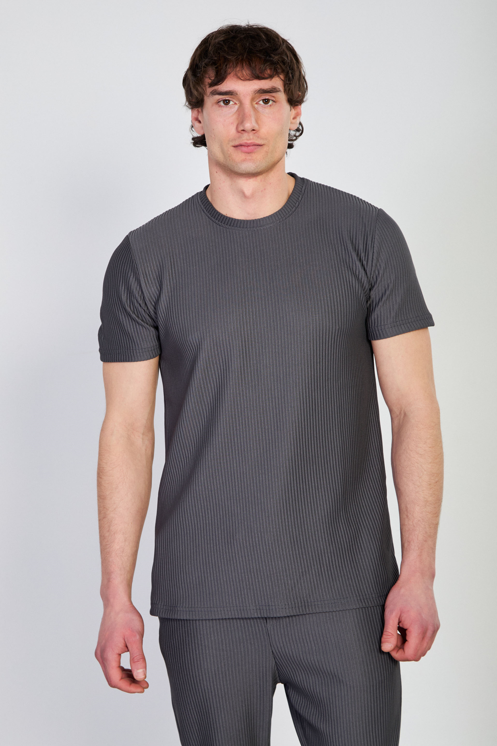 Erkek Fitilli Bisiklet Yaka T-Shirt - Füme
