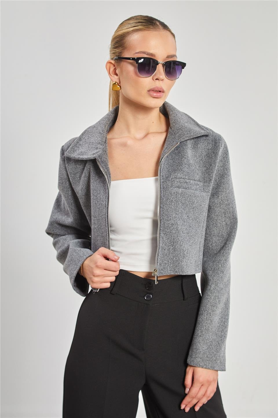 Kadın Fleto Kaşe Crop Ceket - Açık Gri