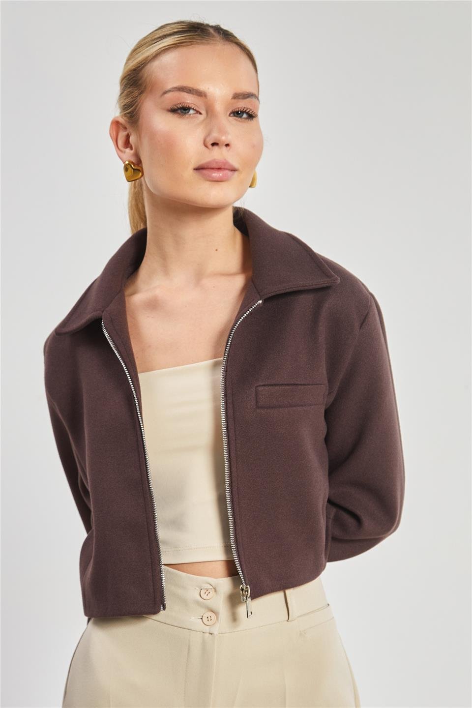 Kadın Fleto Cep Kaşe Crop Ceket - Kahve