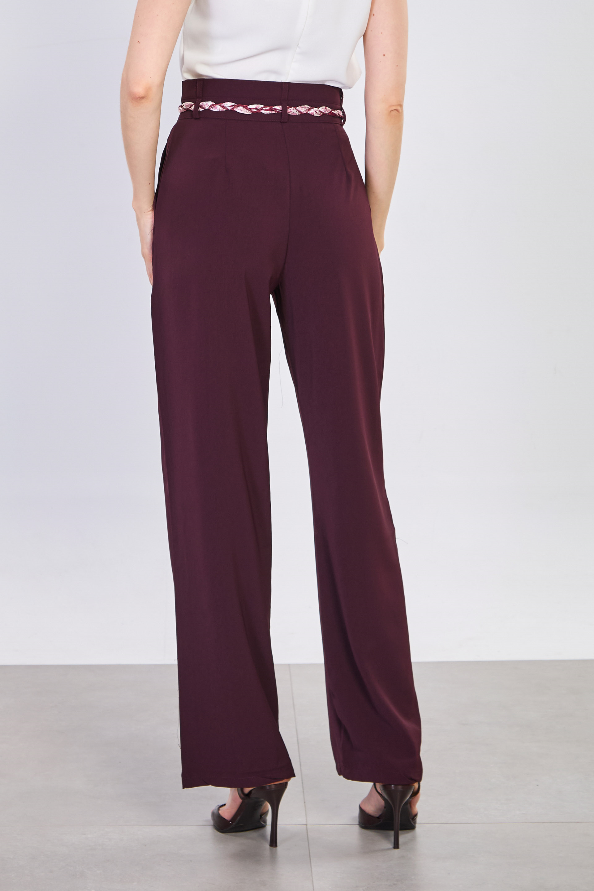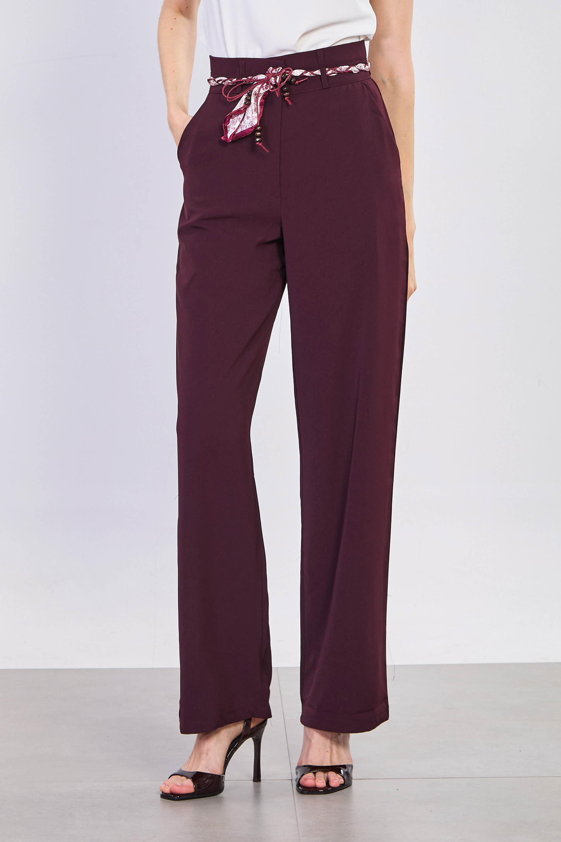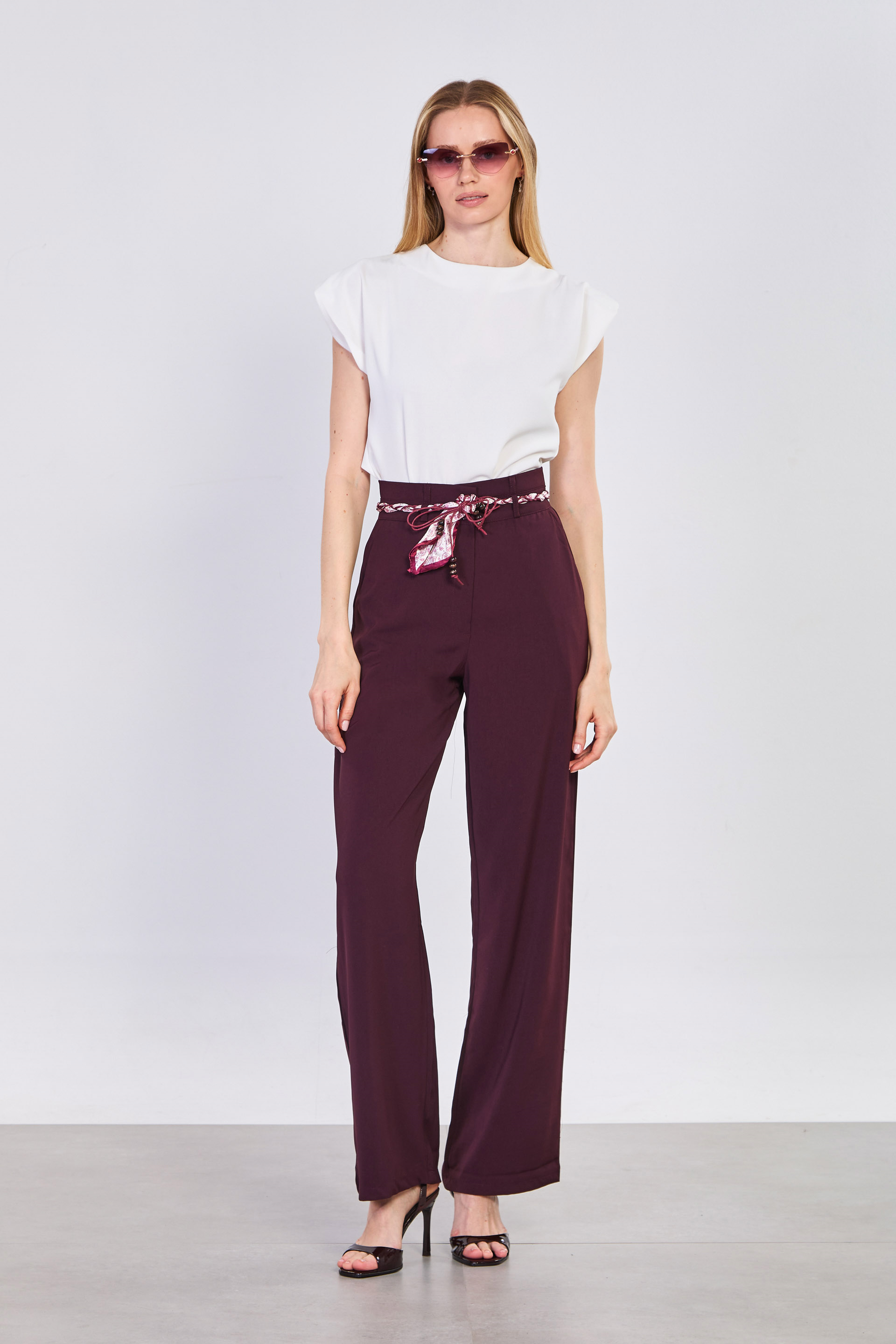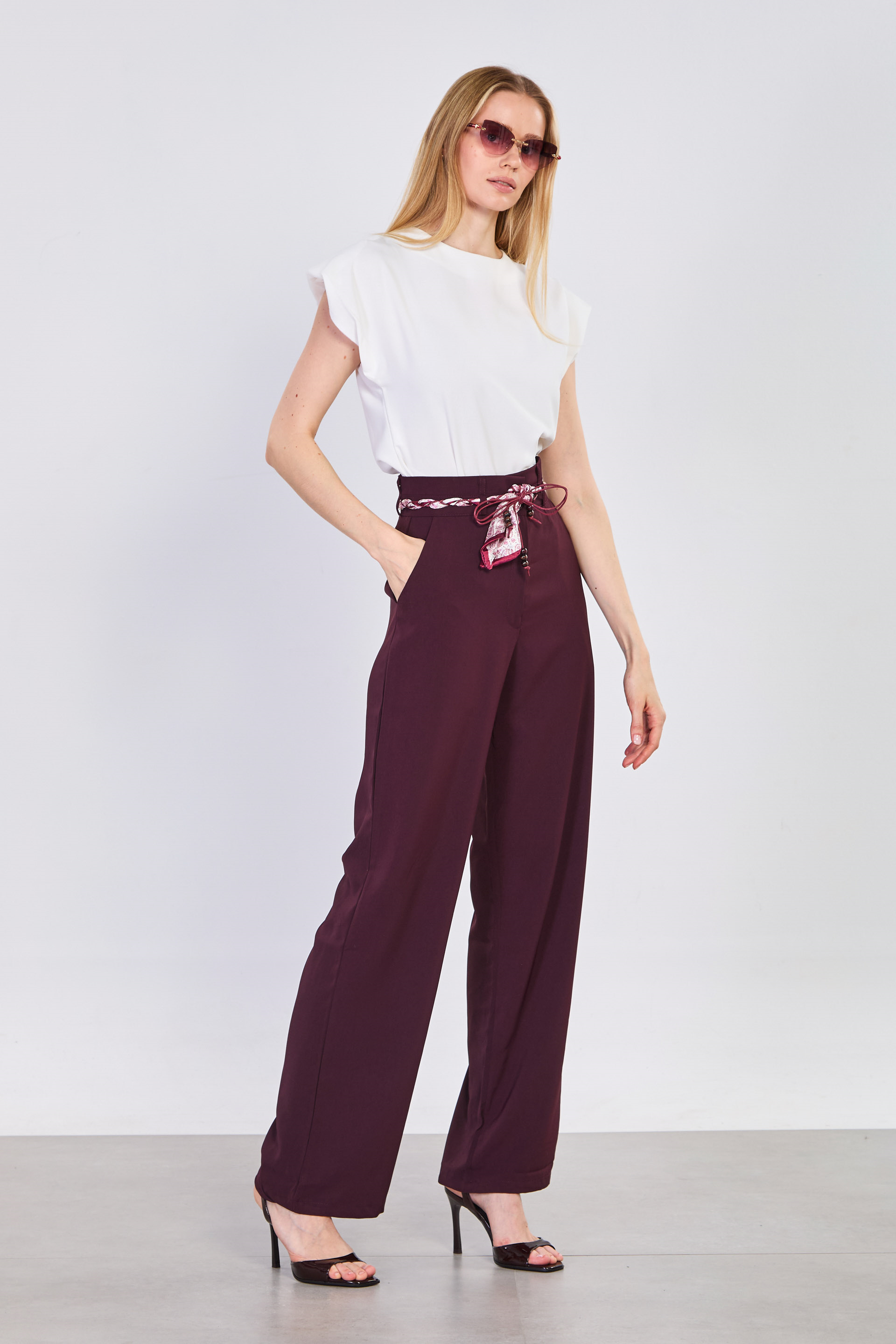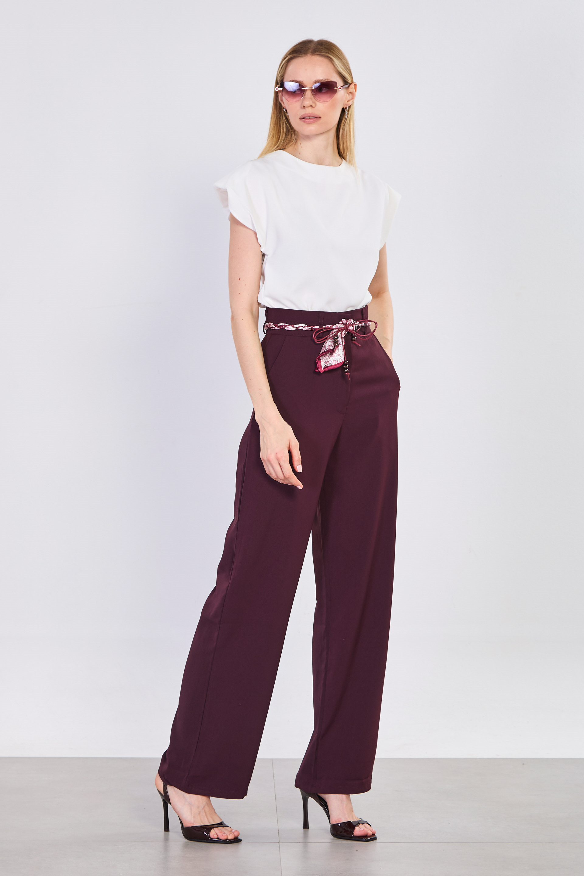 Kadın Fularlı Dökümlü Bol Pantolon - Mürdüm