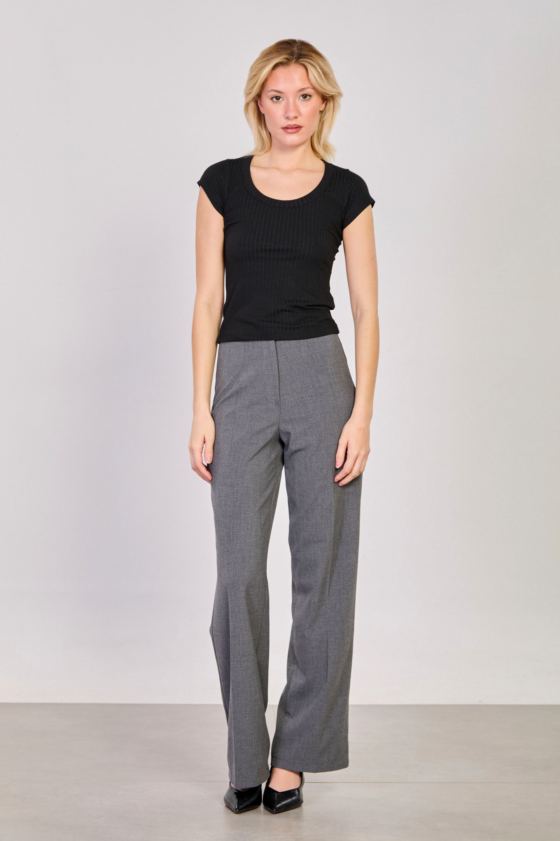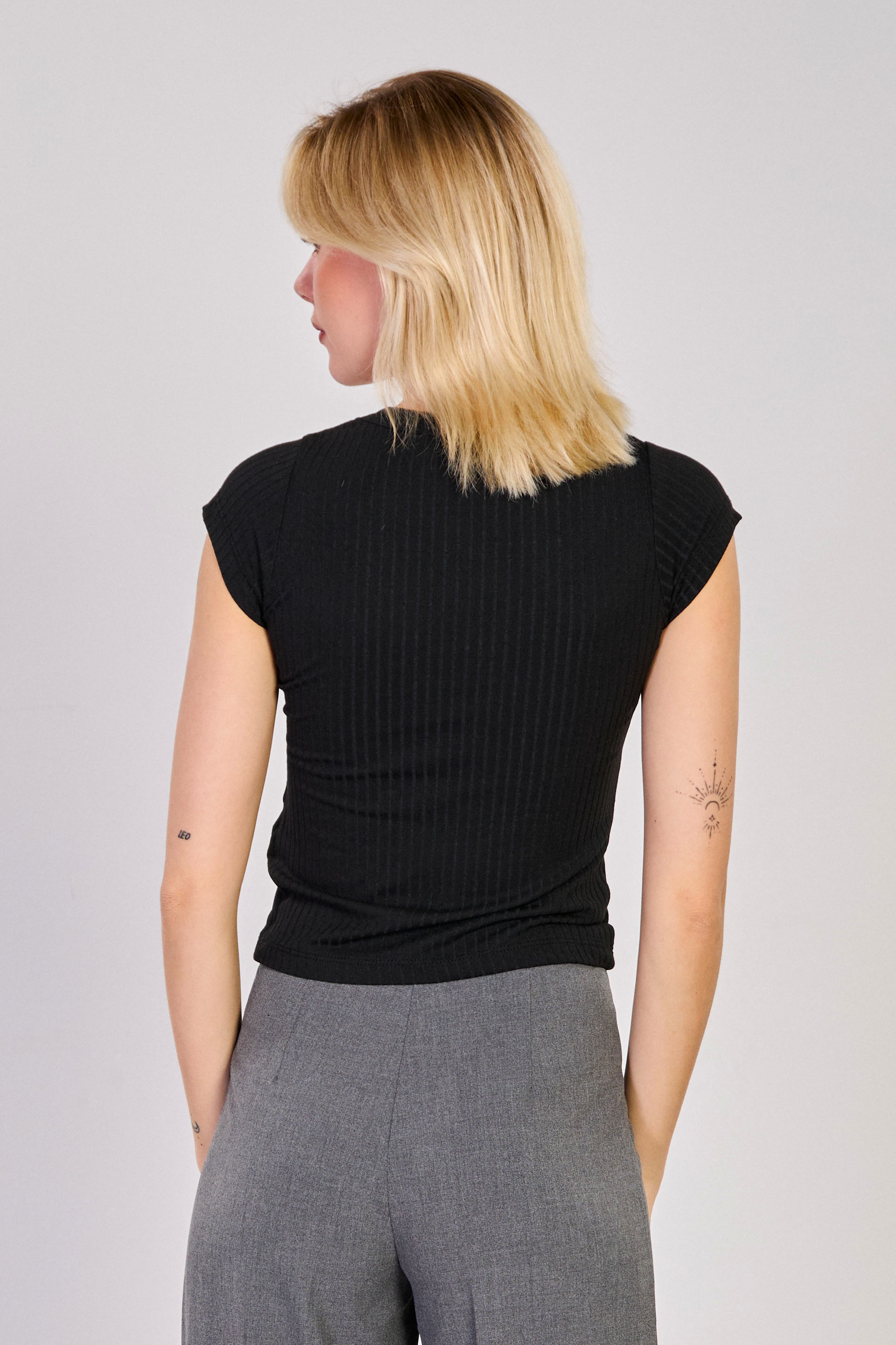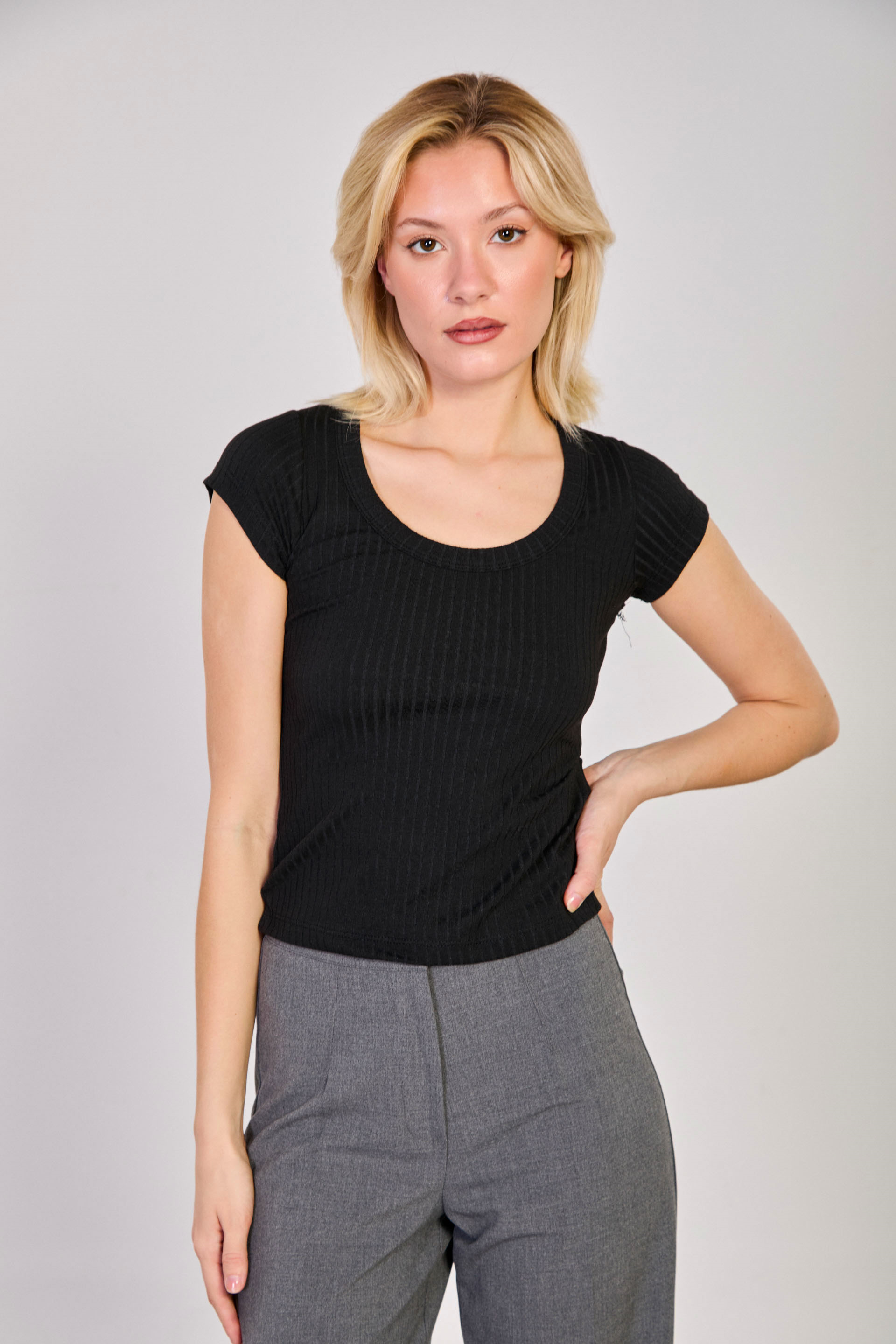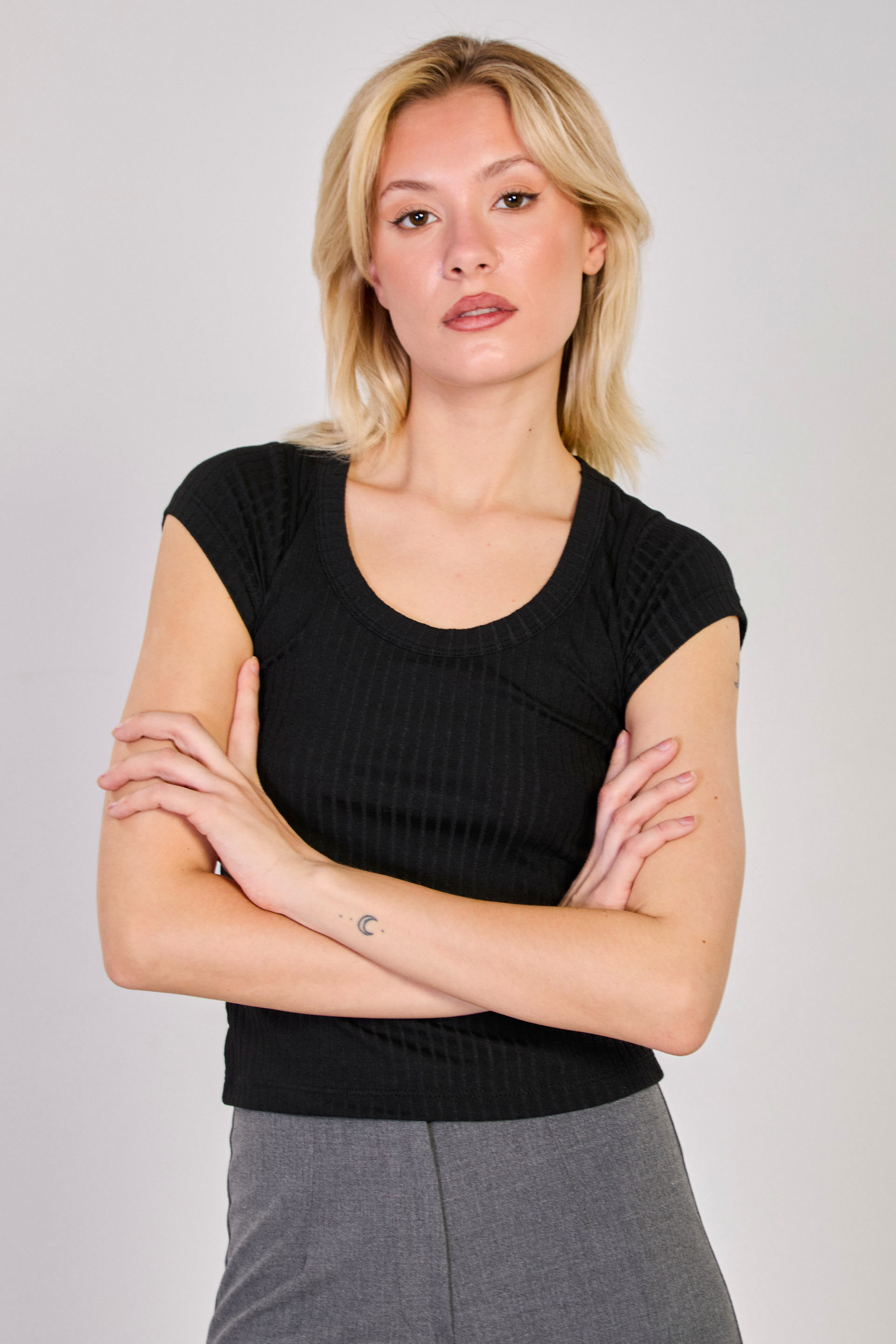 Geniş Yaka Kısa Kol Fitilli Body - Siyah