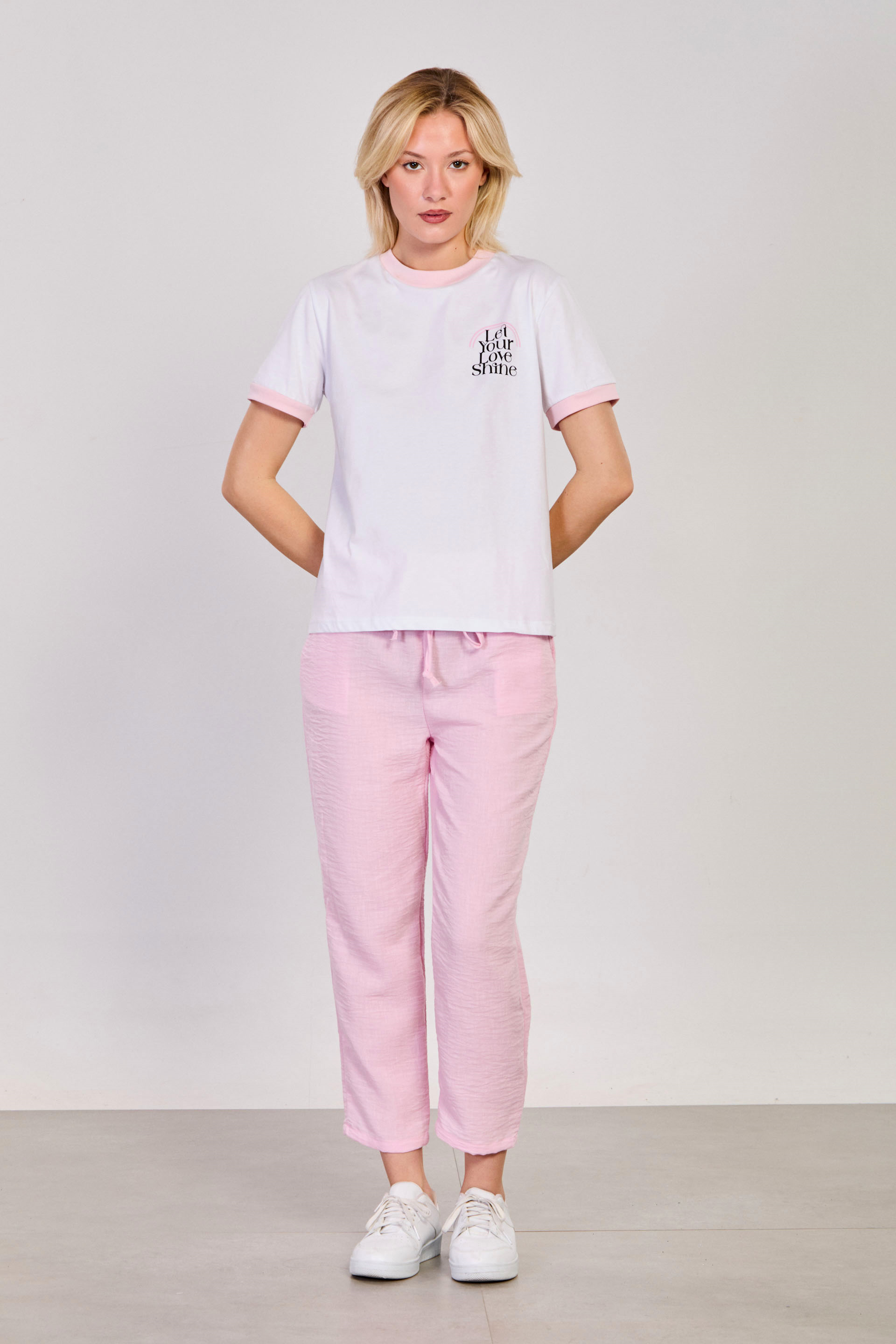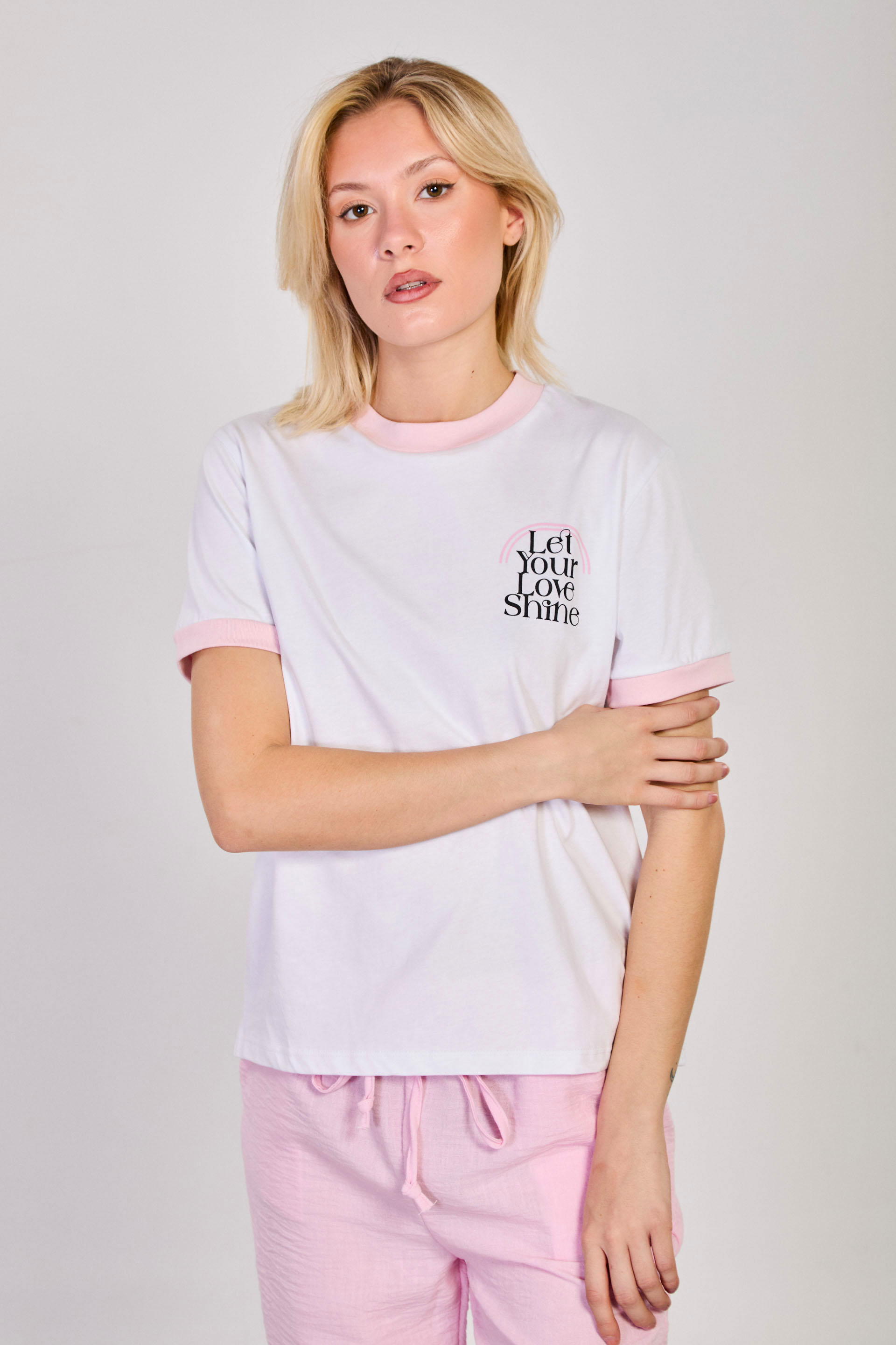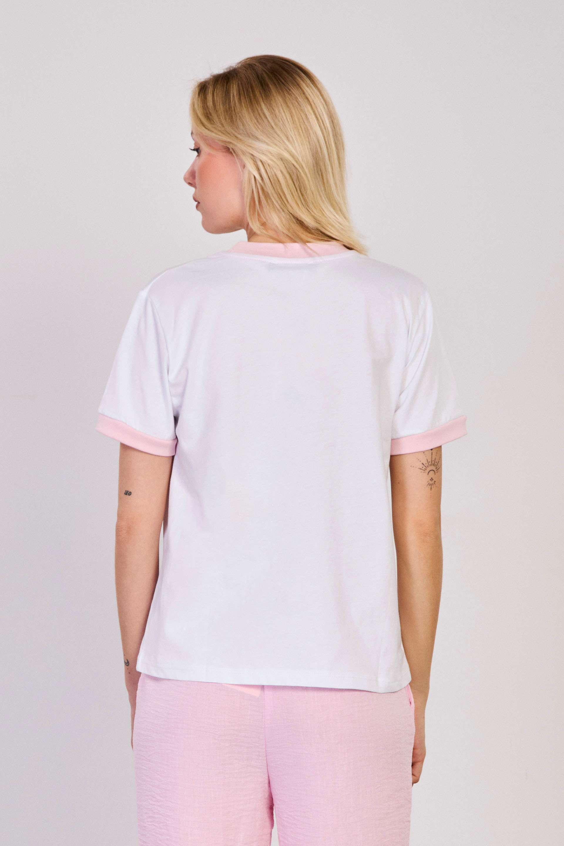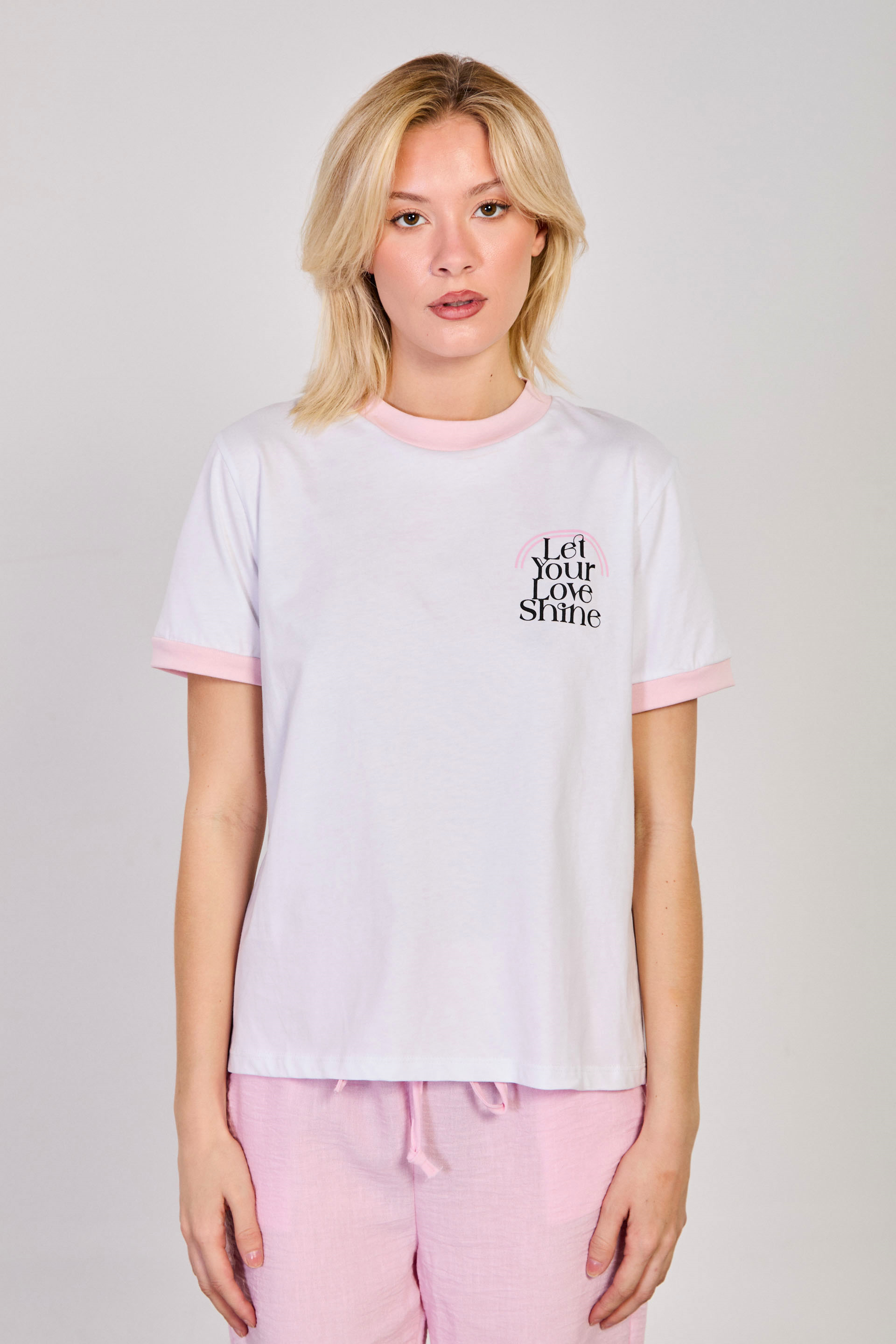 Kadın Göğsü Yazı Baskılı Garnili T-Shirt - Beyaz/Pembe