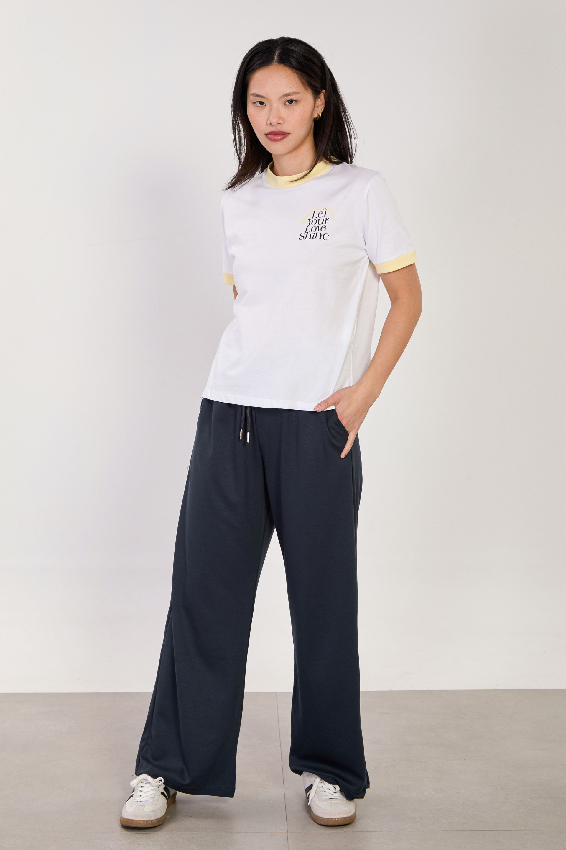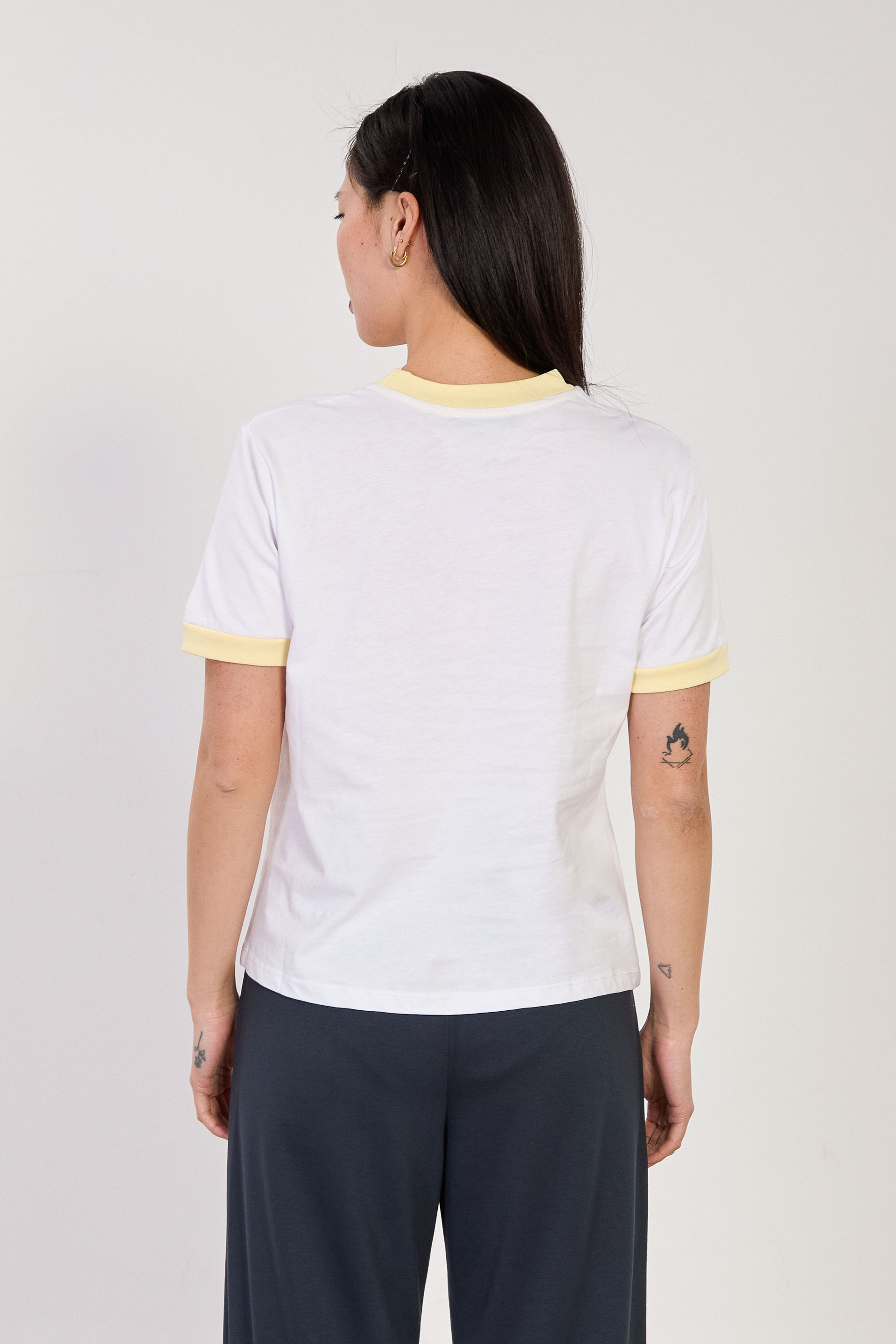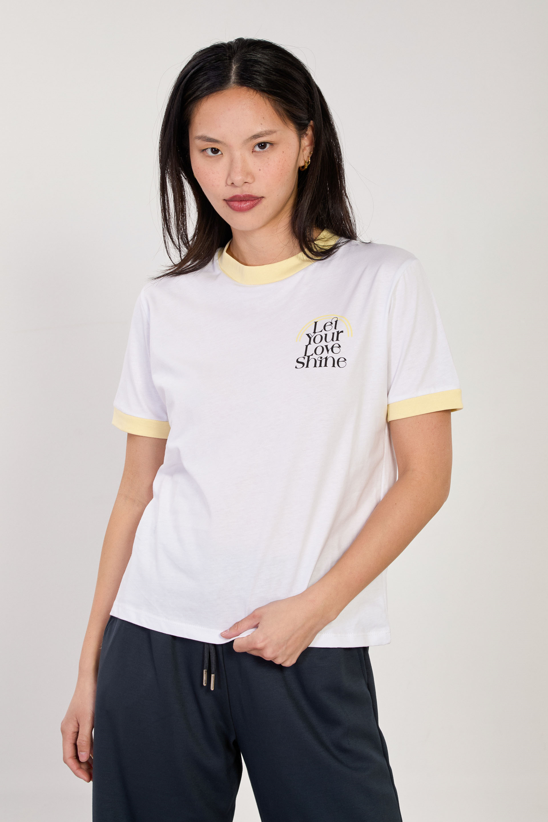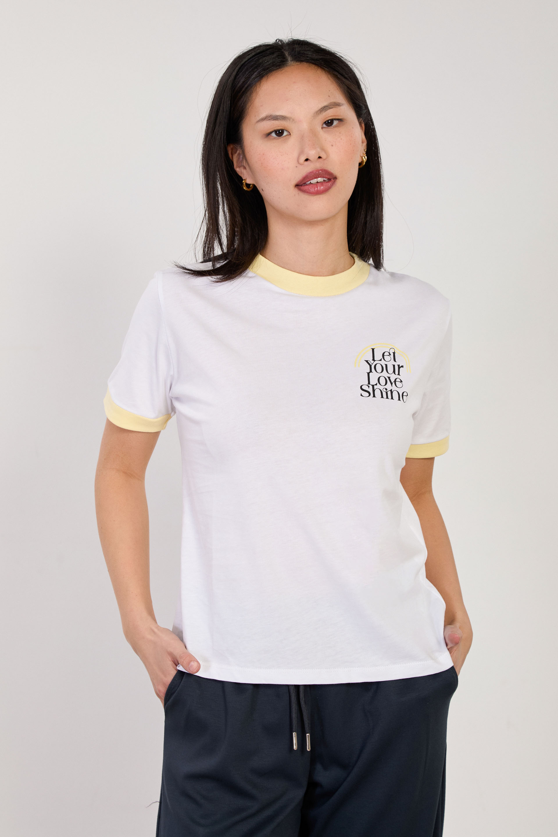 Kadın Göğsü Yazı Baskılı Garnili T-Shirt - Beyaz/Sarı