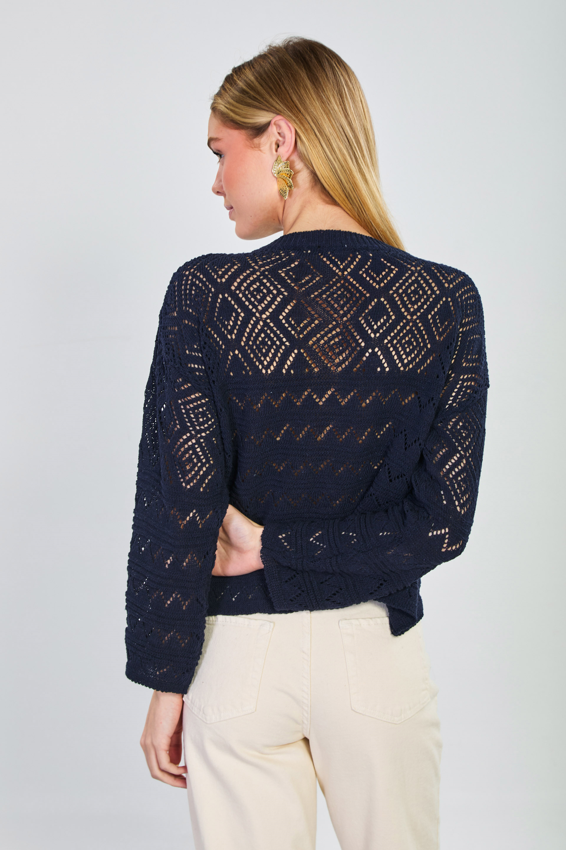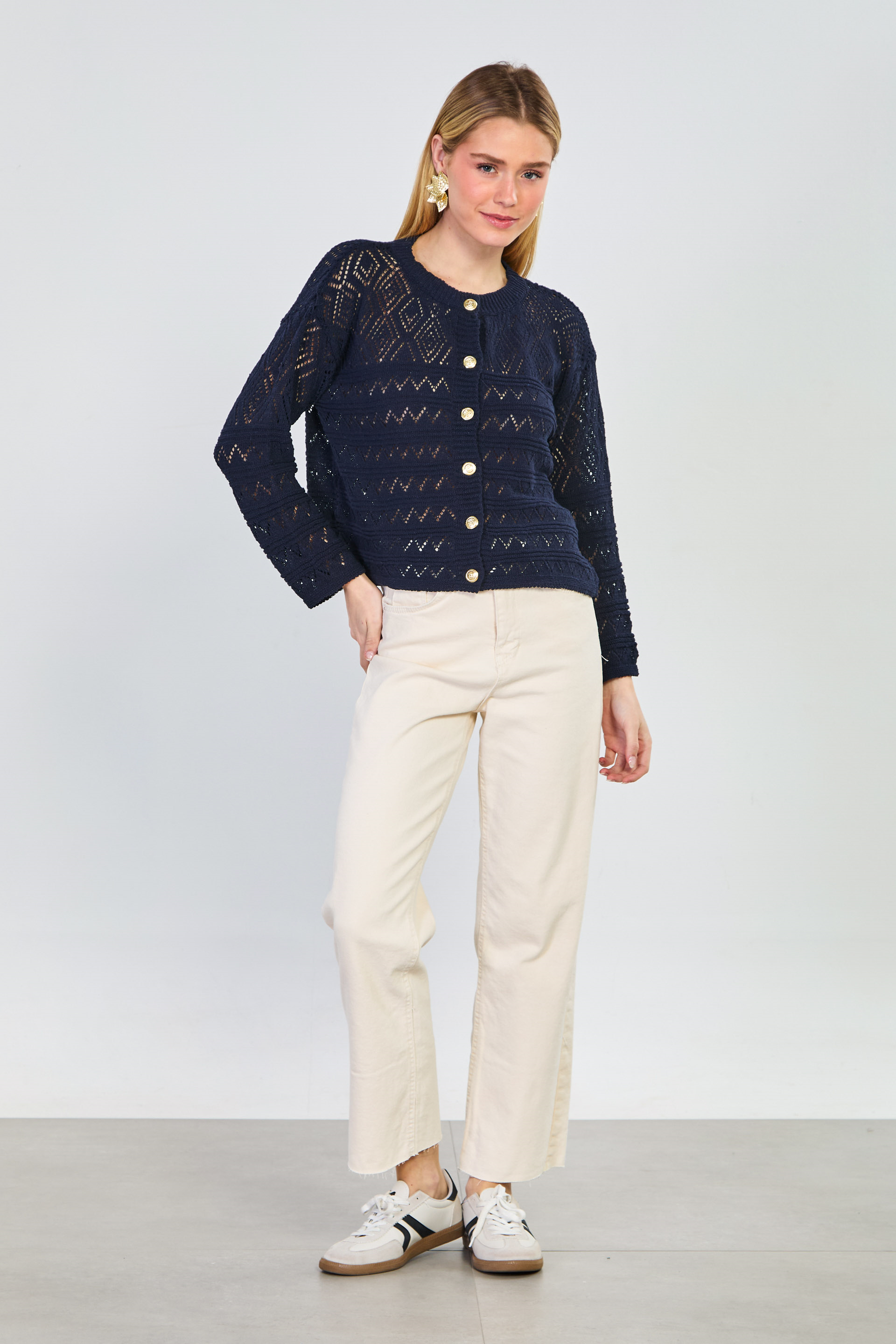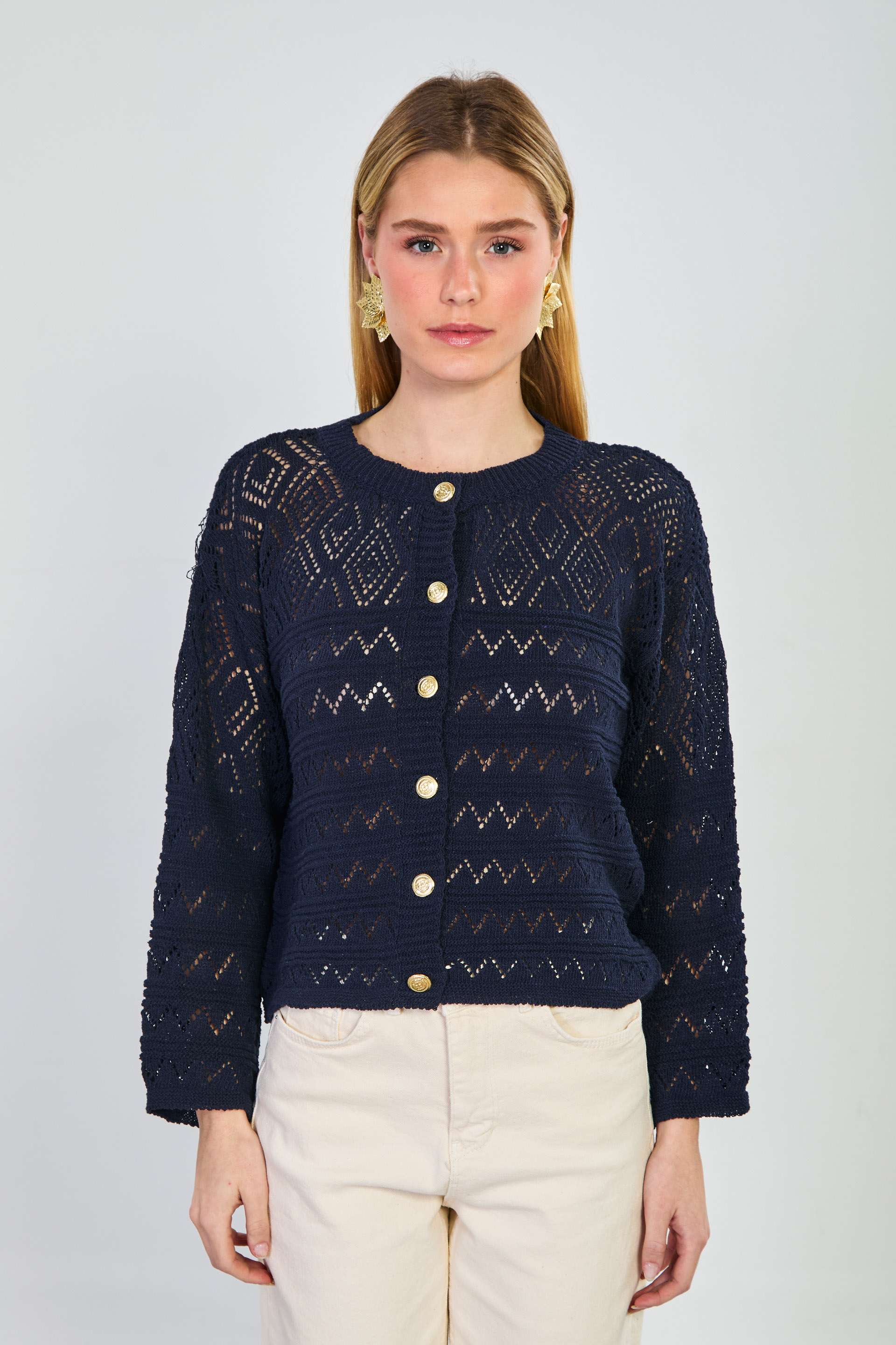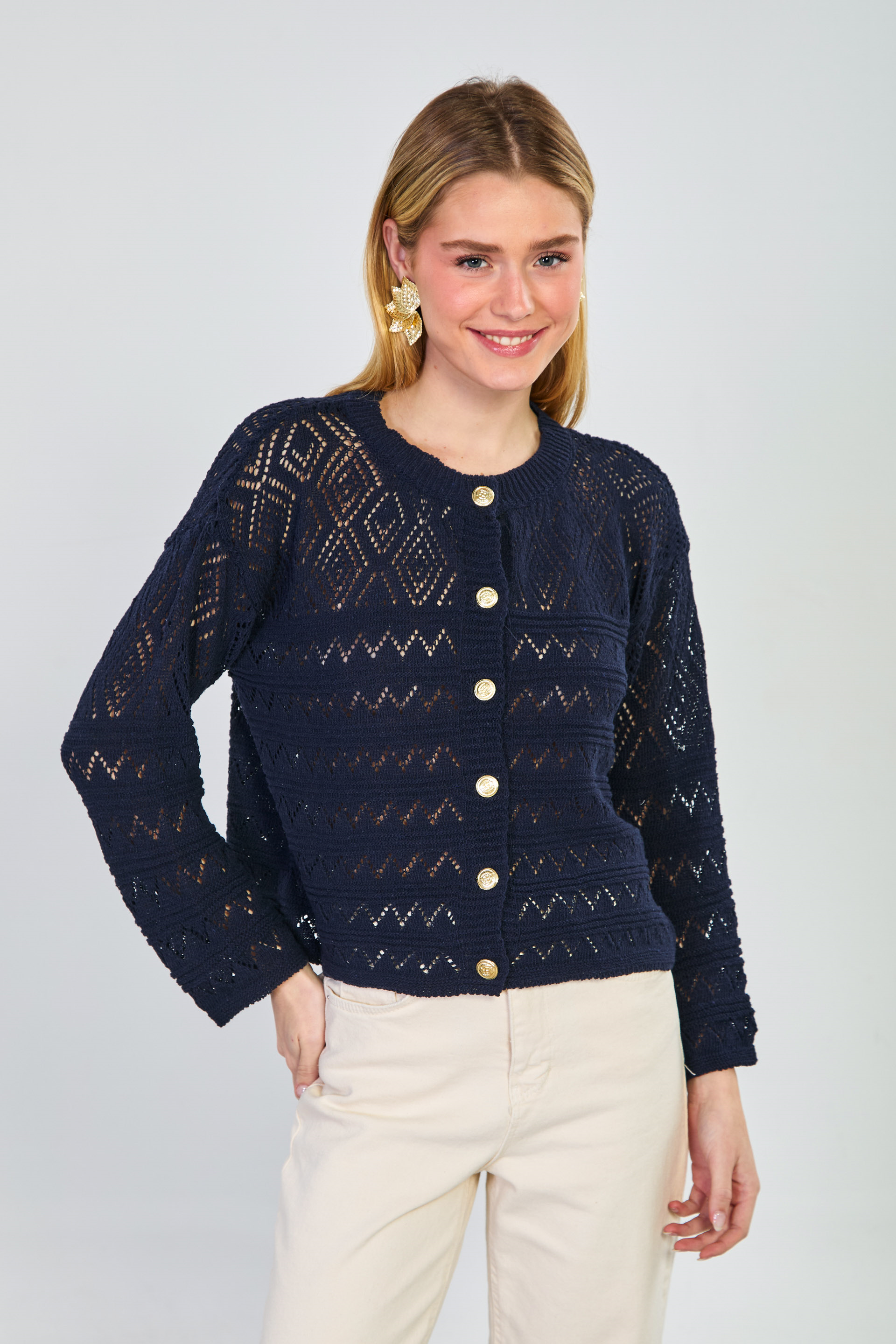 Kadın Gold Düğmeli Ajurlu Hırka - Lacivert
