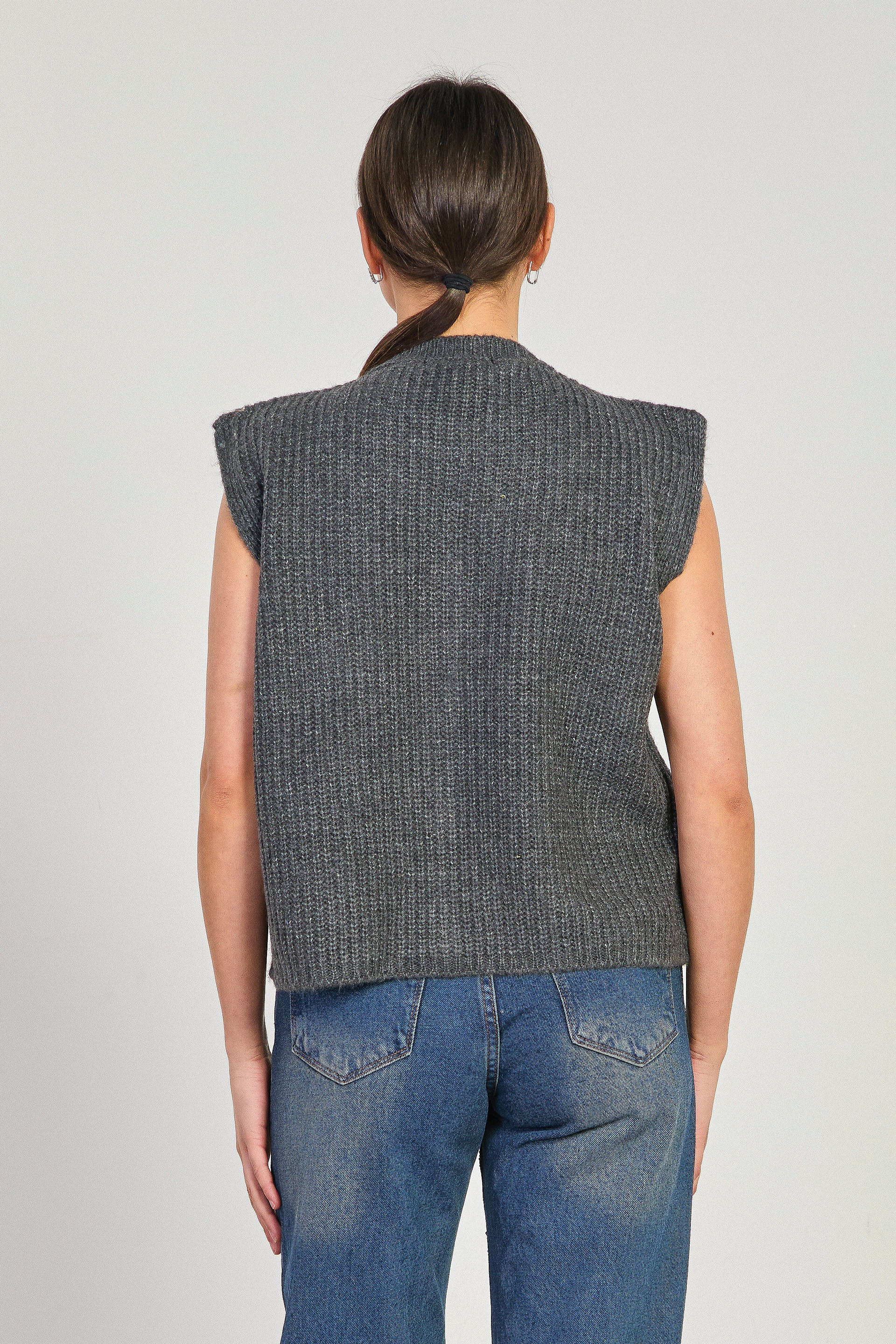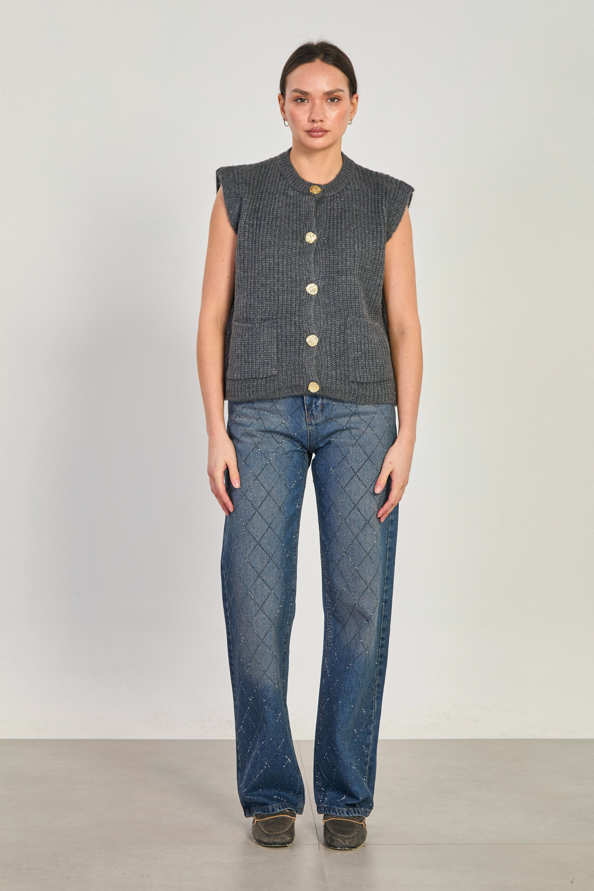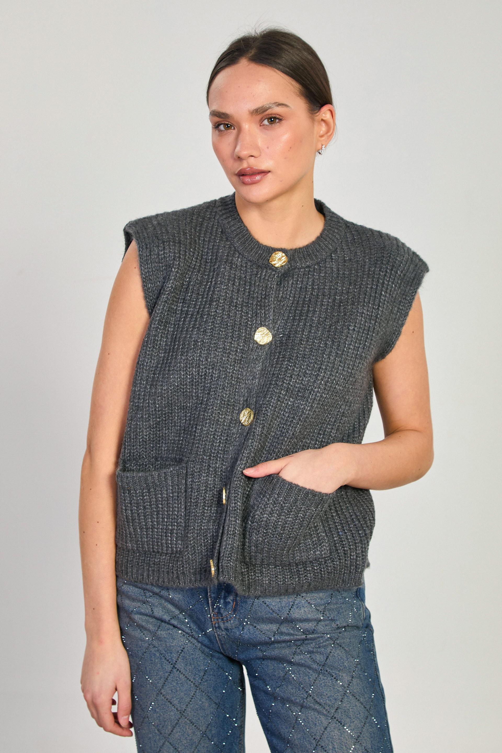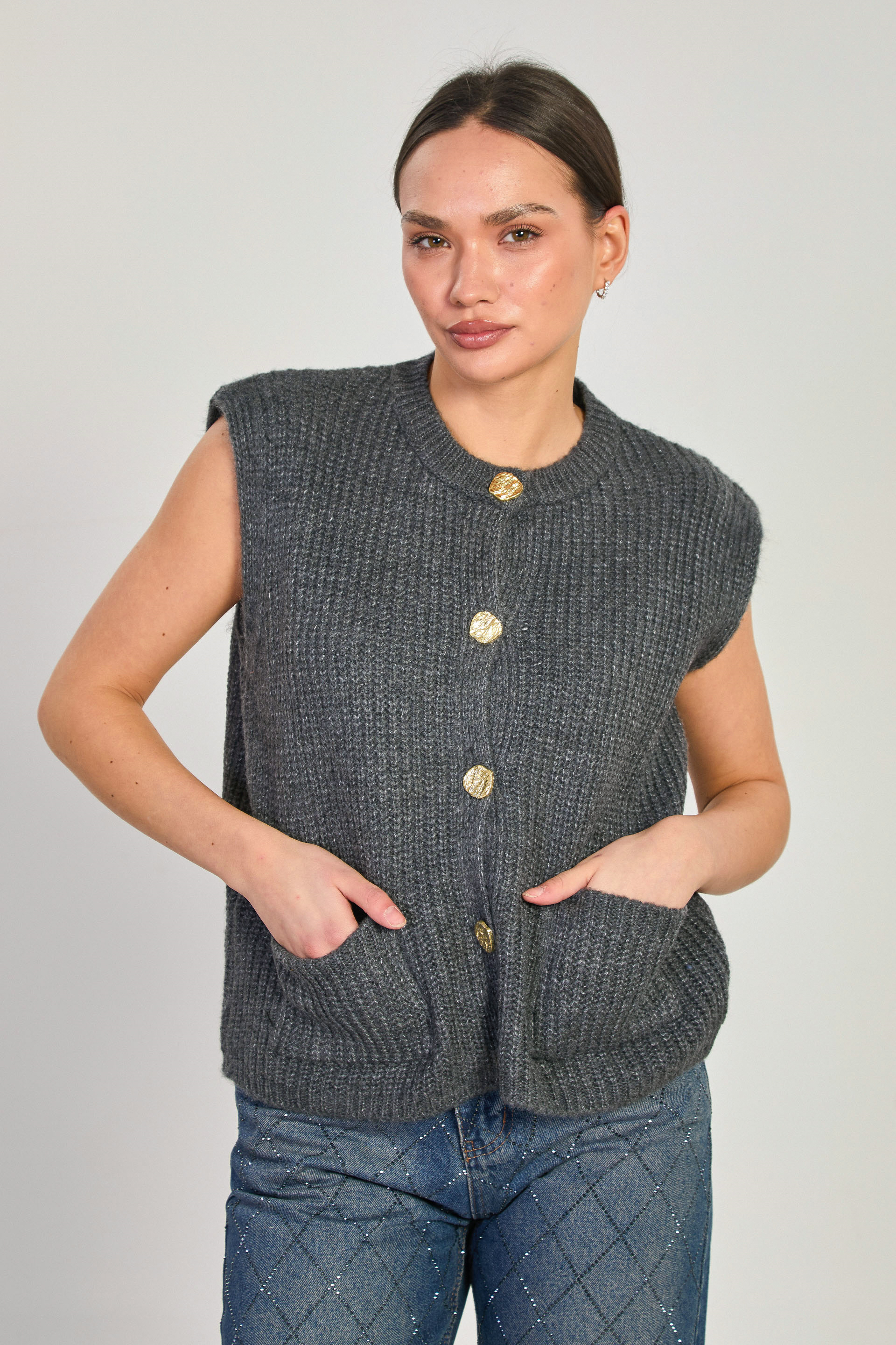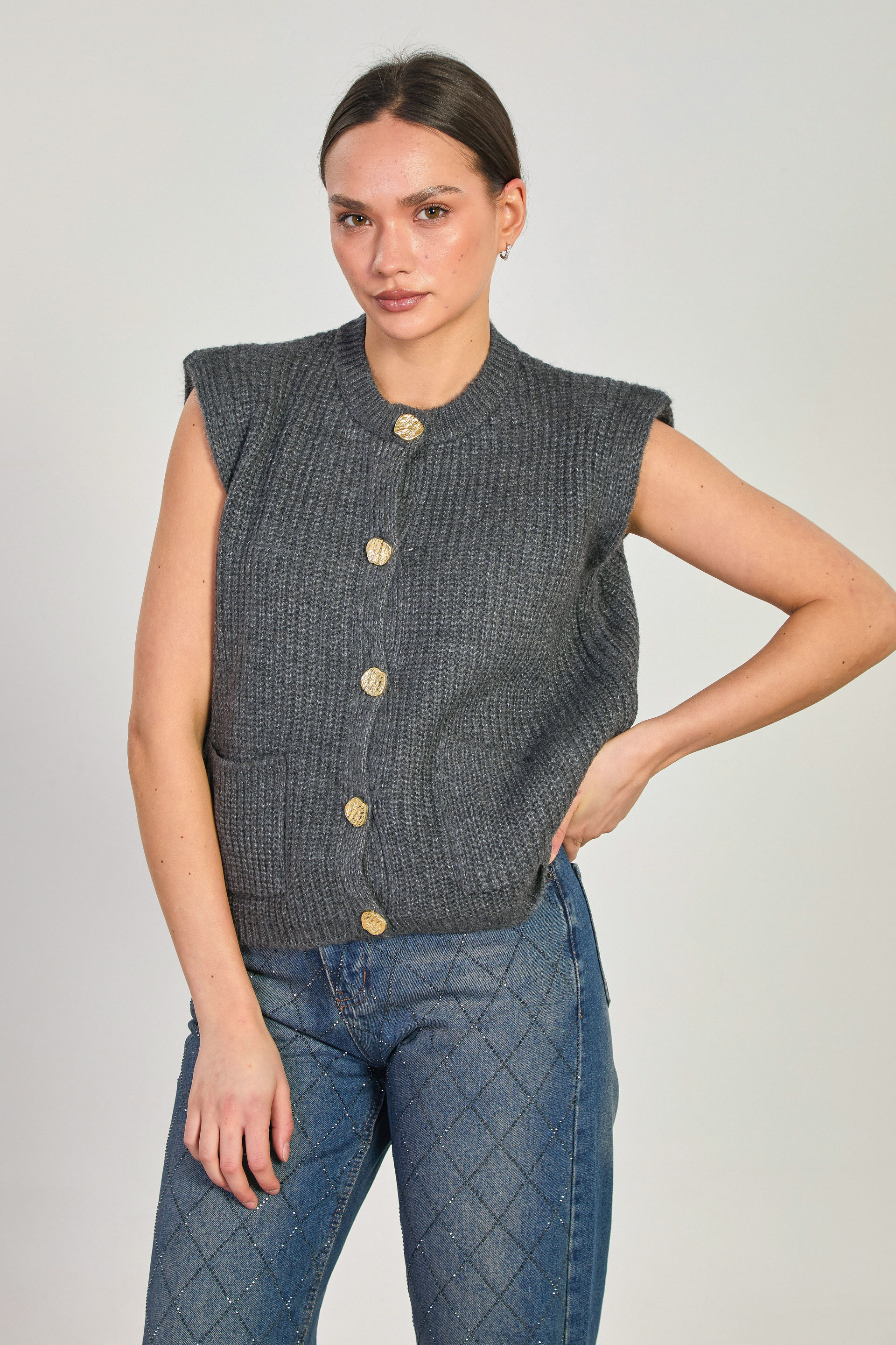 Kadın Gold Düğmeli Çift Cepli Süveter - Antrasit