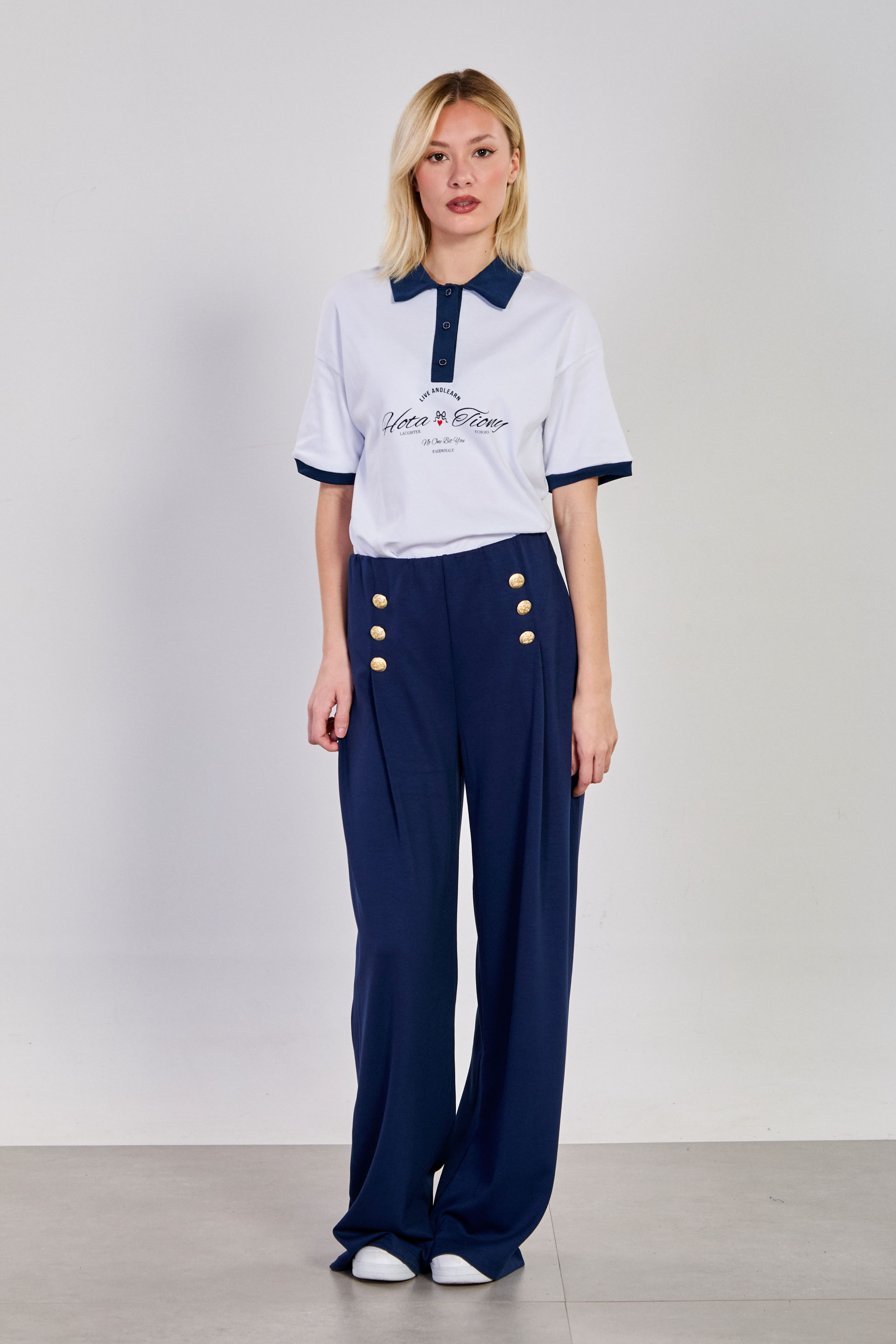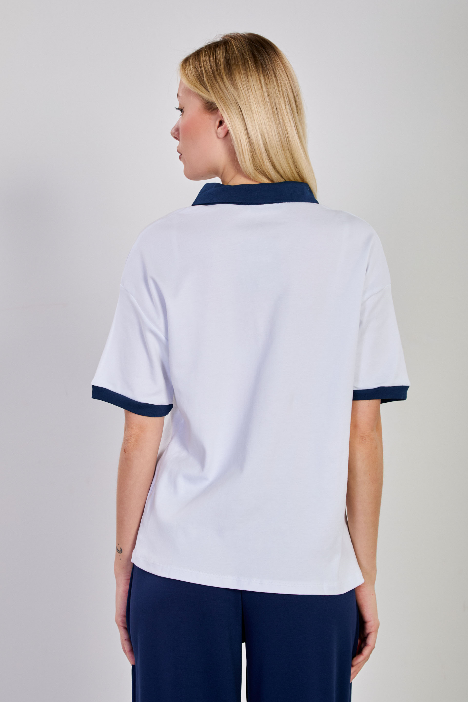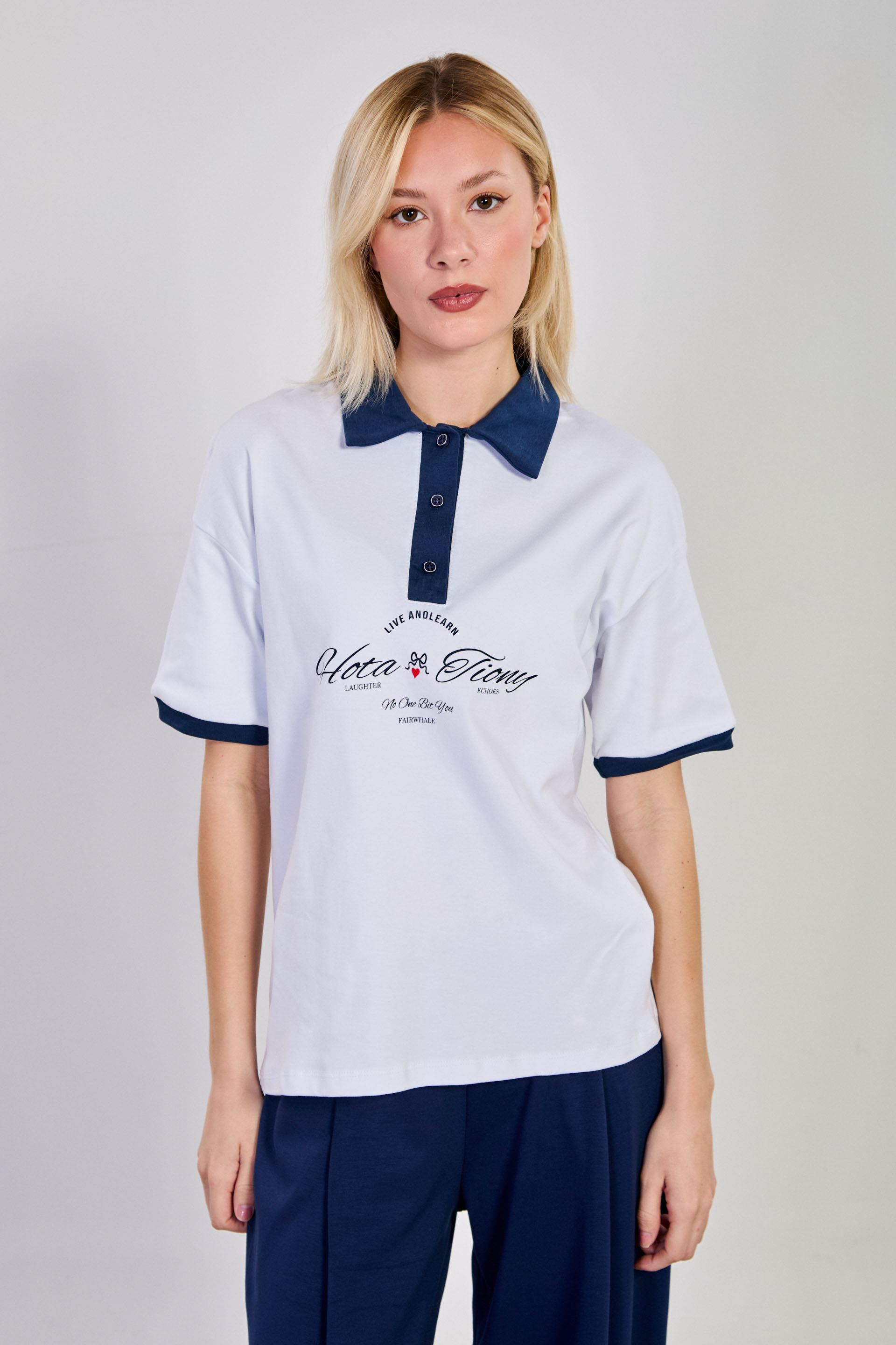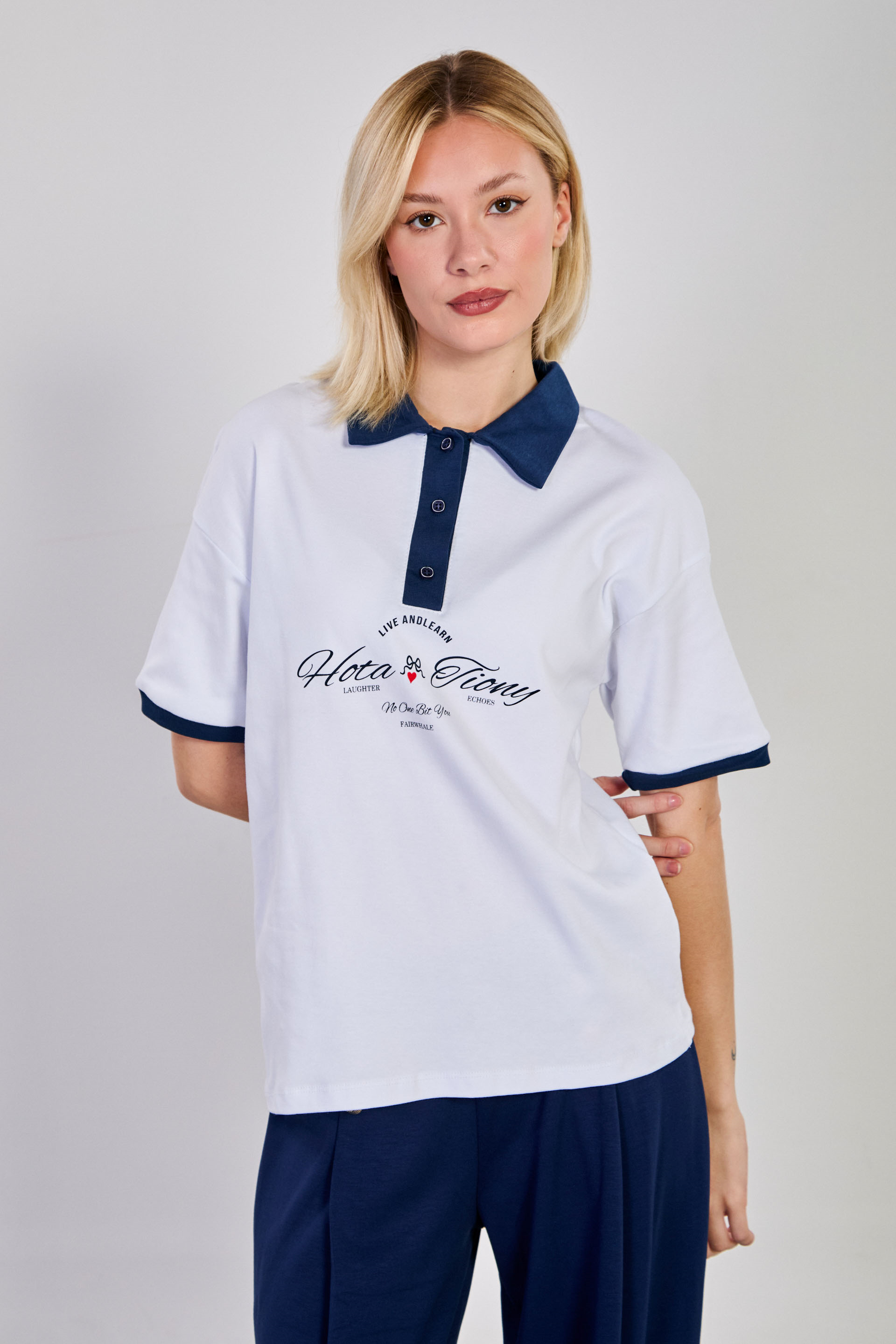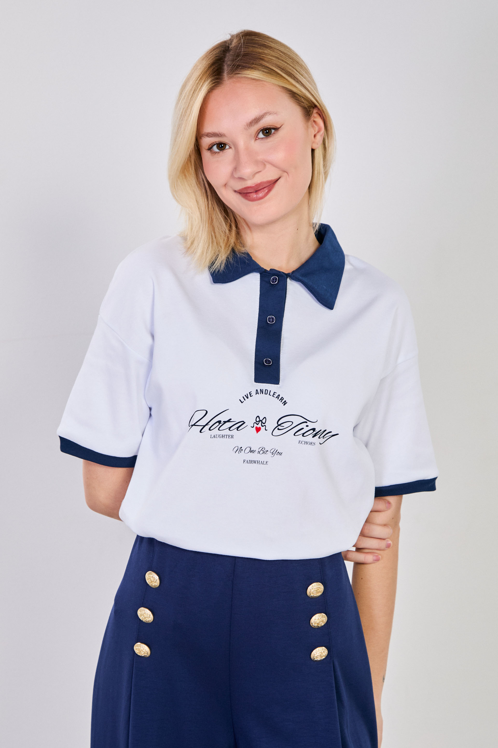 Kadın Gömlek Yaka Önü Baskılı T-Shirt - Beyaz/Lacivert