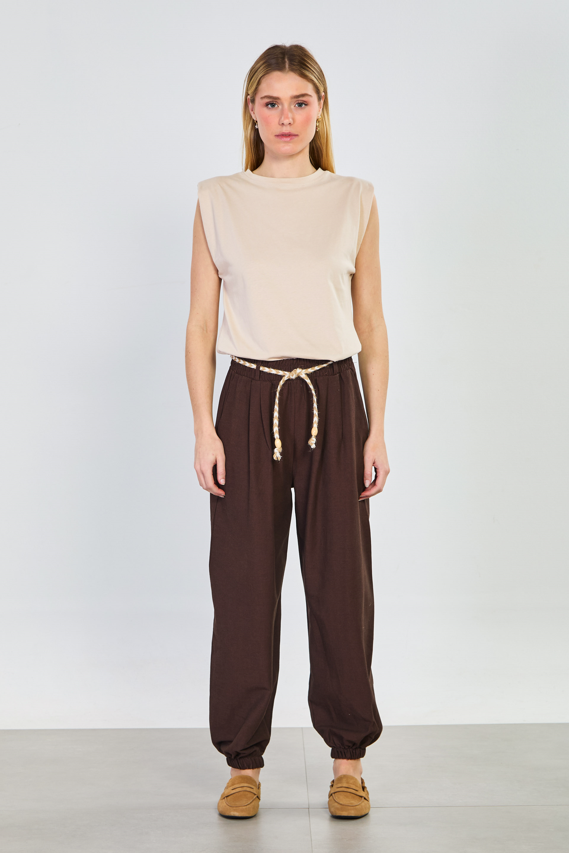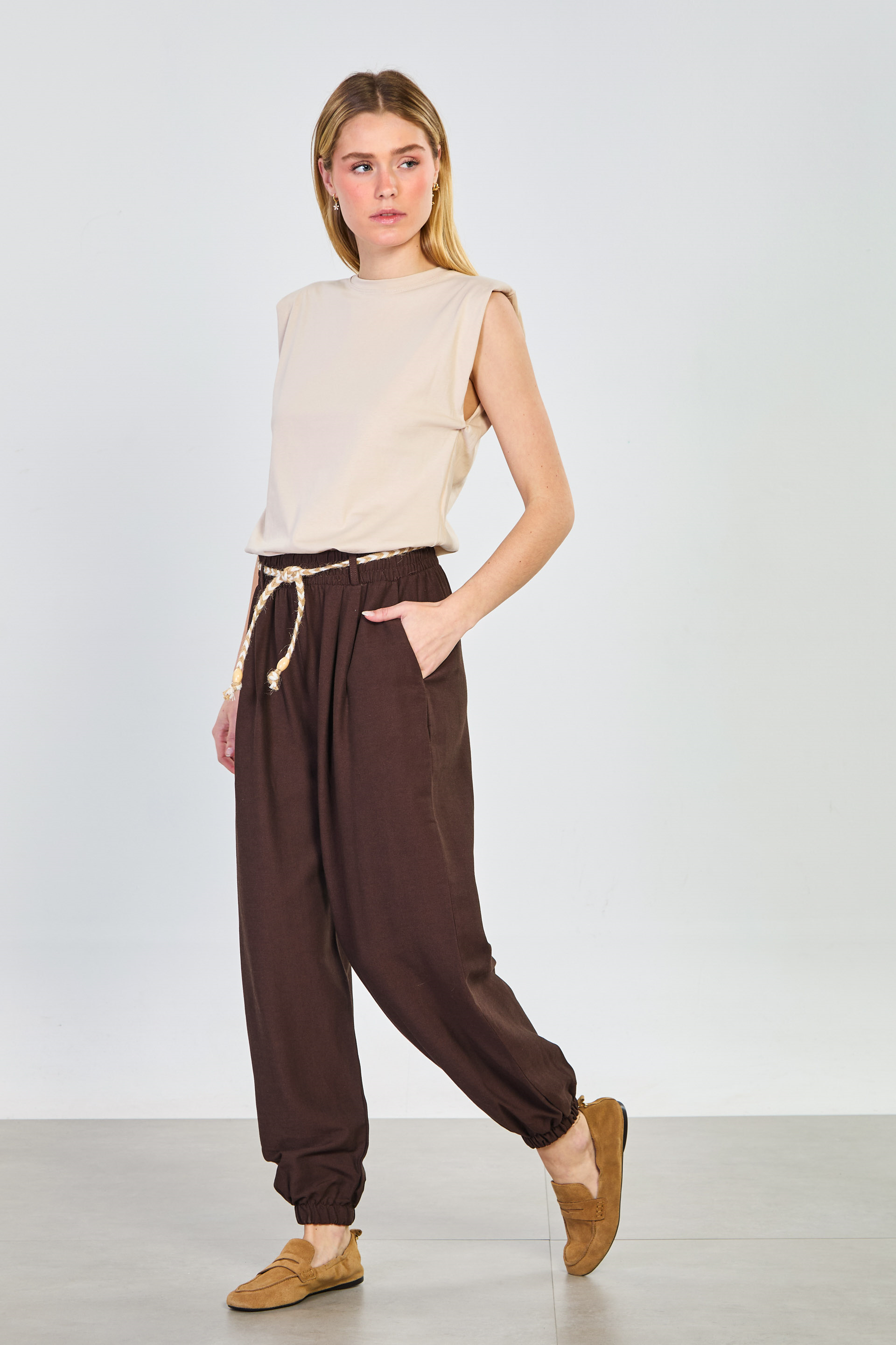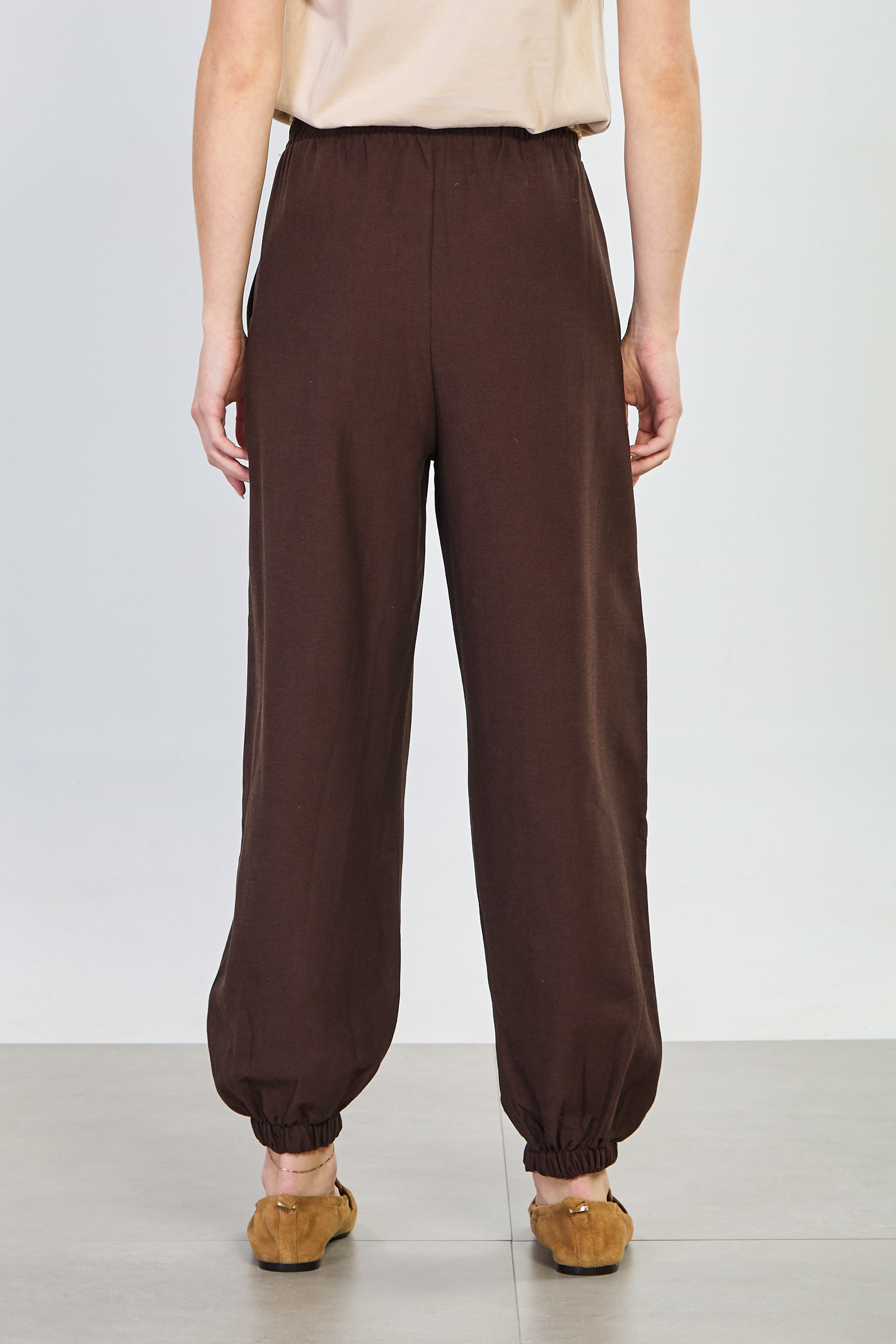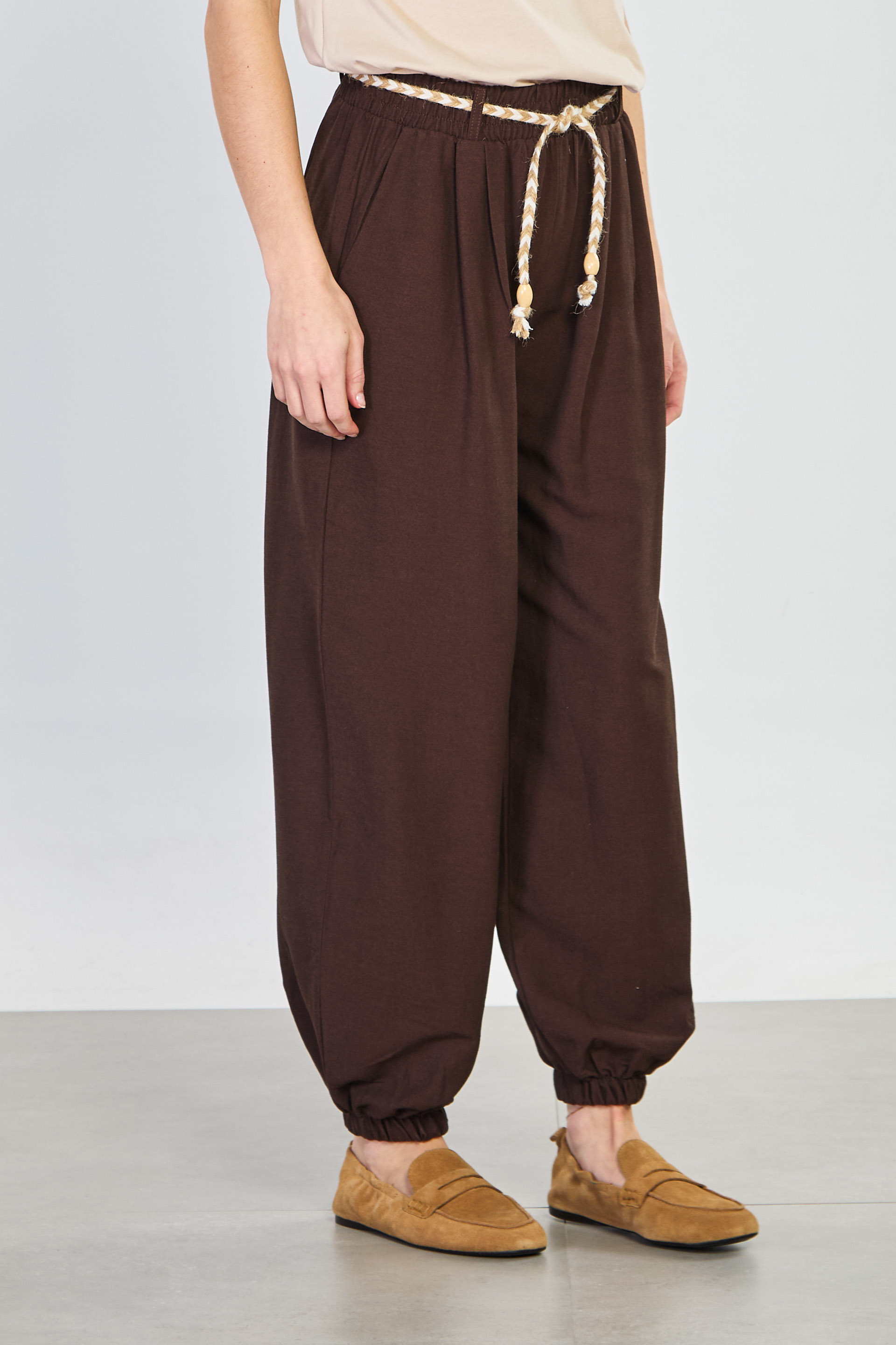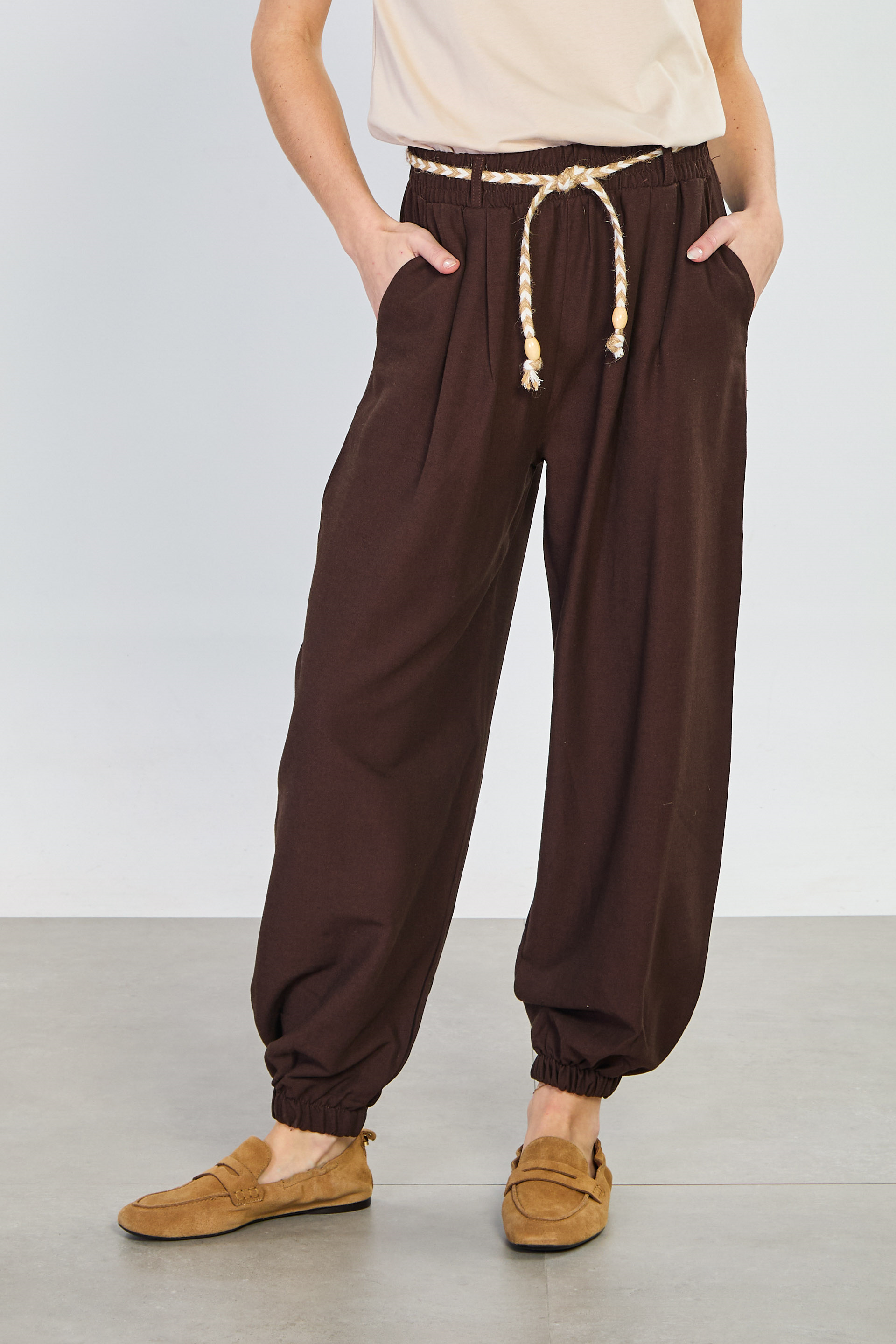Kadın Hasır Kemerli Paça Lastikli Pantolon - Acı Kahve