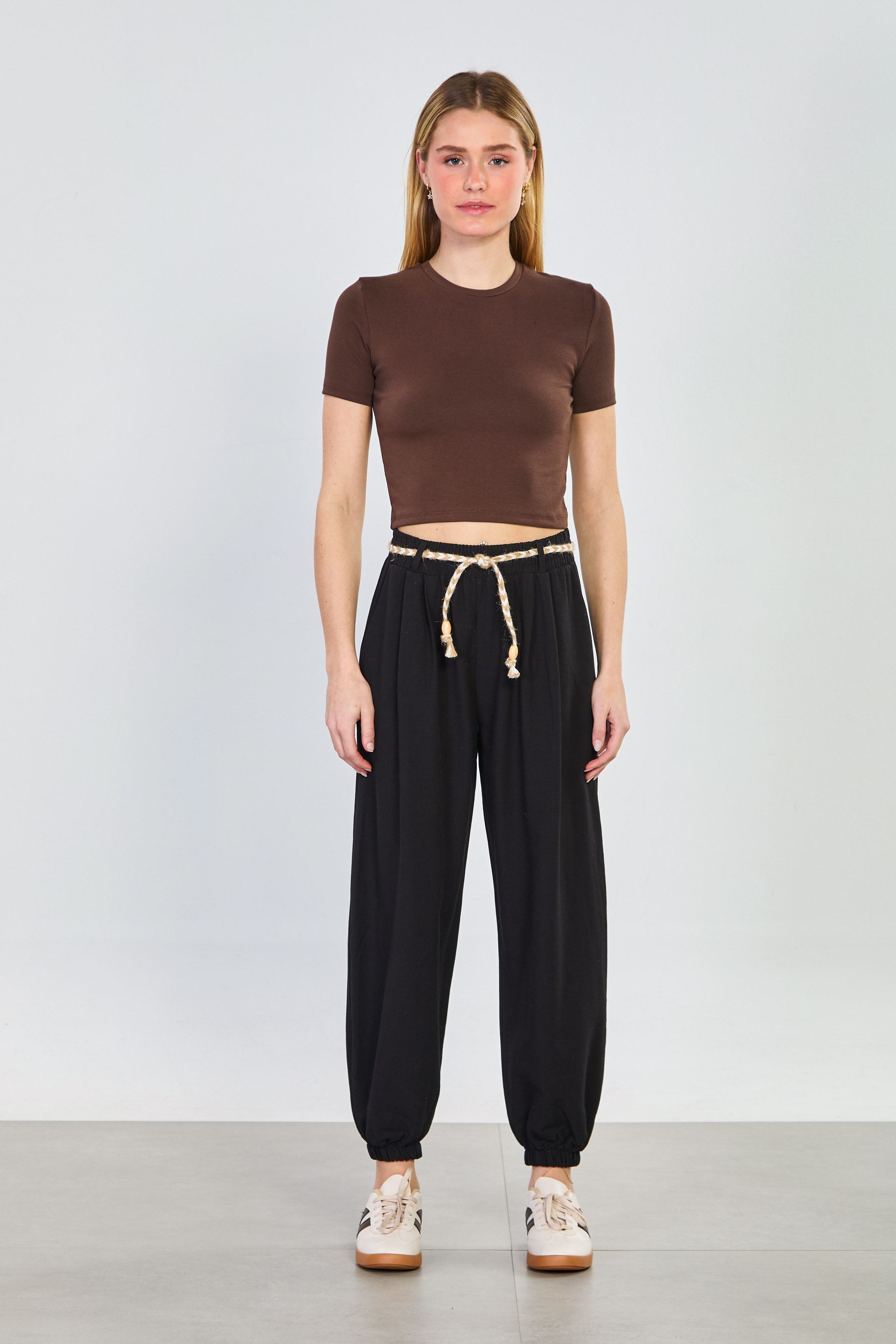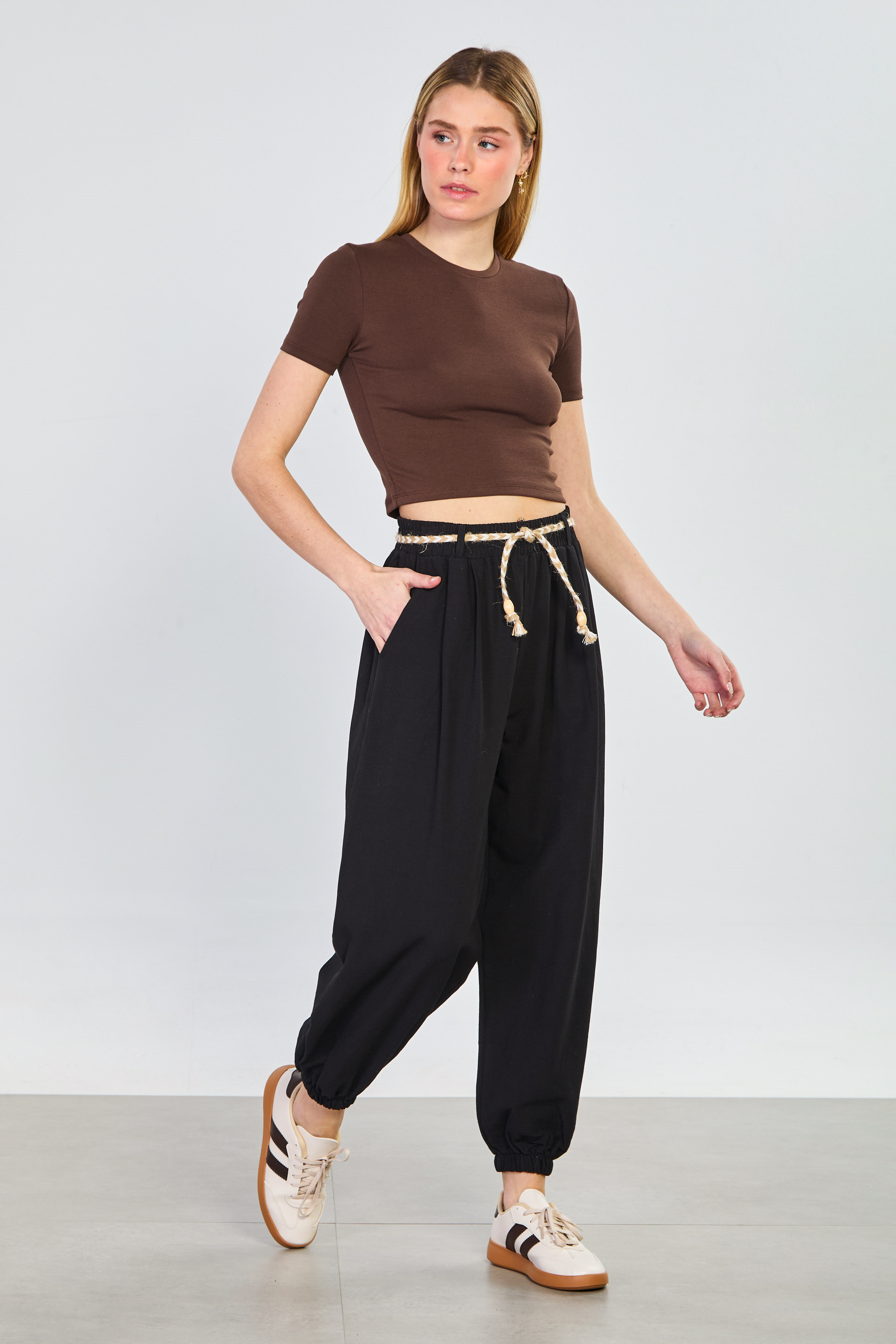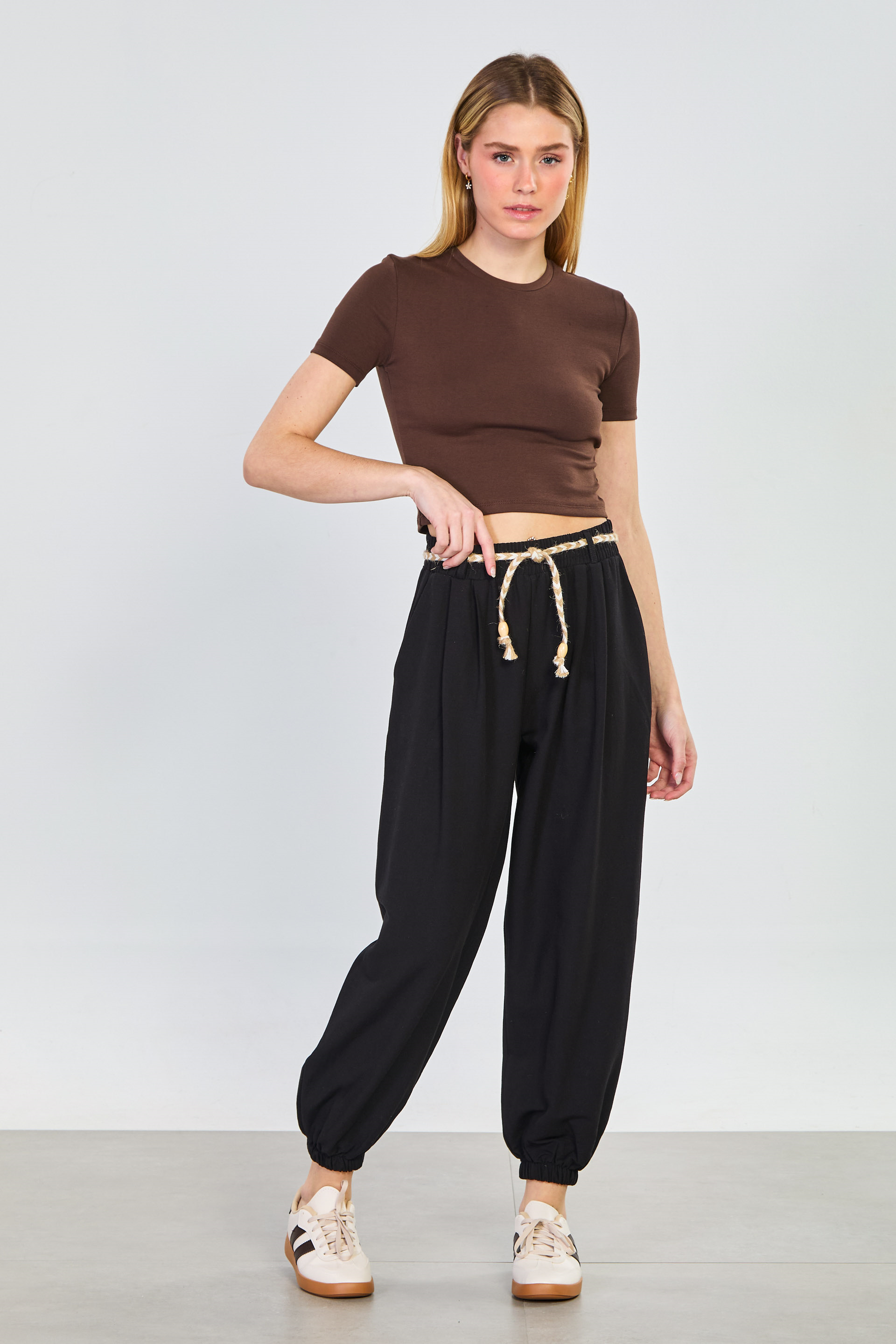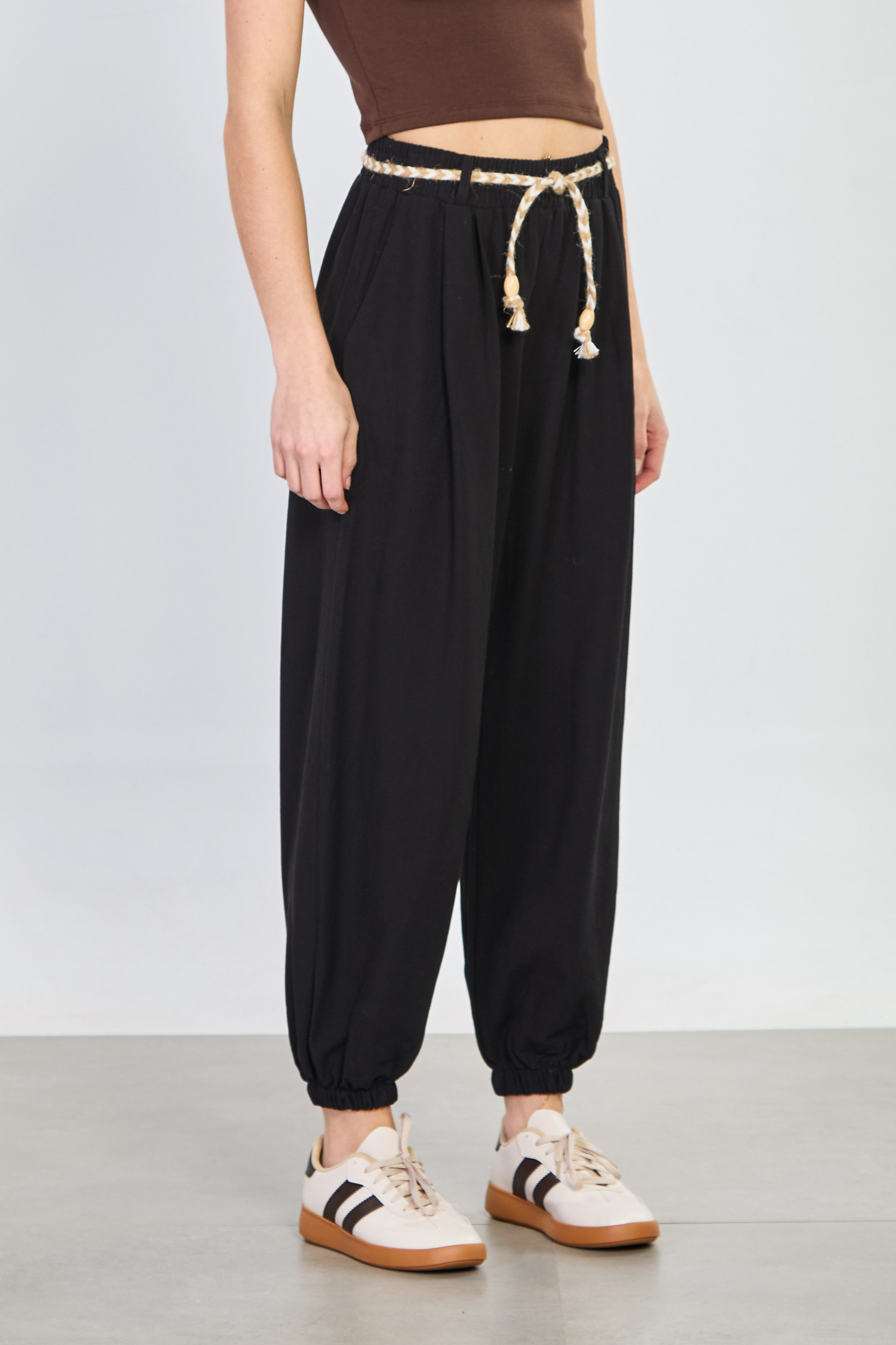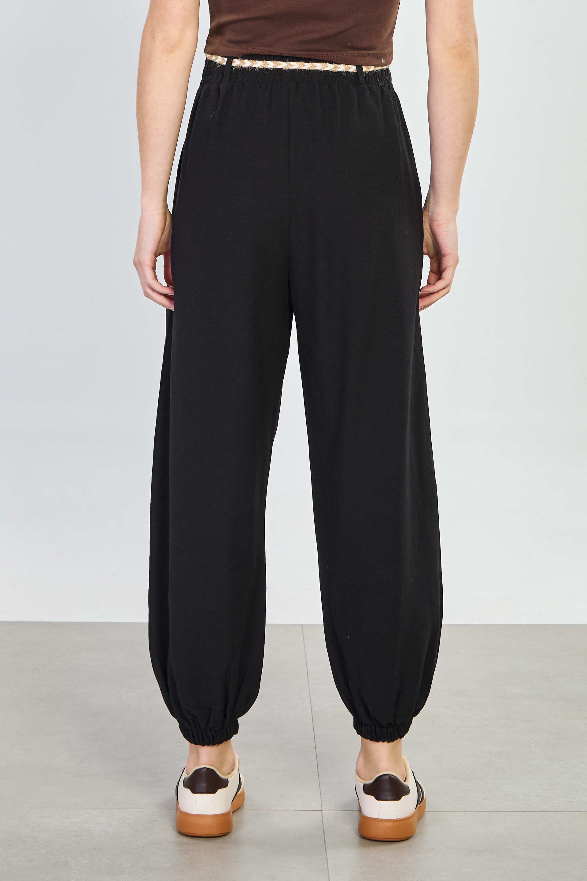 Kadın Hasır Kemerli Paça Lastikli Pantolon - Siyah