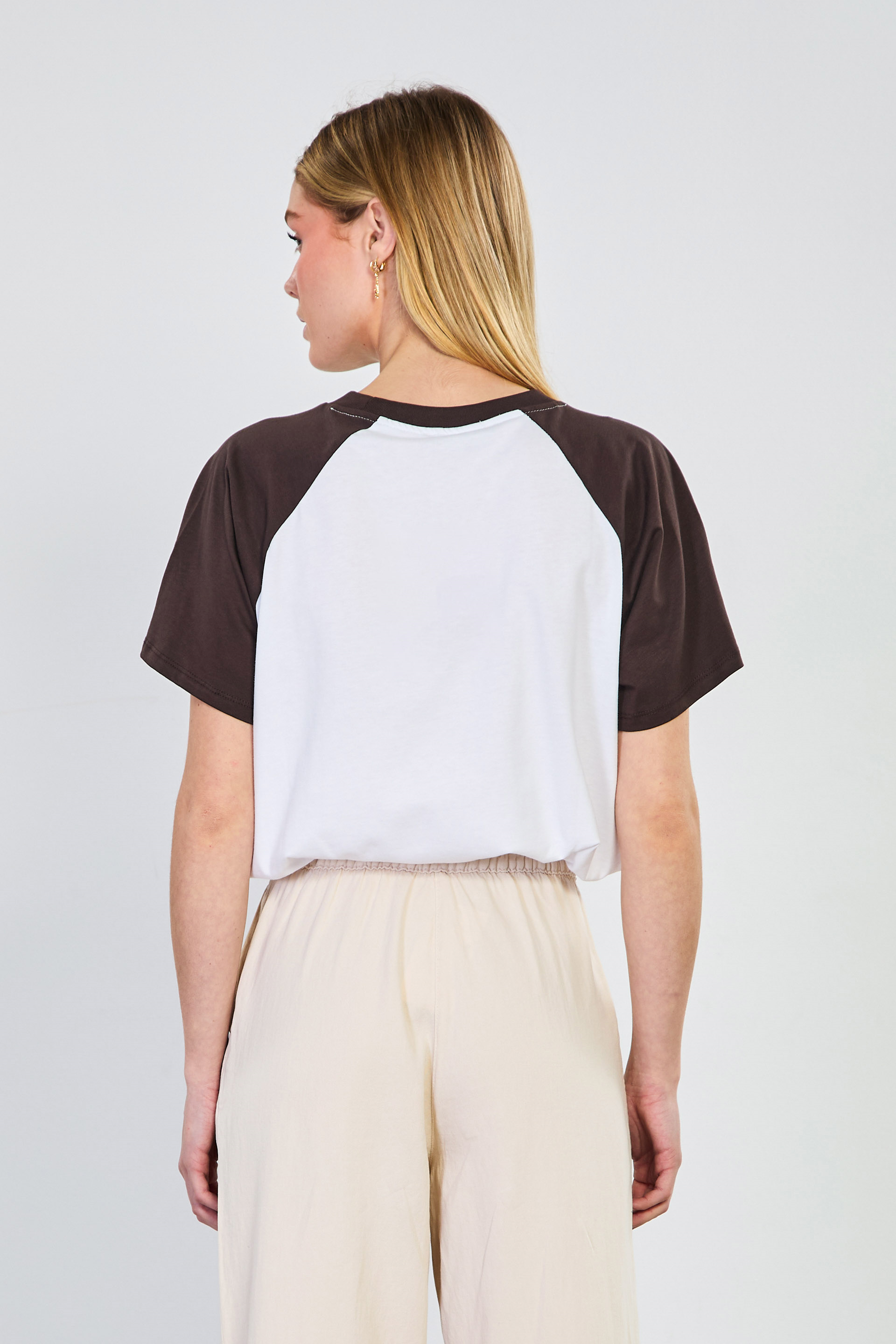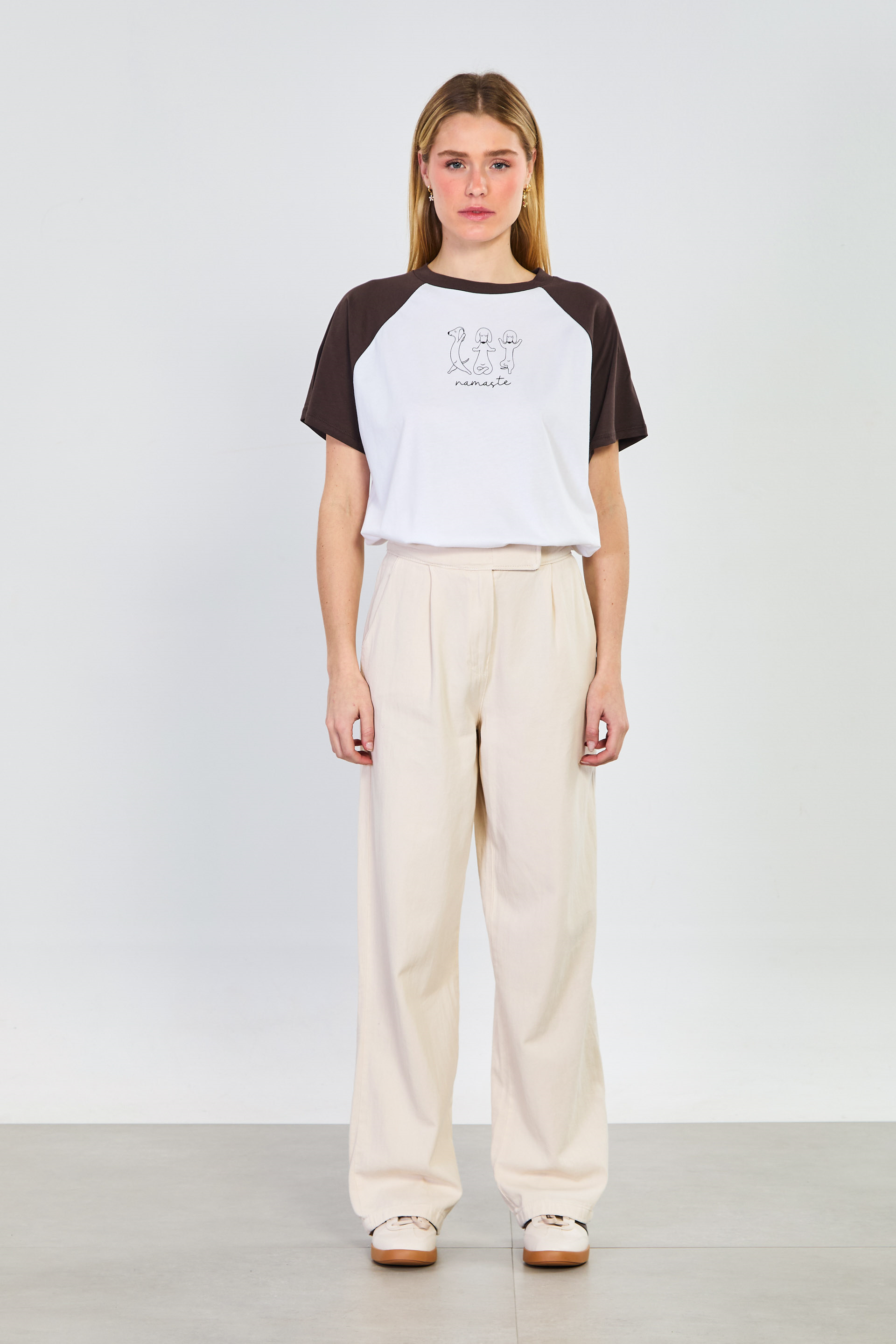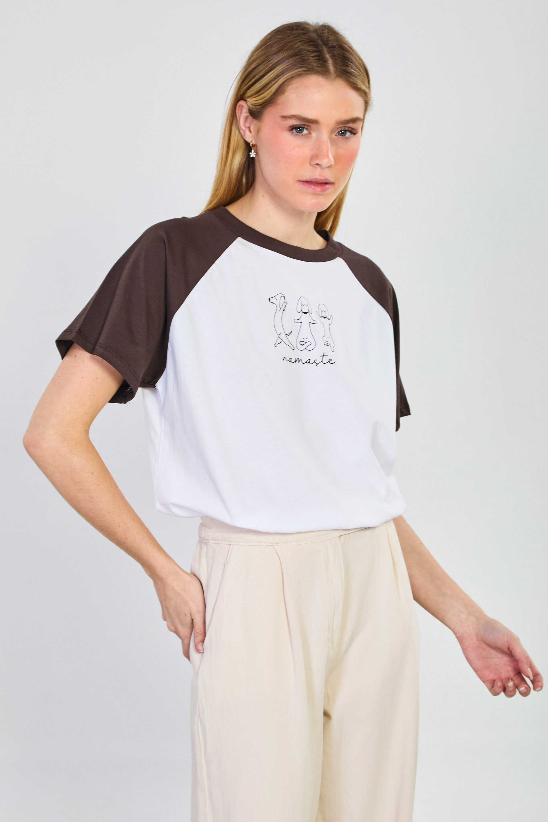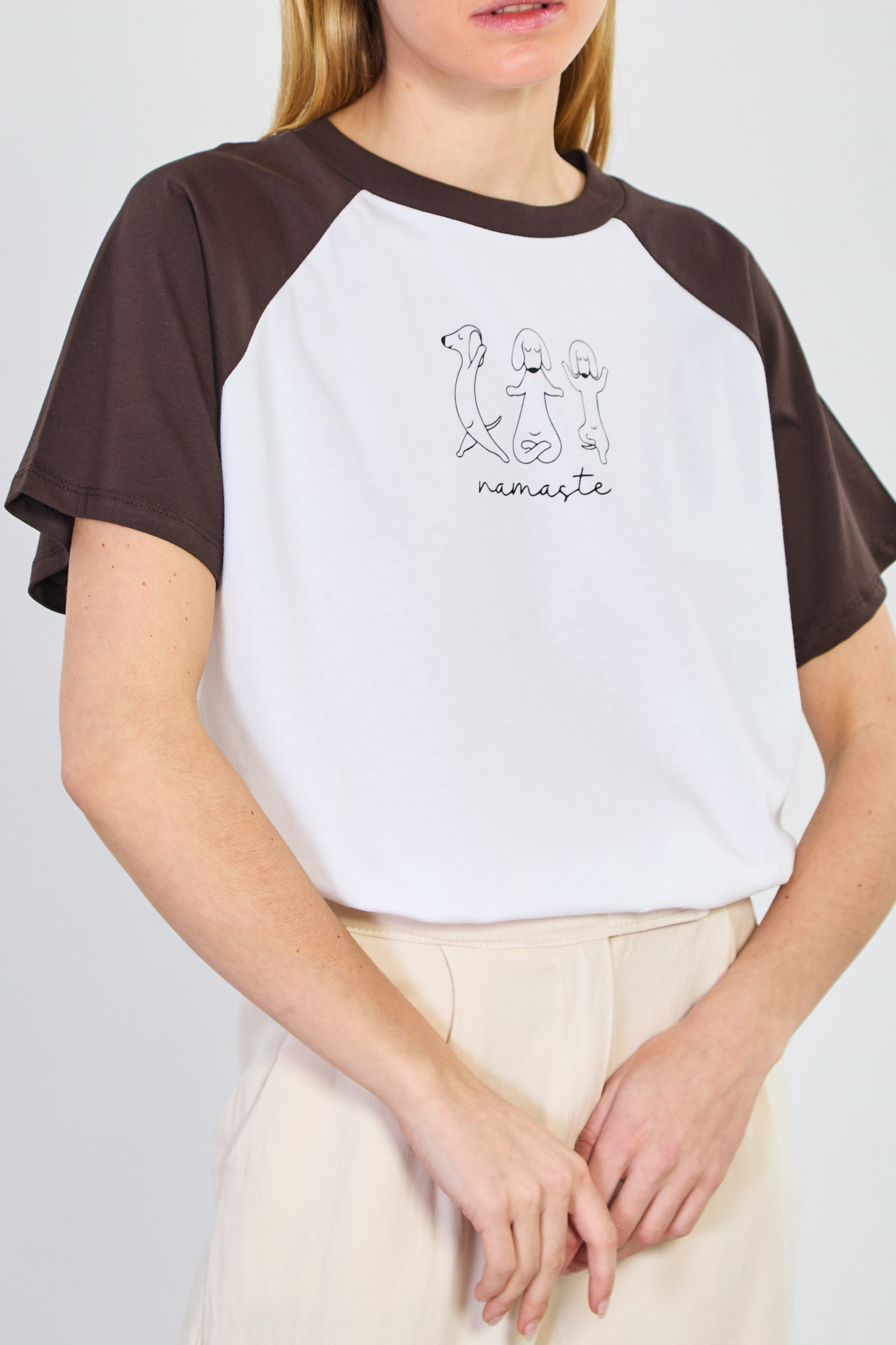 Kadın Hayvan Baskılı Kol Garnili T-Shirt - Beyaz/Kahve