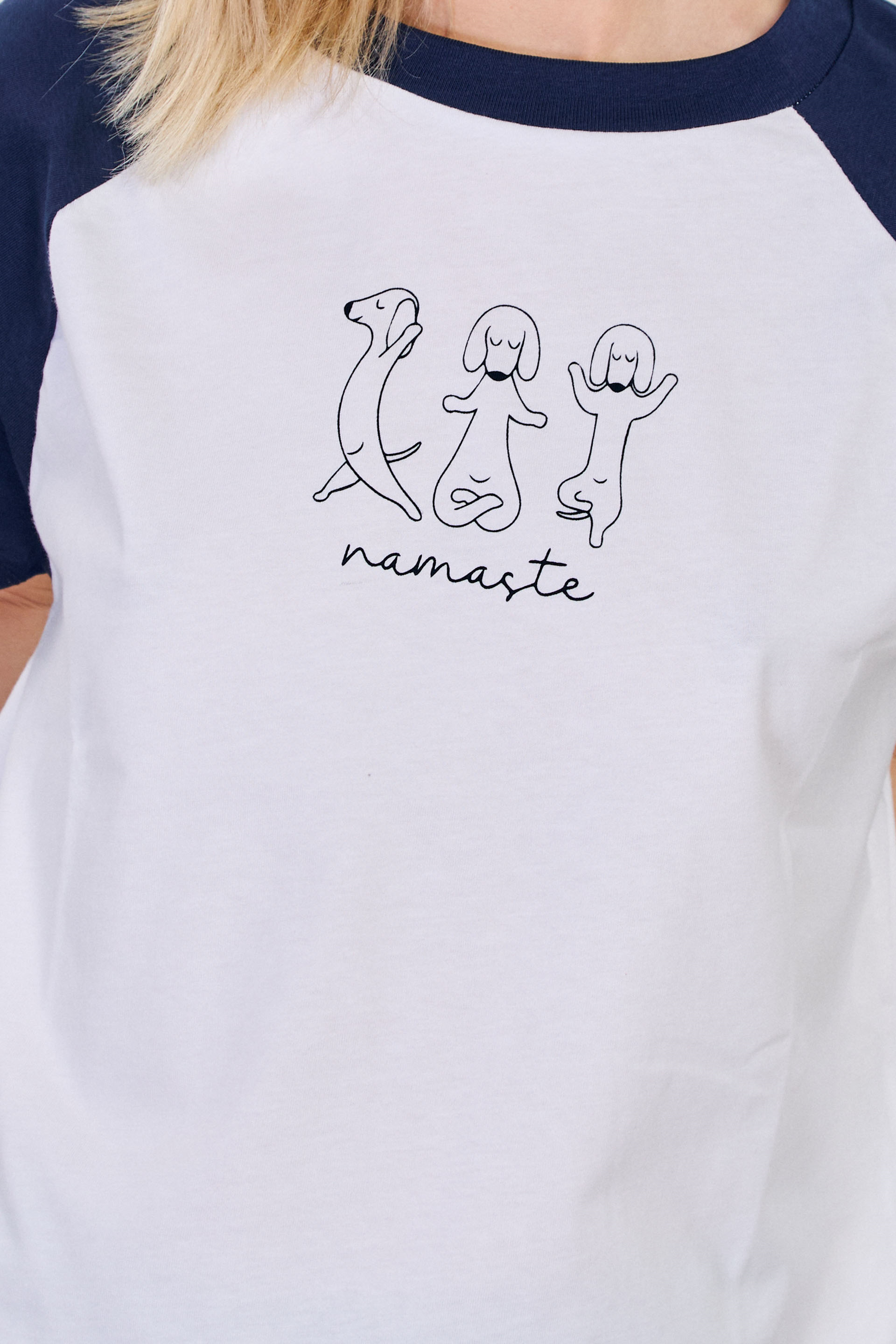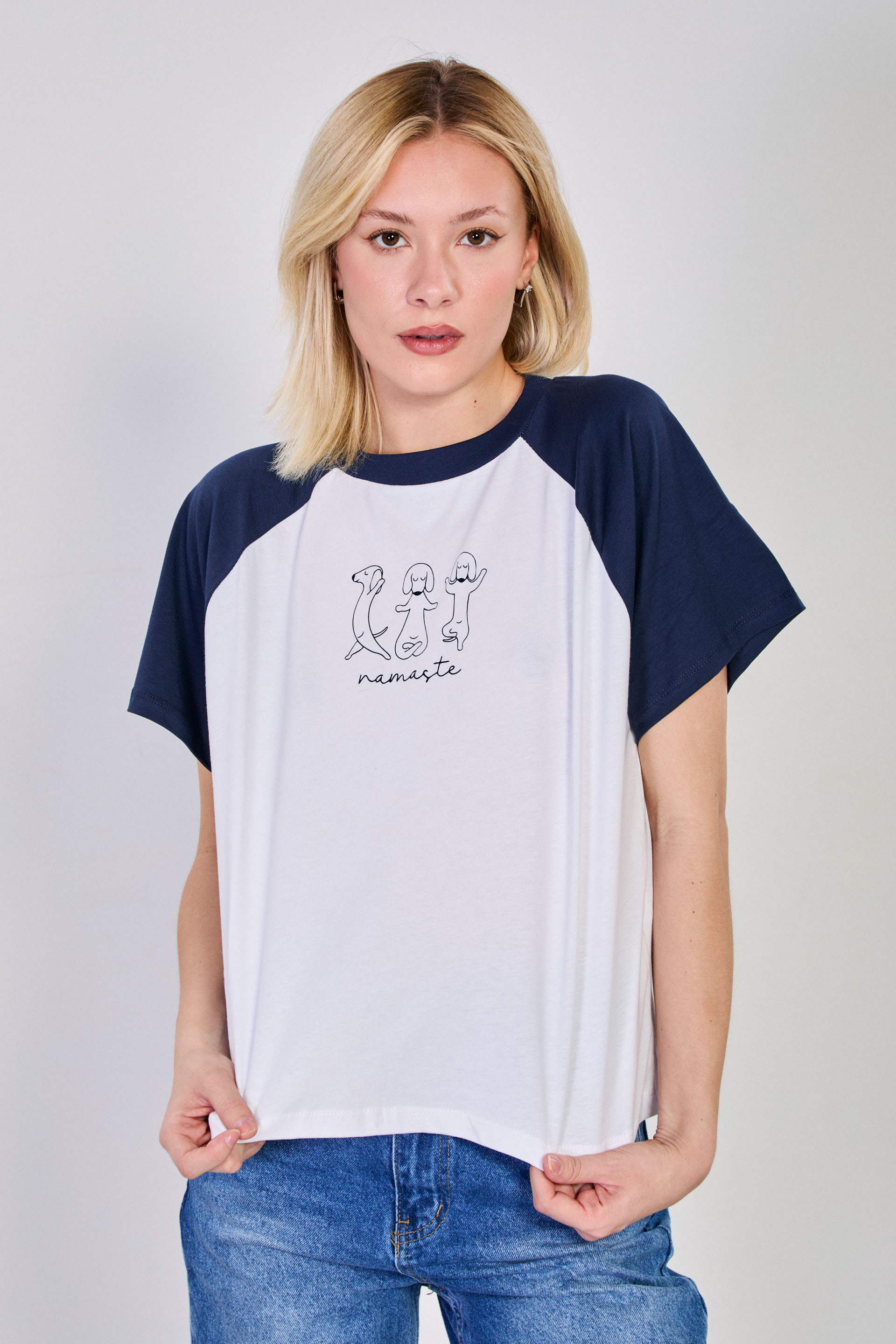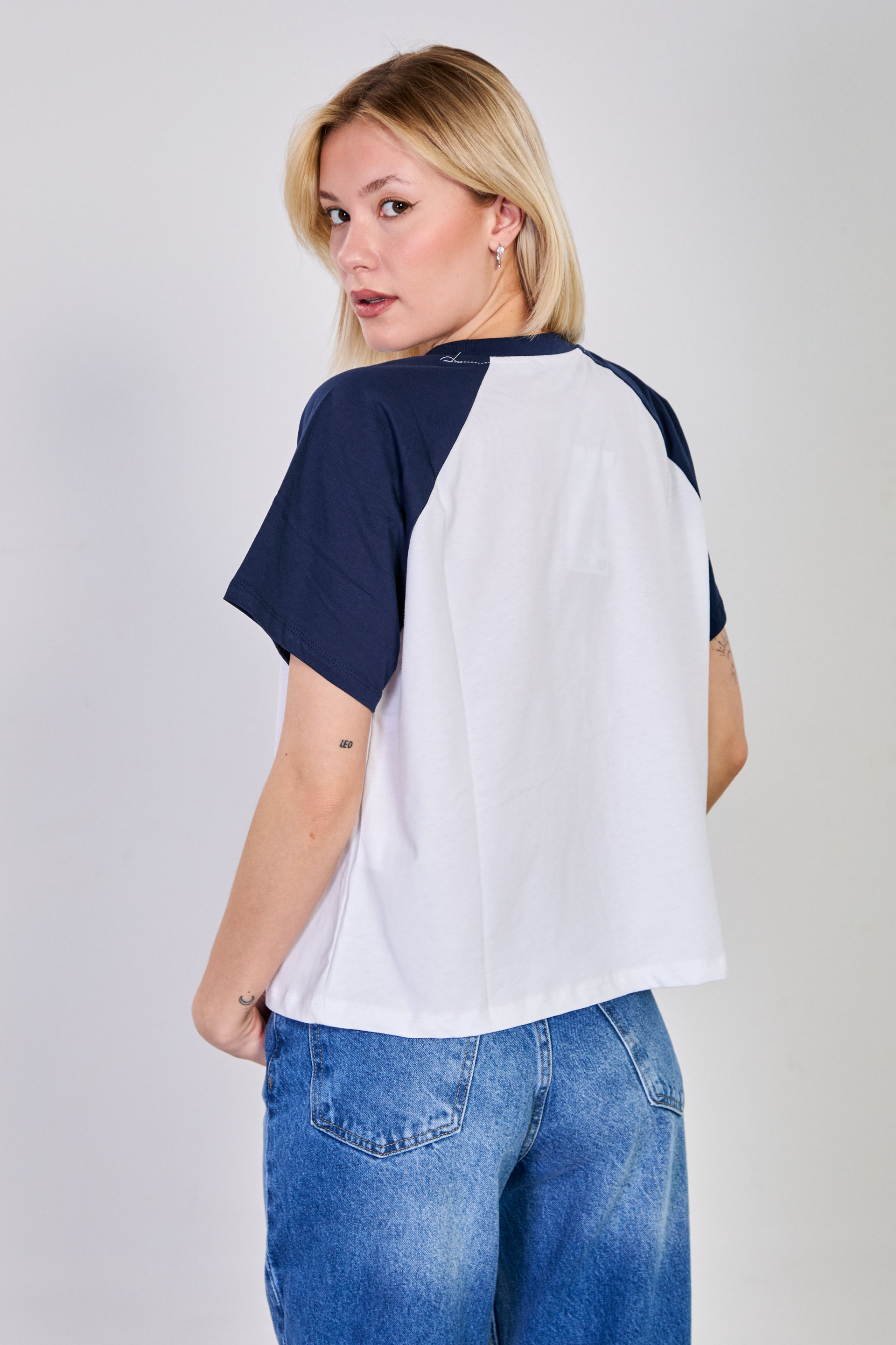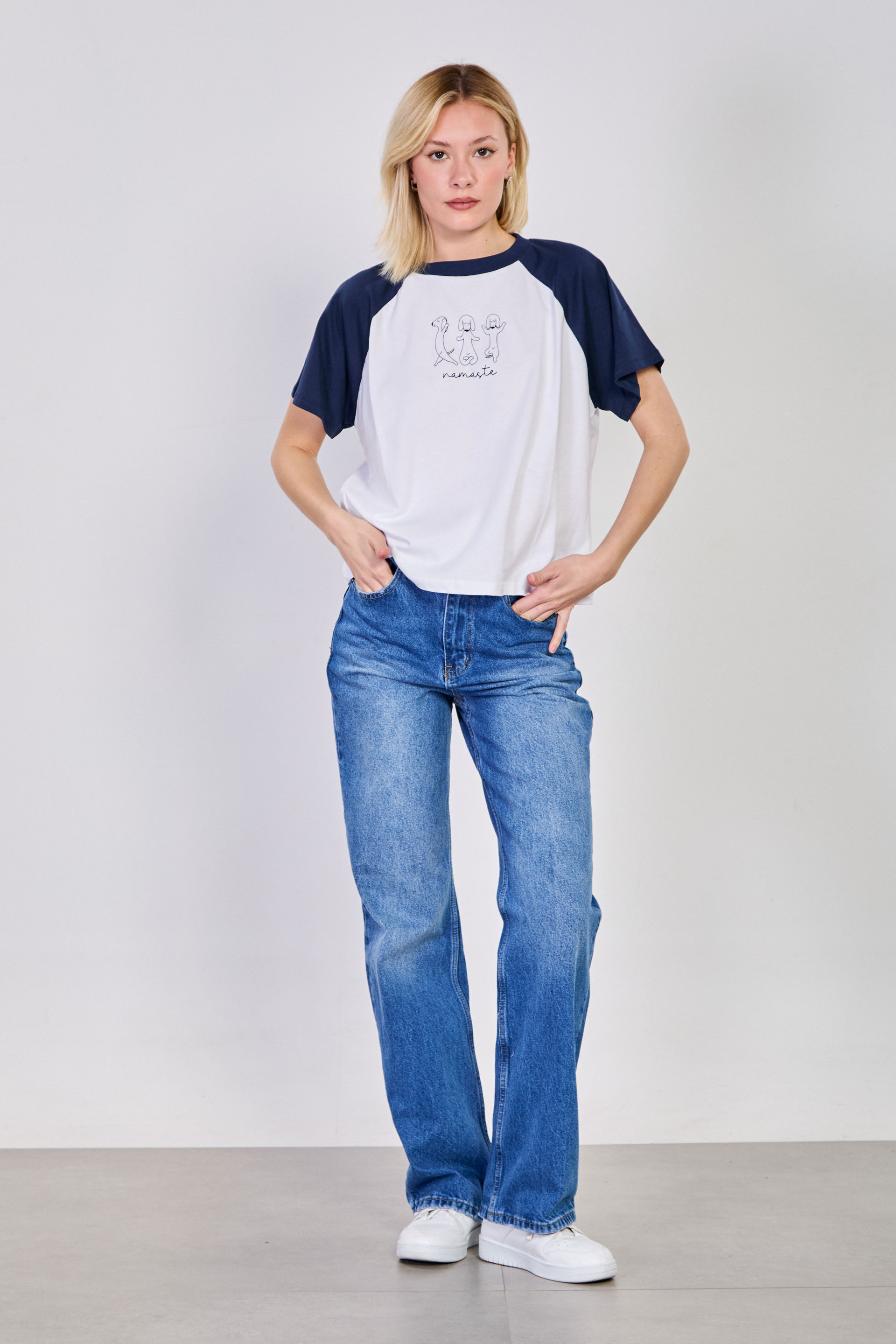 Kadın Hayvan Baskılı Kol Garnili T-Shirt - Beyaz/Lacivert