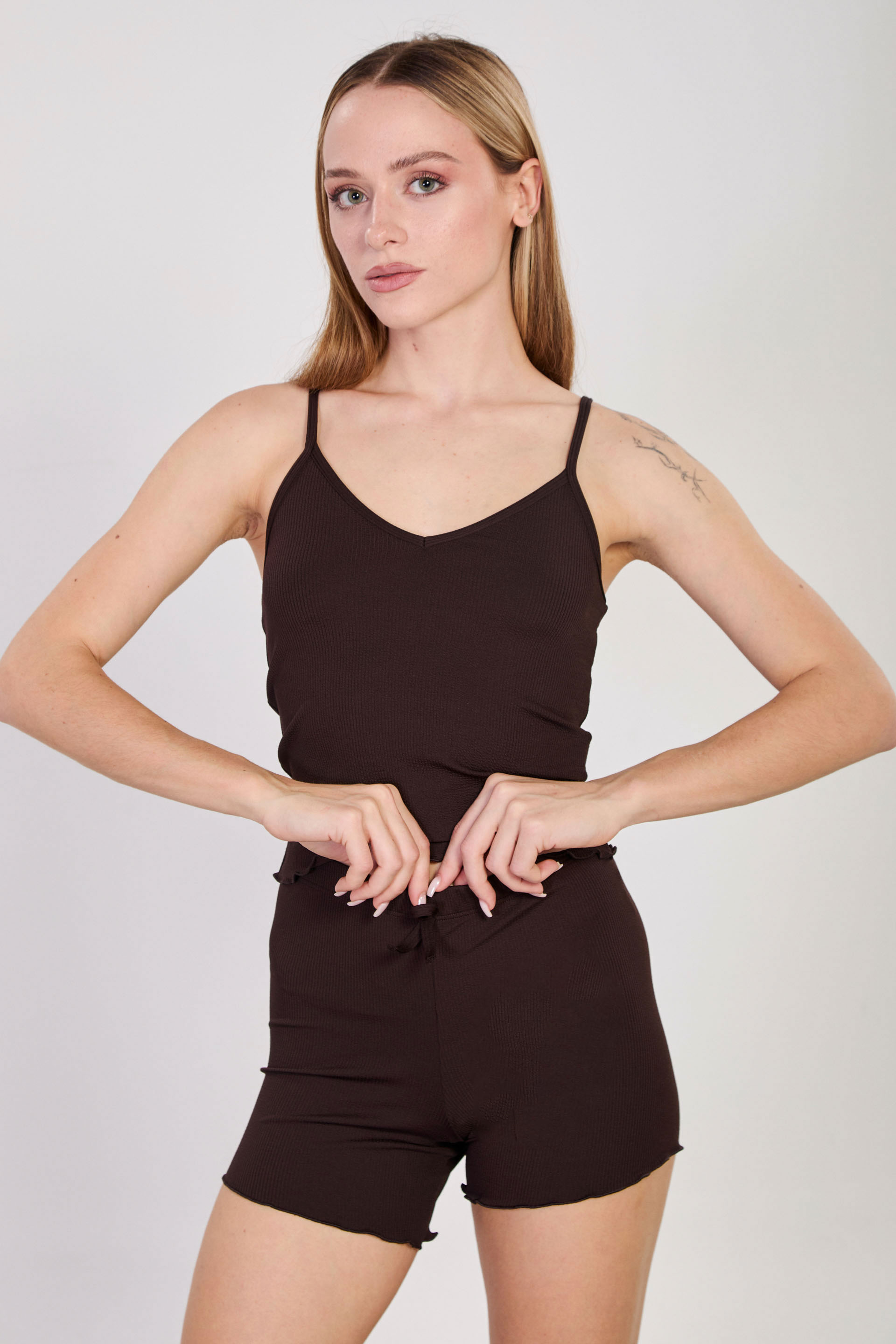 Kadın İnce Fitilli İkili Şort Takım - Acı Kahve