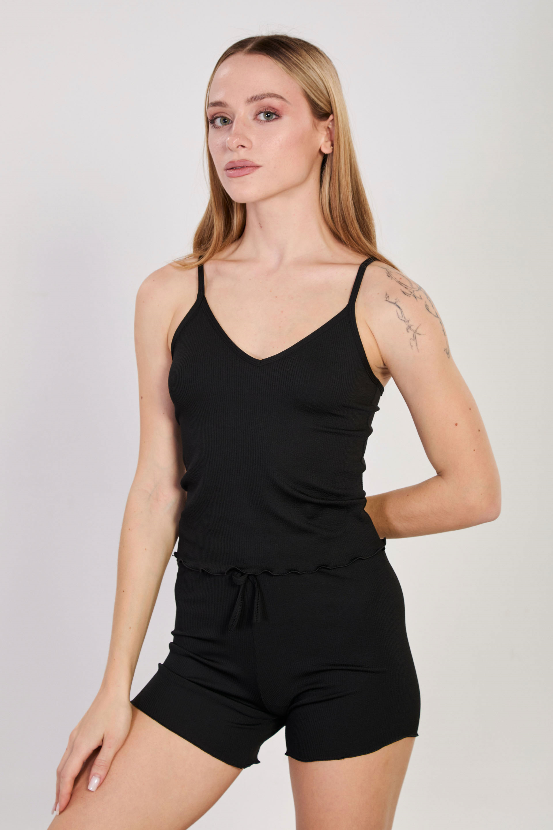 Kadın İnce Fitilli İkili Şort Takım - Siyah