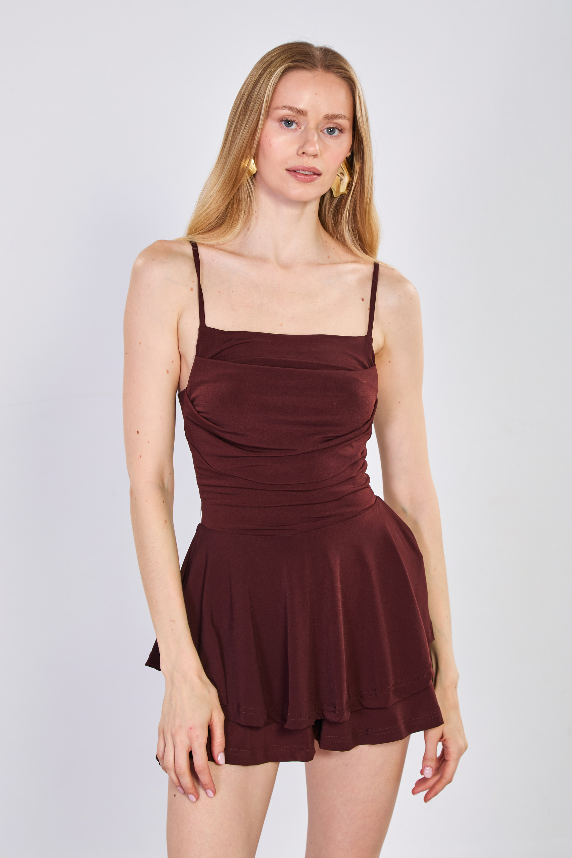 Kadın İp Askılı Şortlu Elbise - Acı Kahve