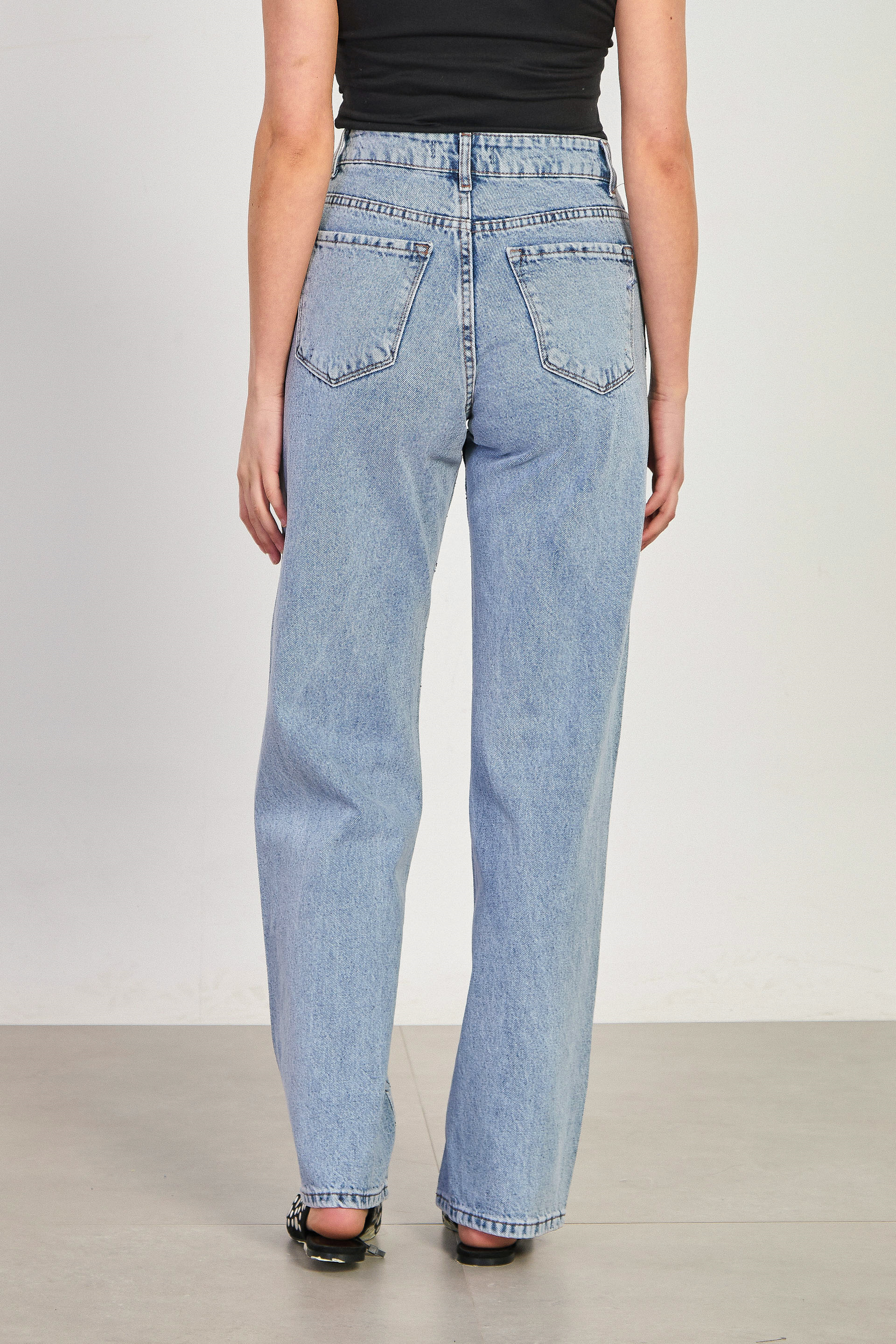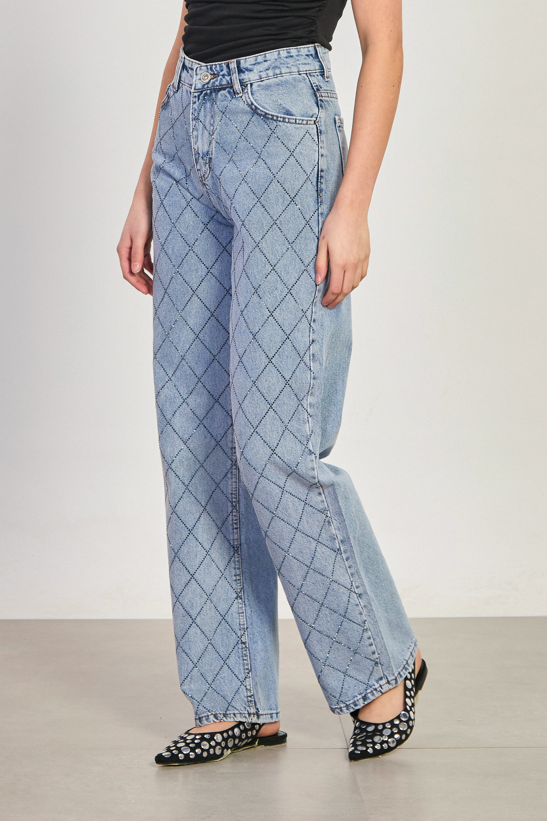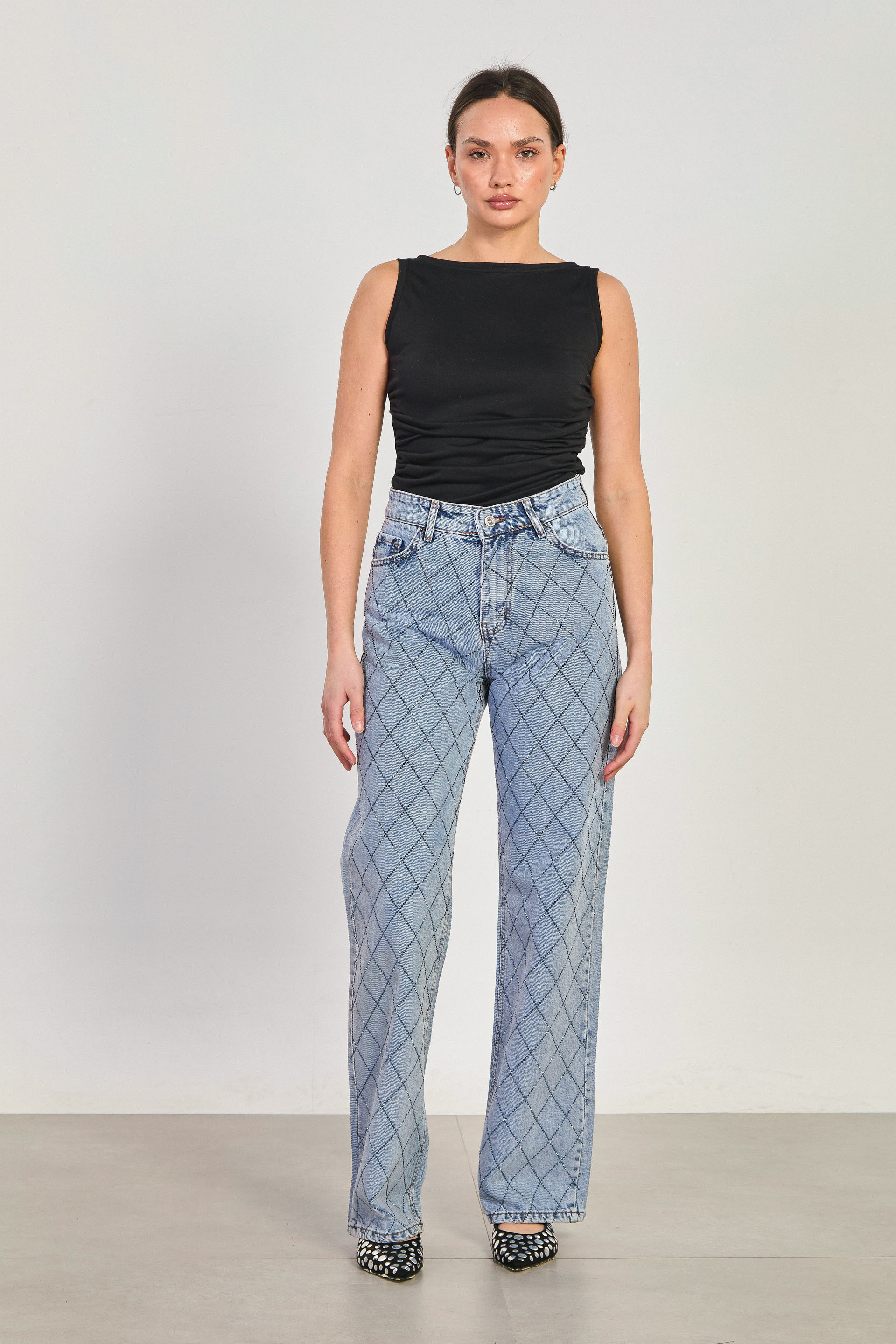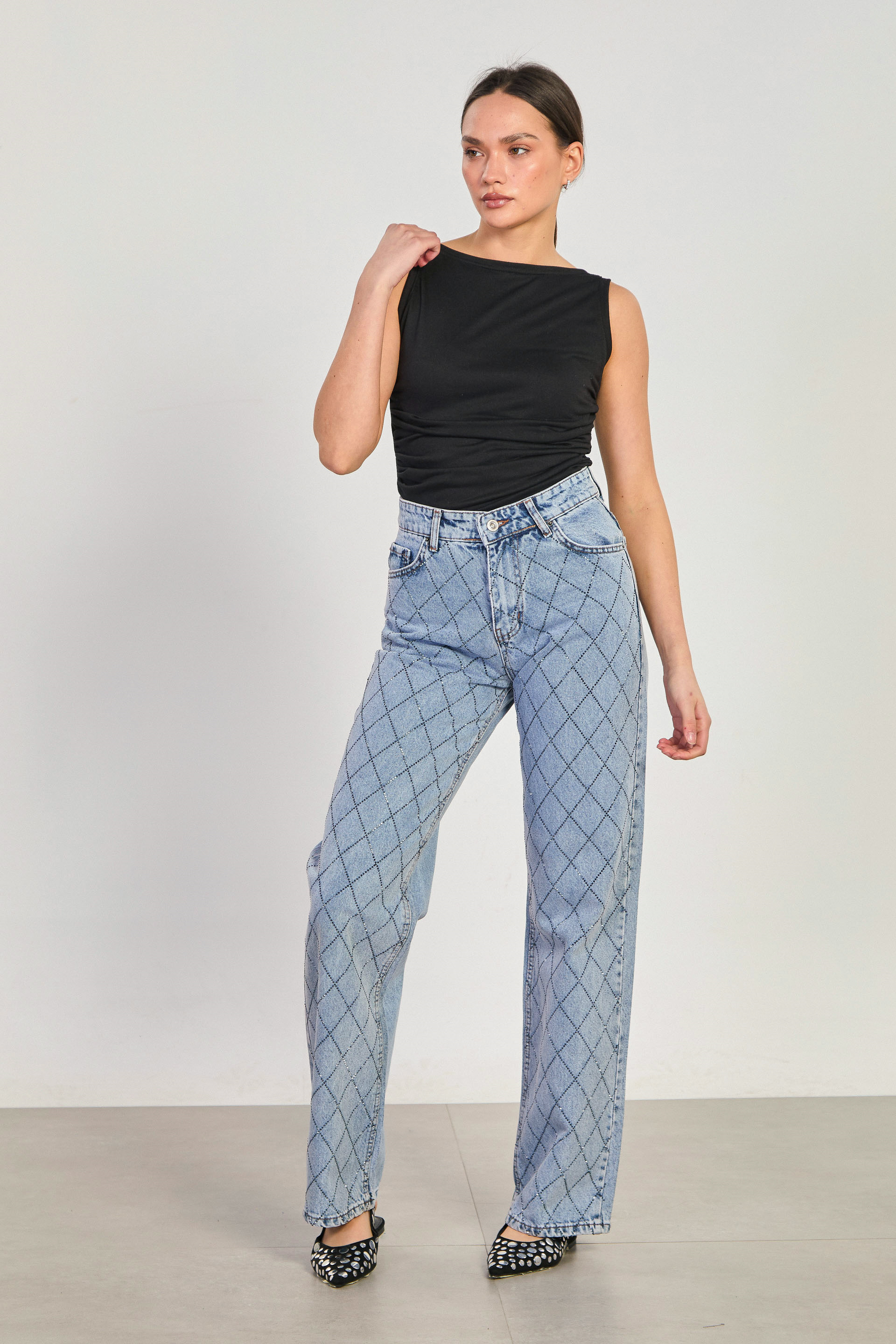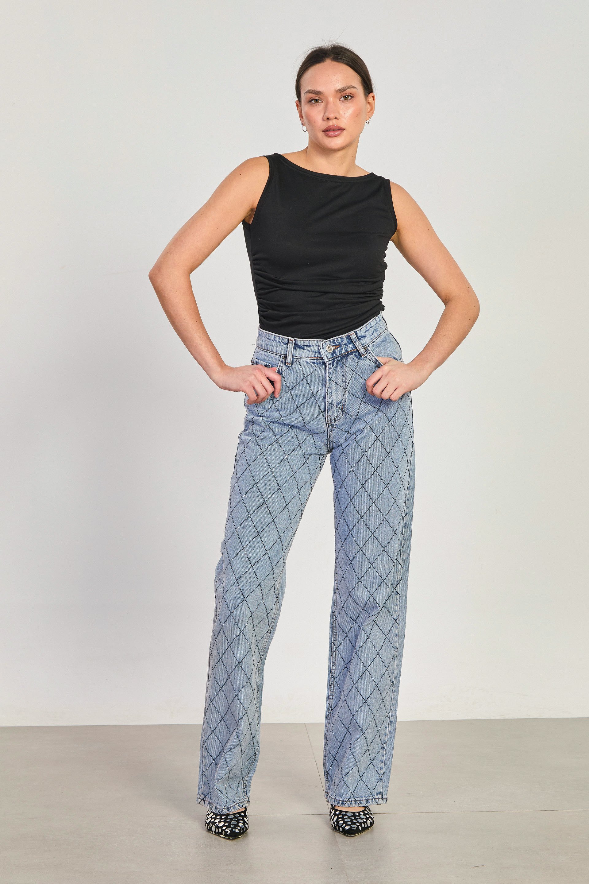 Kadın J63 Baklava Taş Baskılı Palazzo Jean Pantolon - Açık Mavi