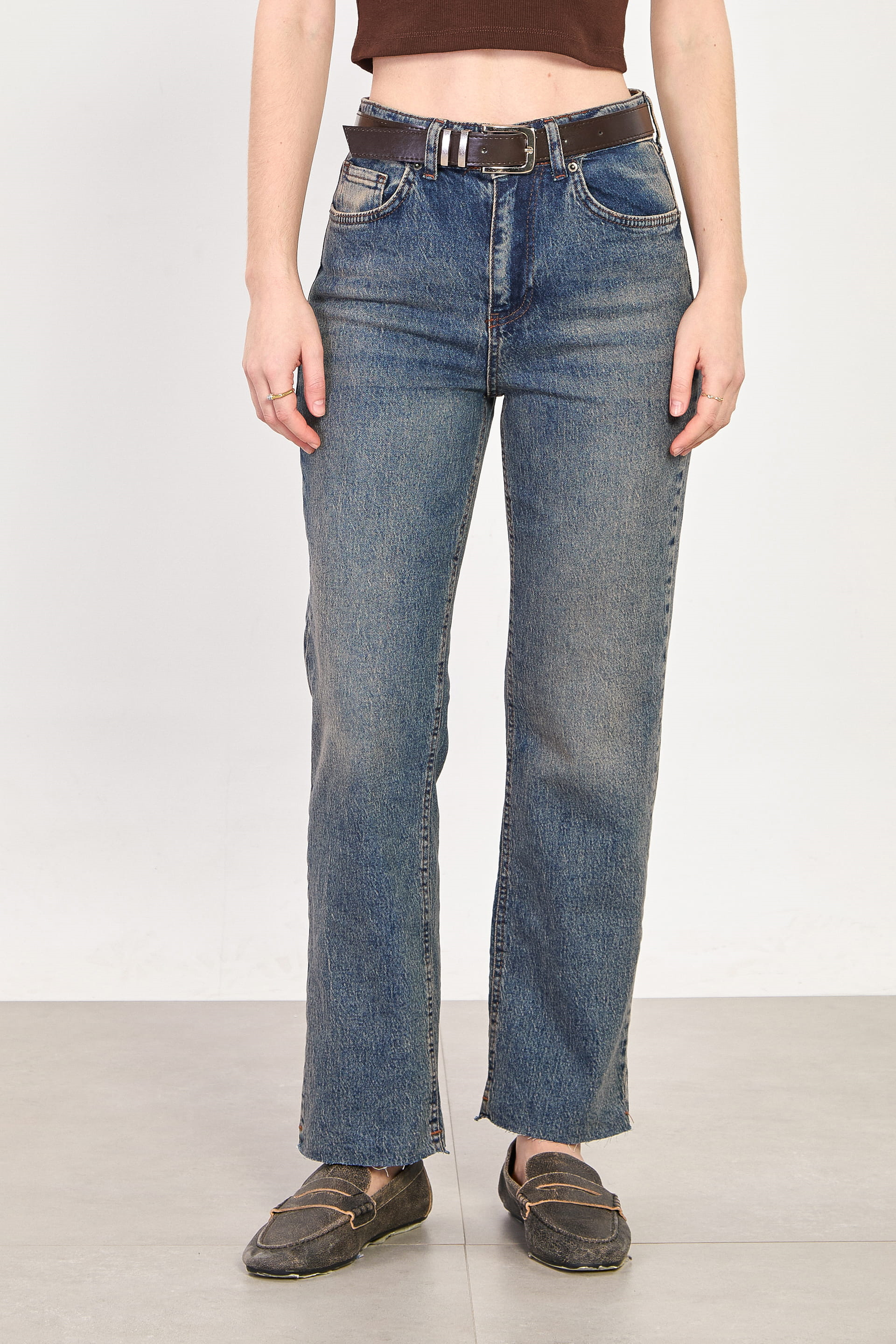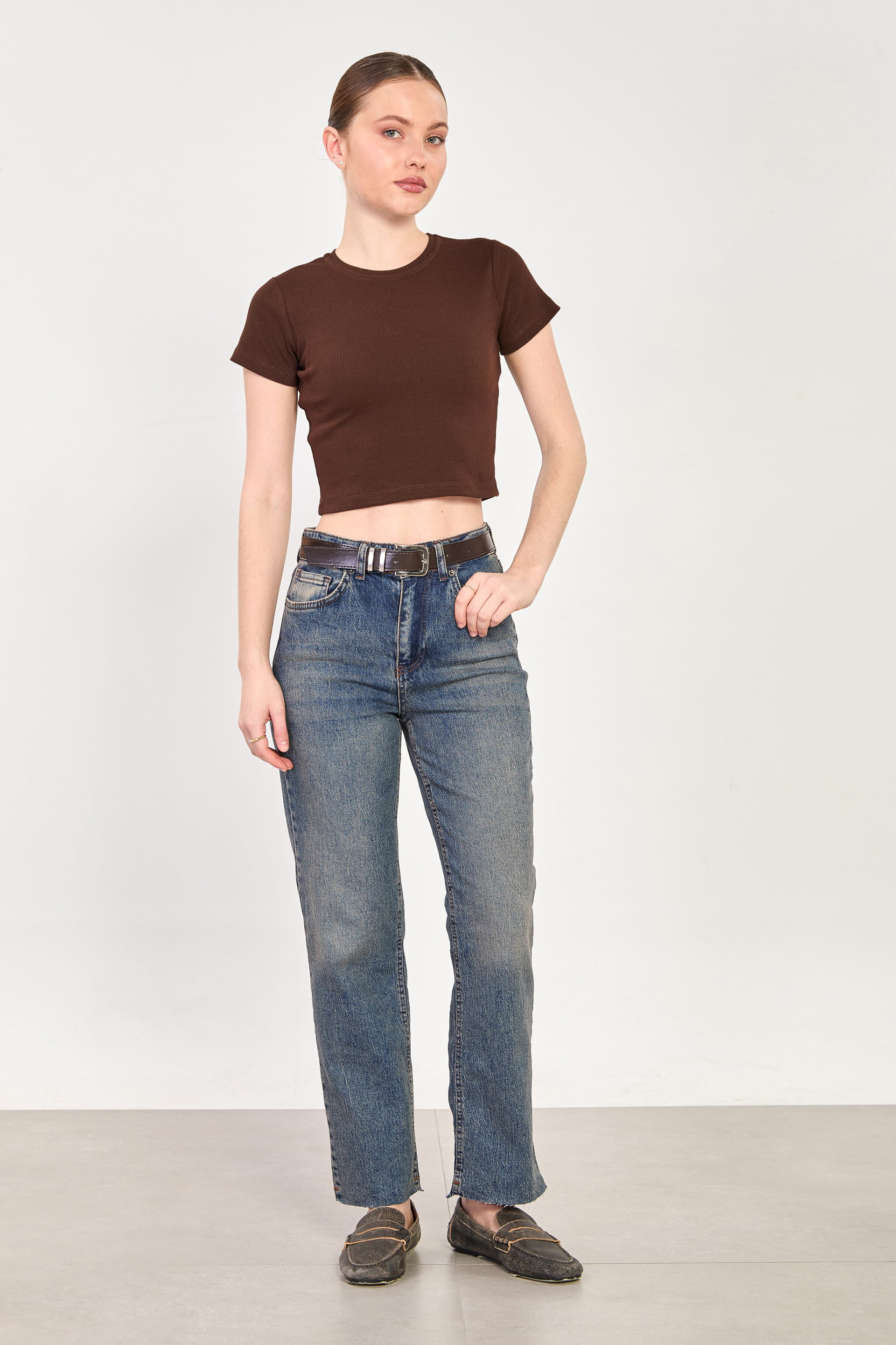Kadın J92 Kemerli Kesik Paça Straight Jean Pantolon - Kahve Tint