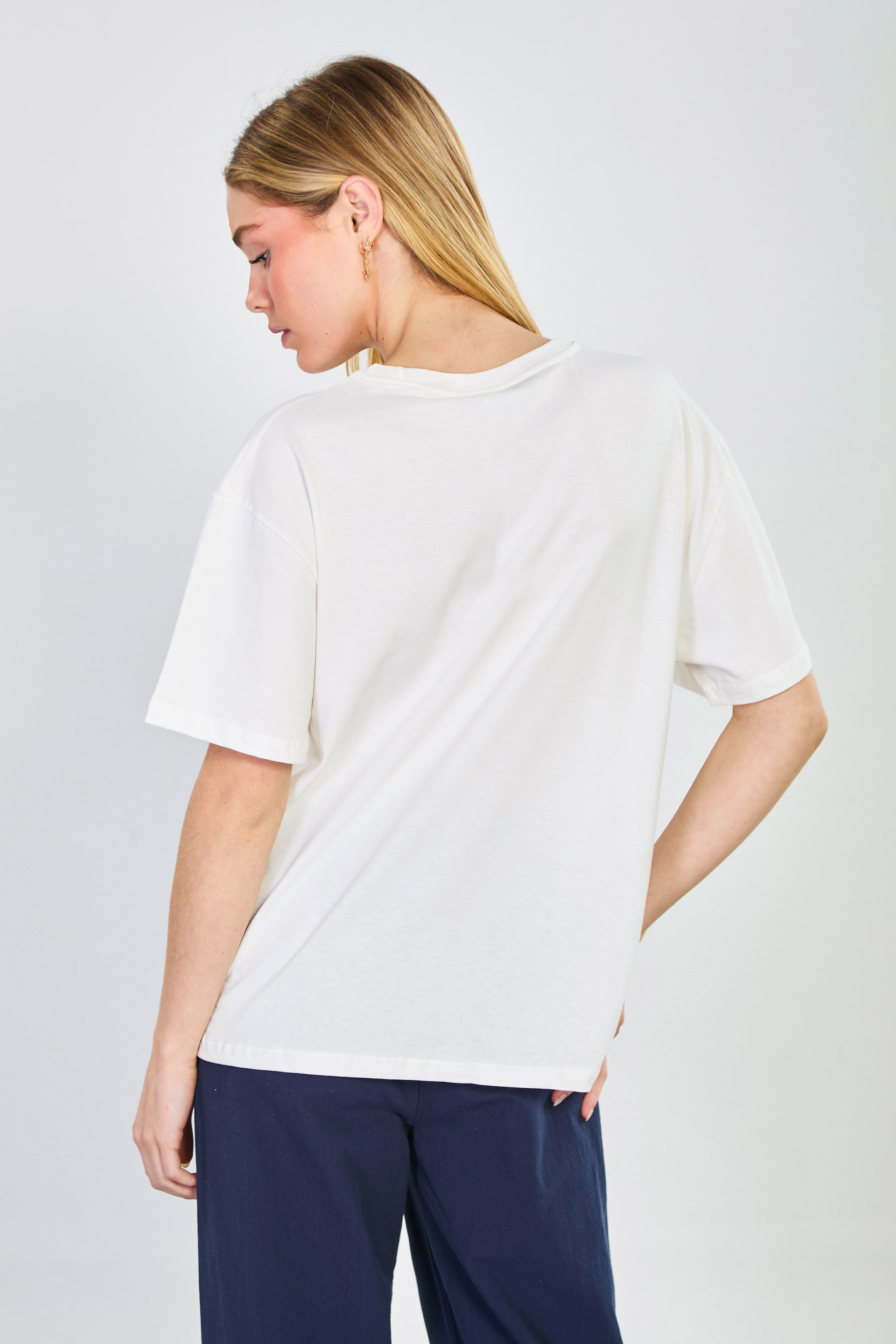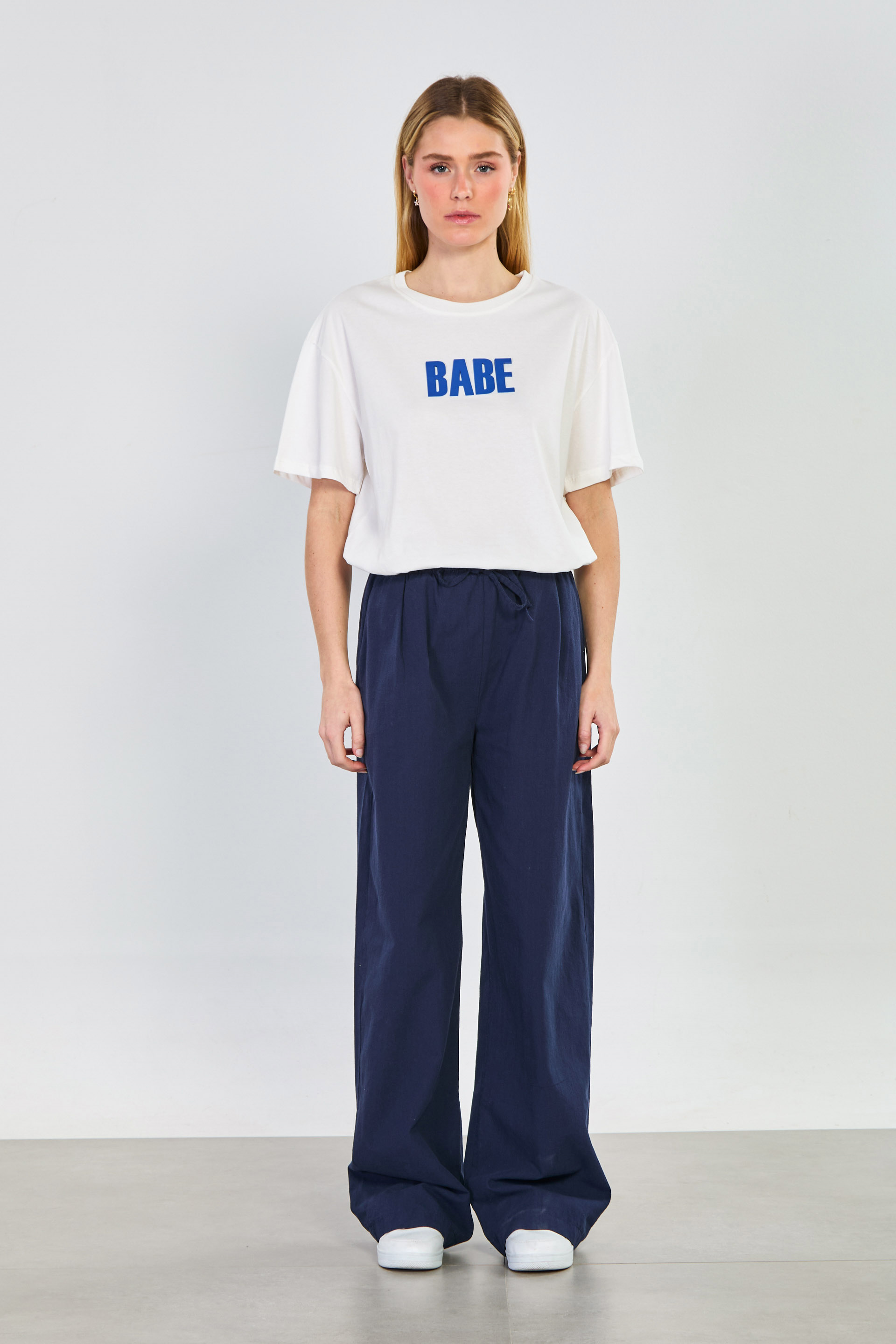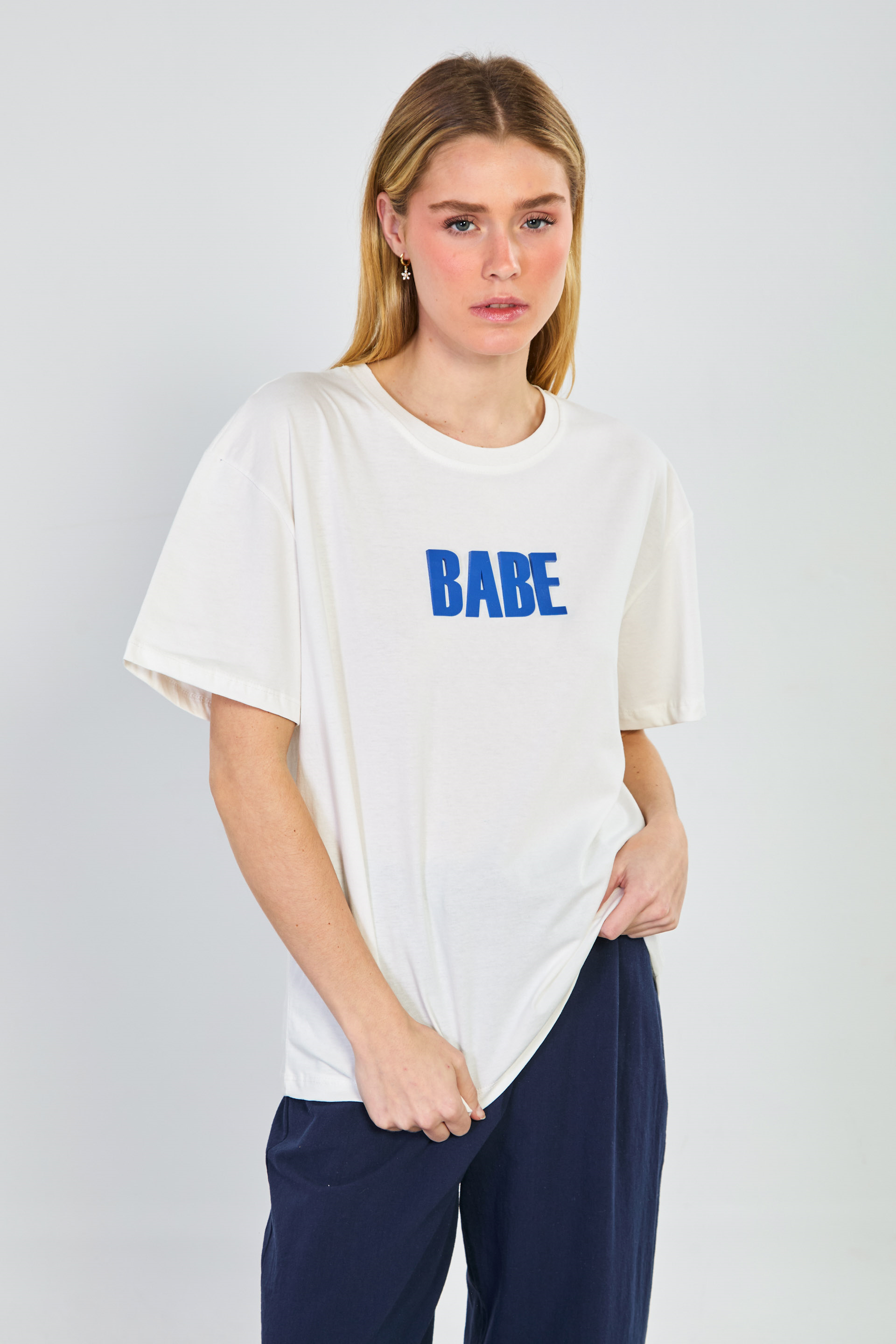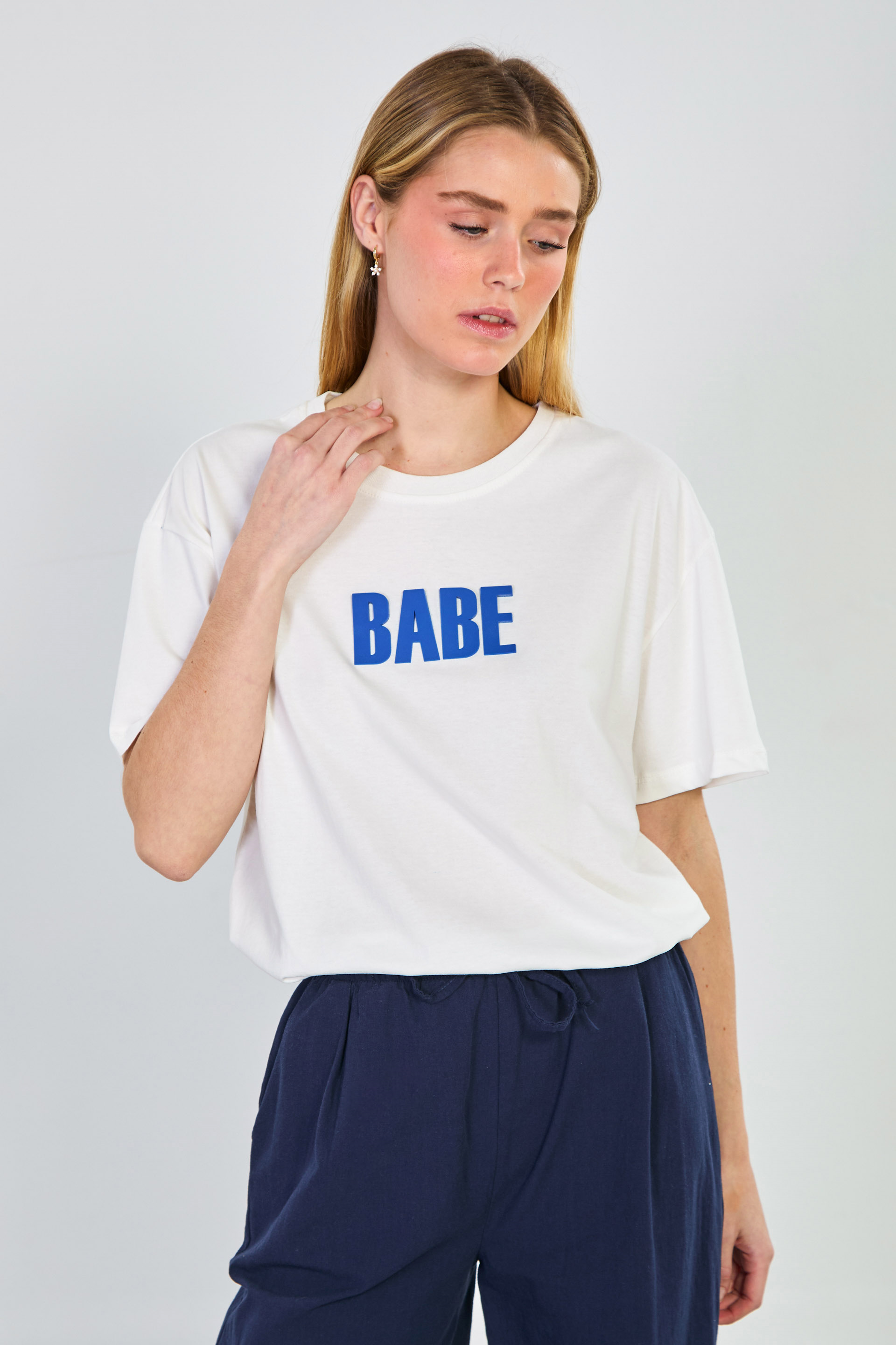 Kadın Kabartmalı Babe Yazılı T-Shirt - Beyaz/Mavi