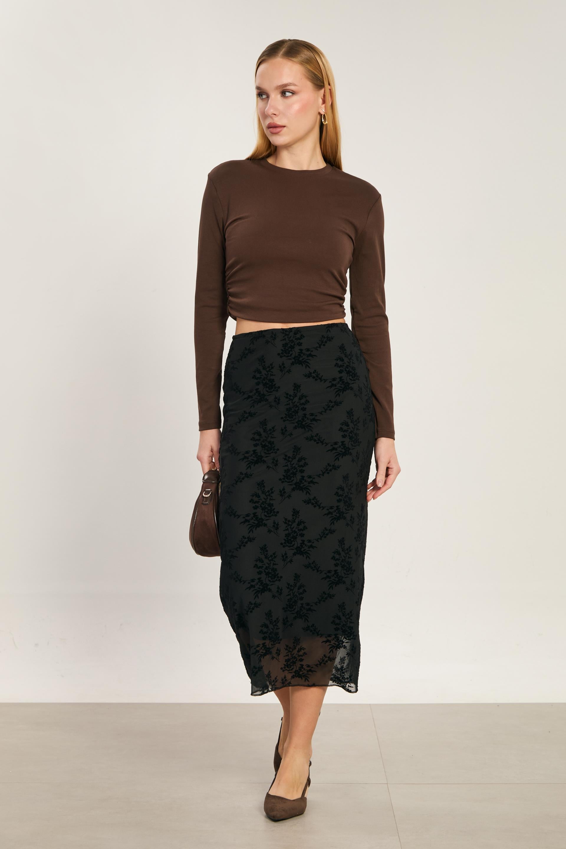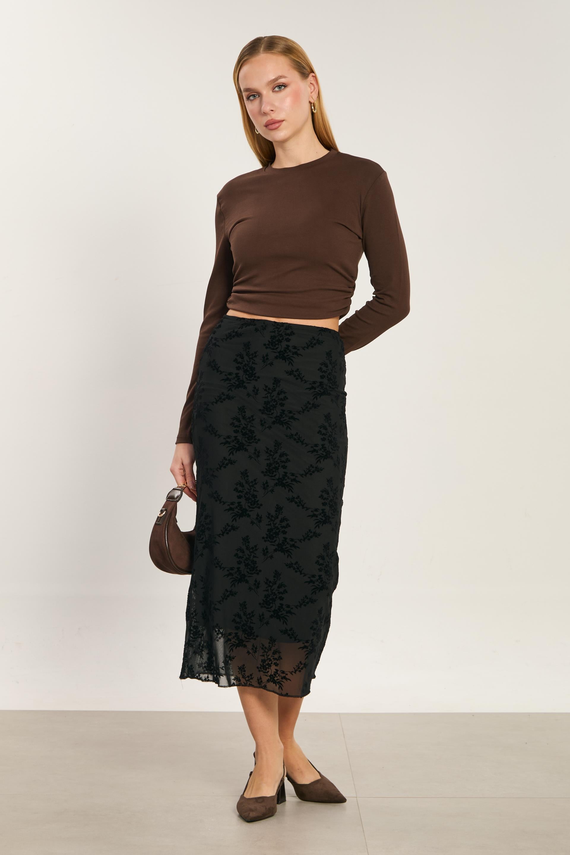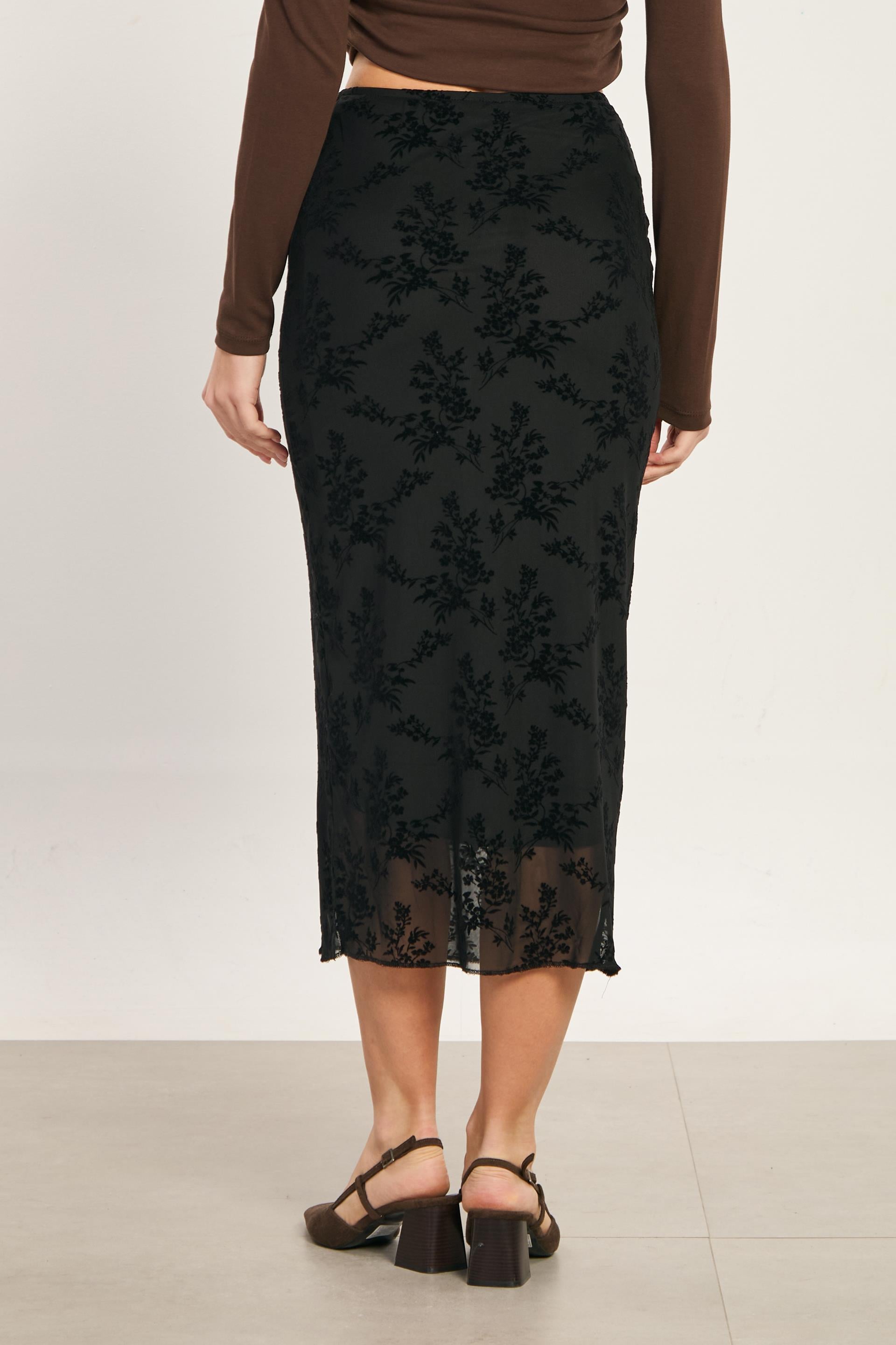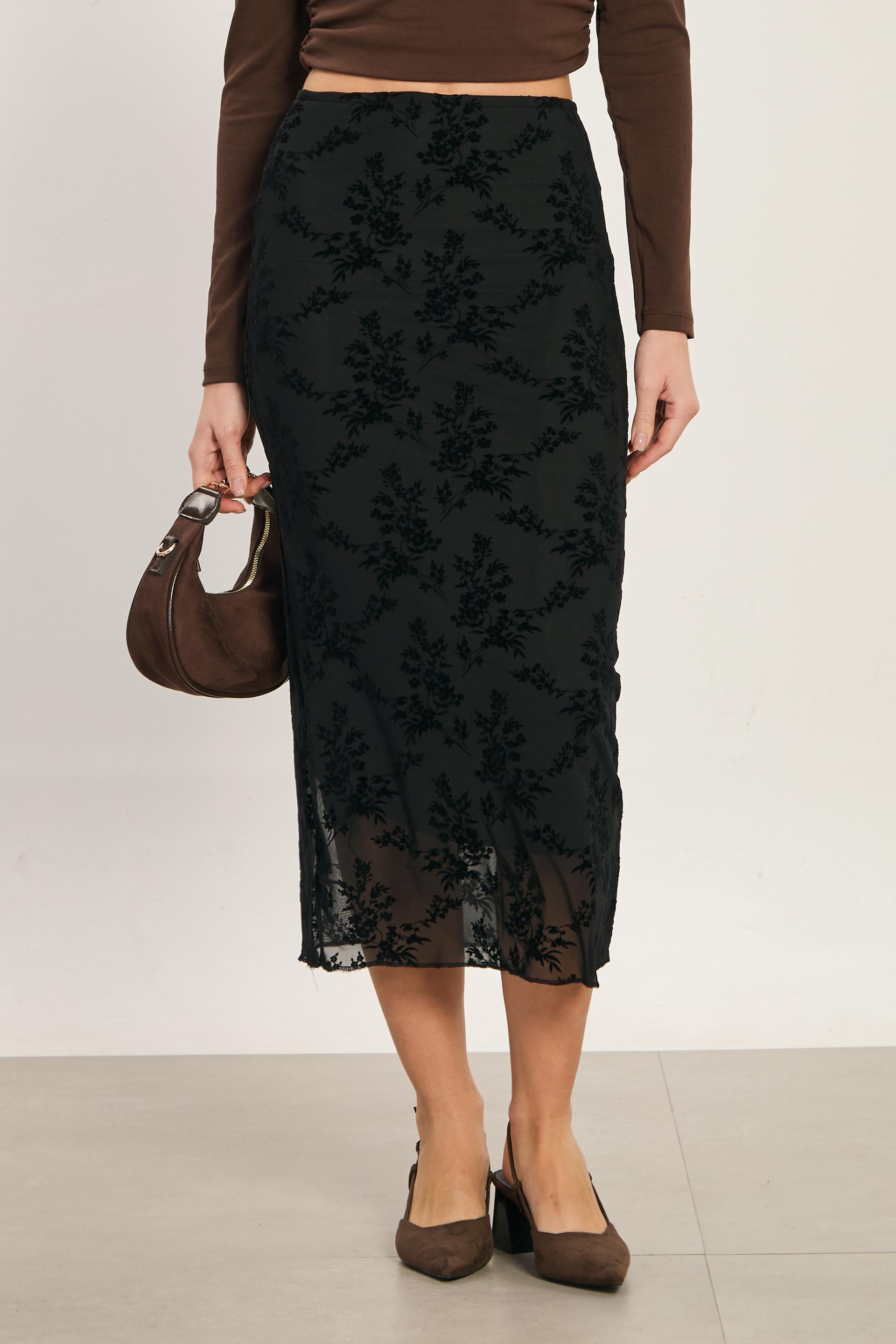 Kadın Kadife Çiçek Desenli Kalem Etek - Siyah